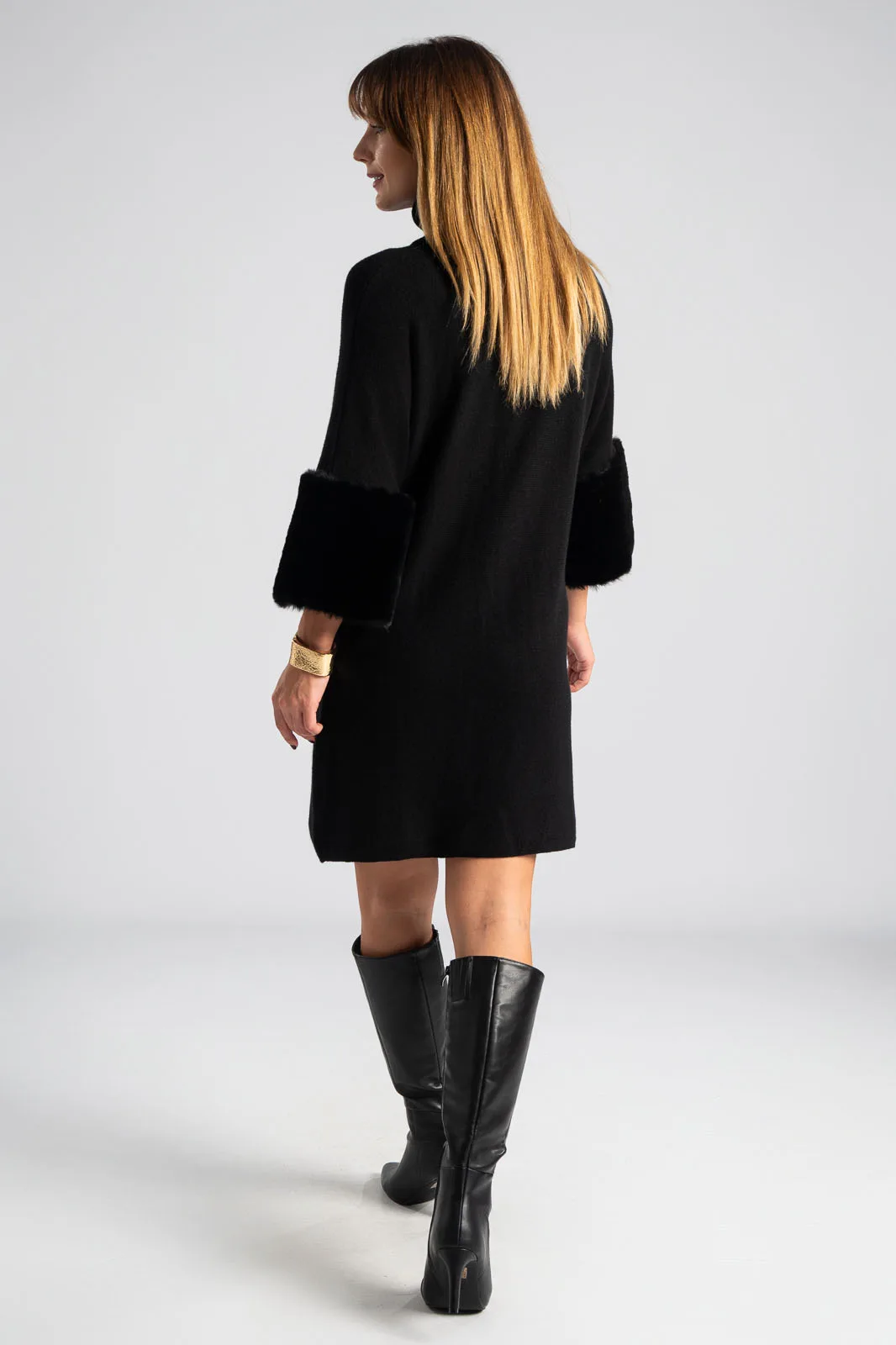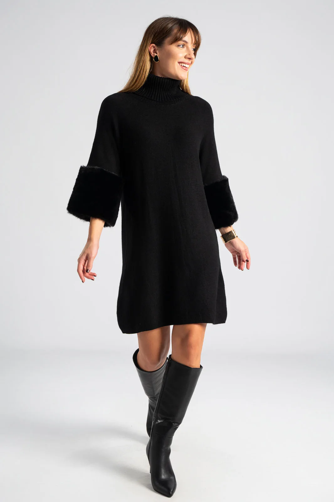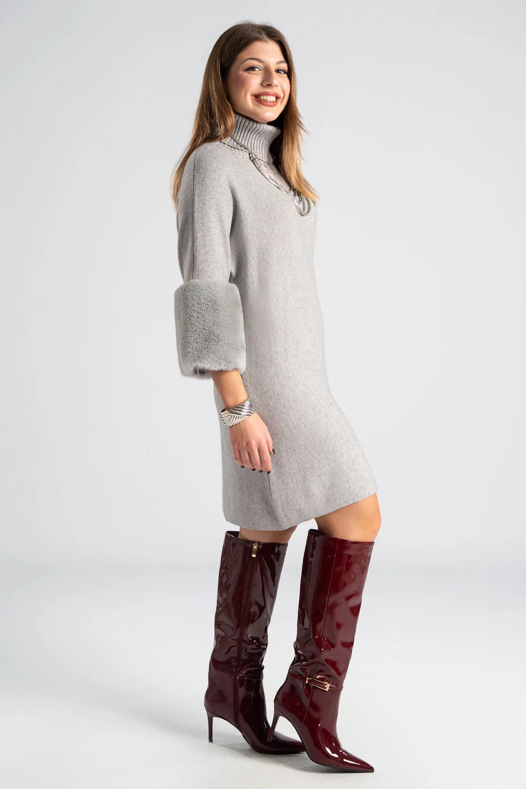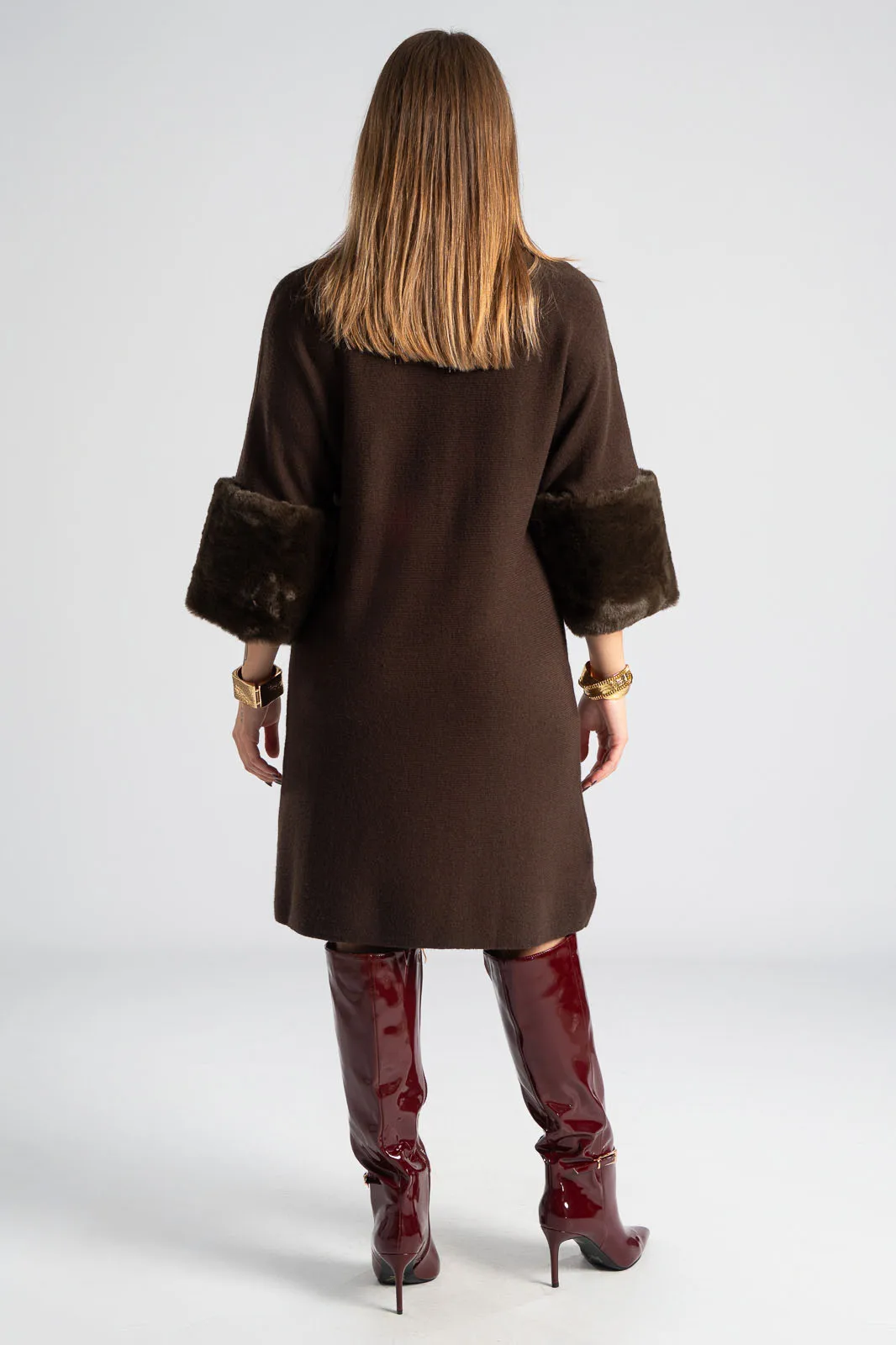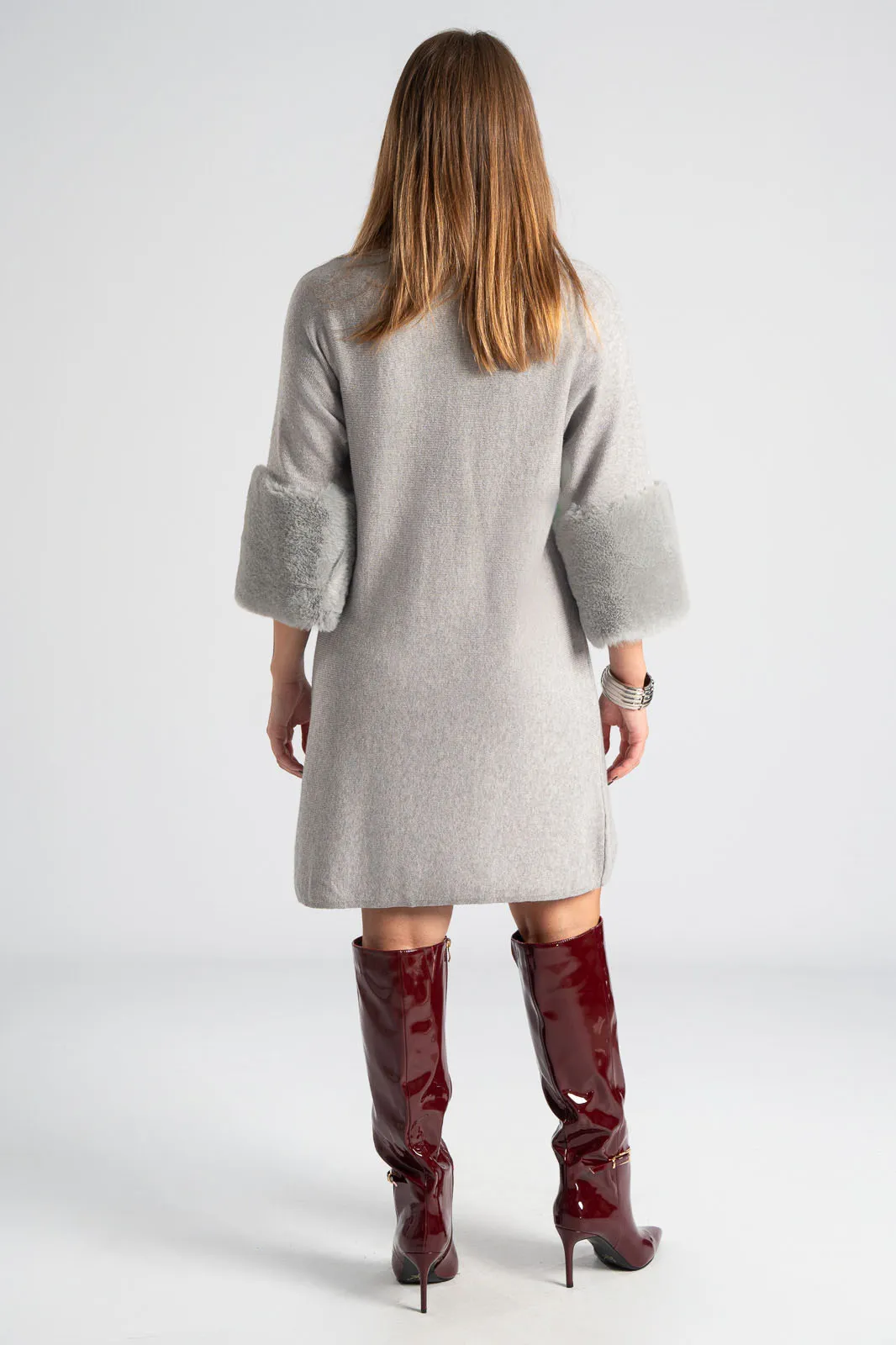 Φόρεμα νημάτινο με ζιβάγκο. Έχει 3/4 μανίκια που καταλήγουν σε έντονη συνθετική γούνα στην ίδια απόχρωση. Οι μετρήσεις του πίνακα είναι αντιπροσωπευτικές για κάθε προϊόν. 28% polyester, 50% viscose, 22% polyamide.