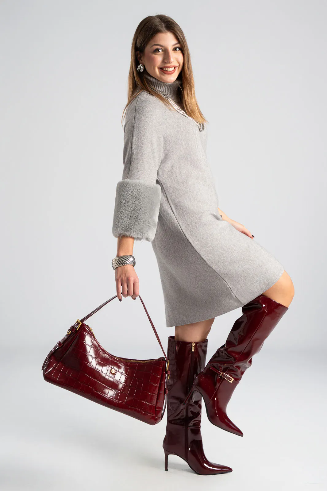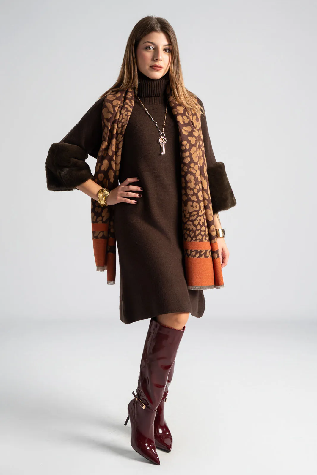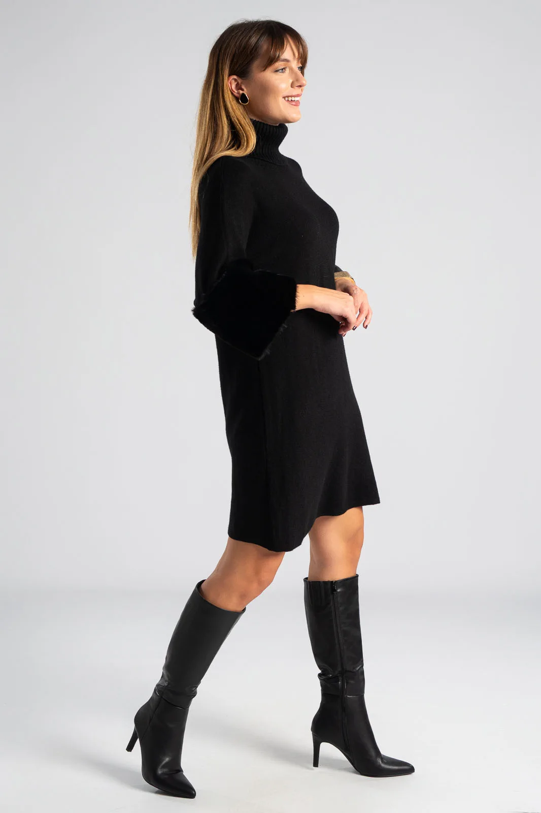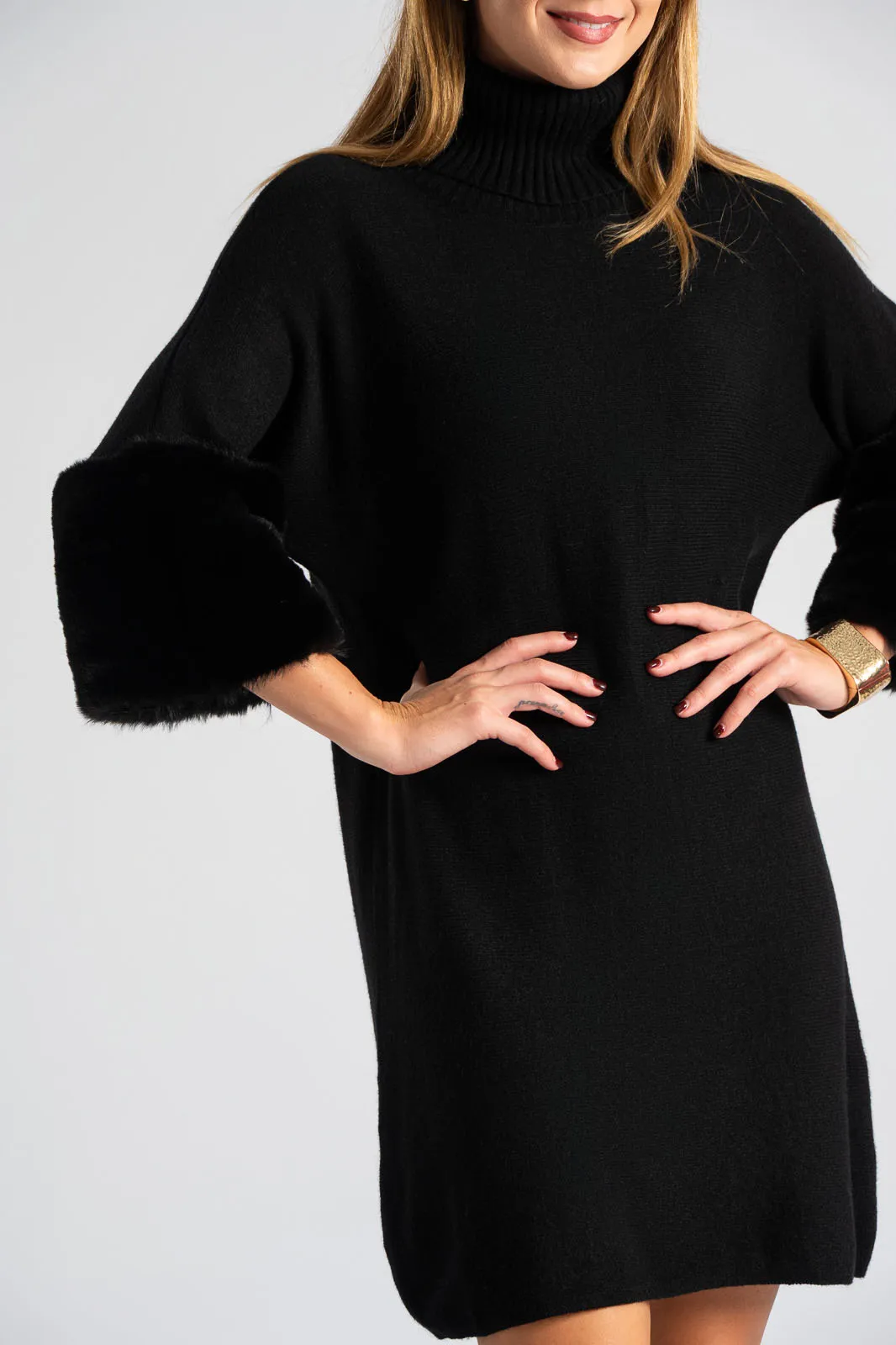 Φόρεμα νημάτινο με ζιβάγκο. Έχει 3/4 μανίκια που καταλήγουν σε έντονη συνθετική γούνα στην ίδια απόχρωση. Οι μετρήσεις του πίνακα είναι αντιπροσωπευτικές για κάθε προϊόν. 28% polyester, 50% viscose, 22% polyamide.