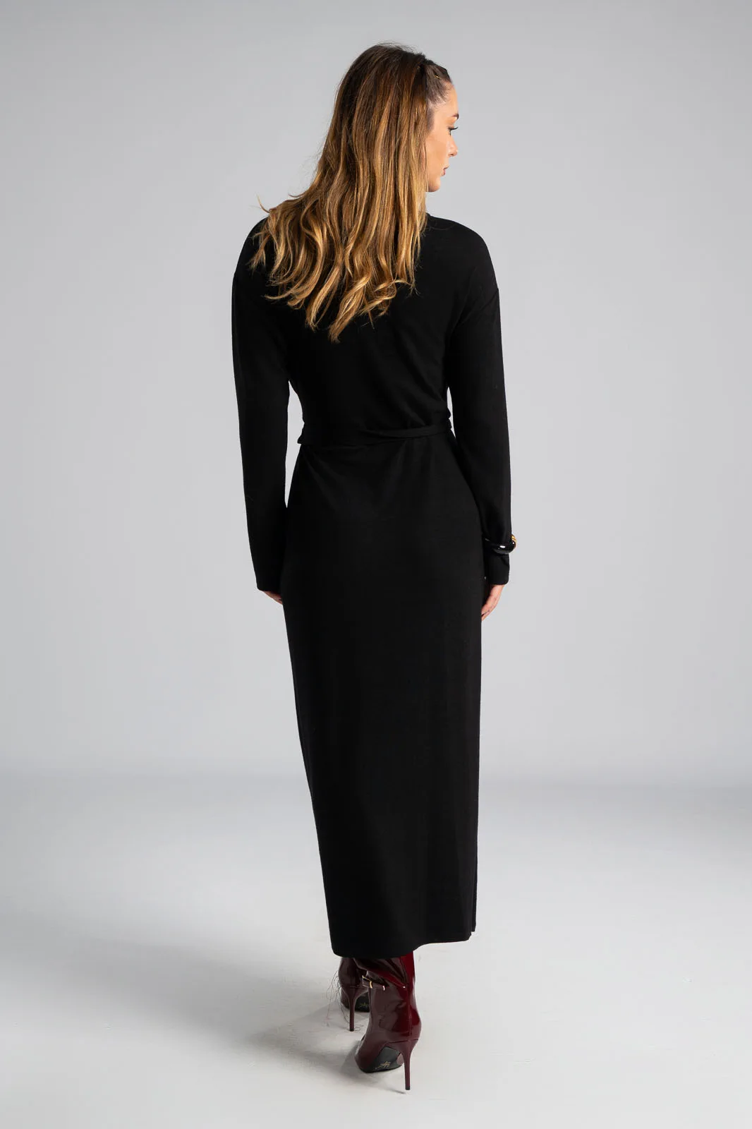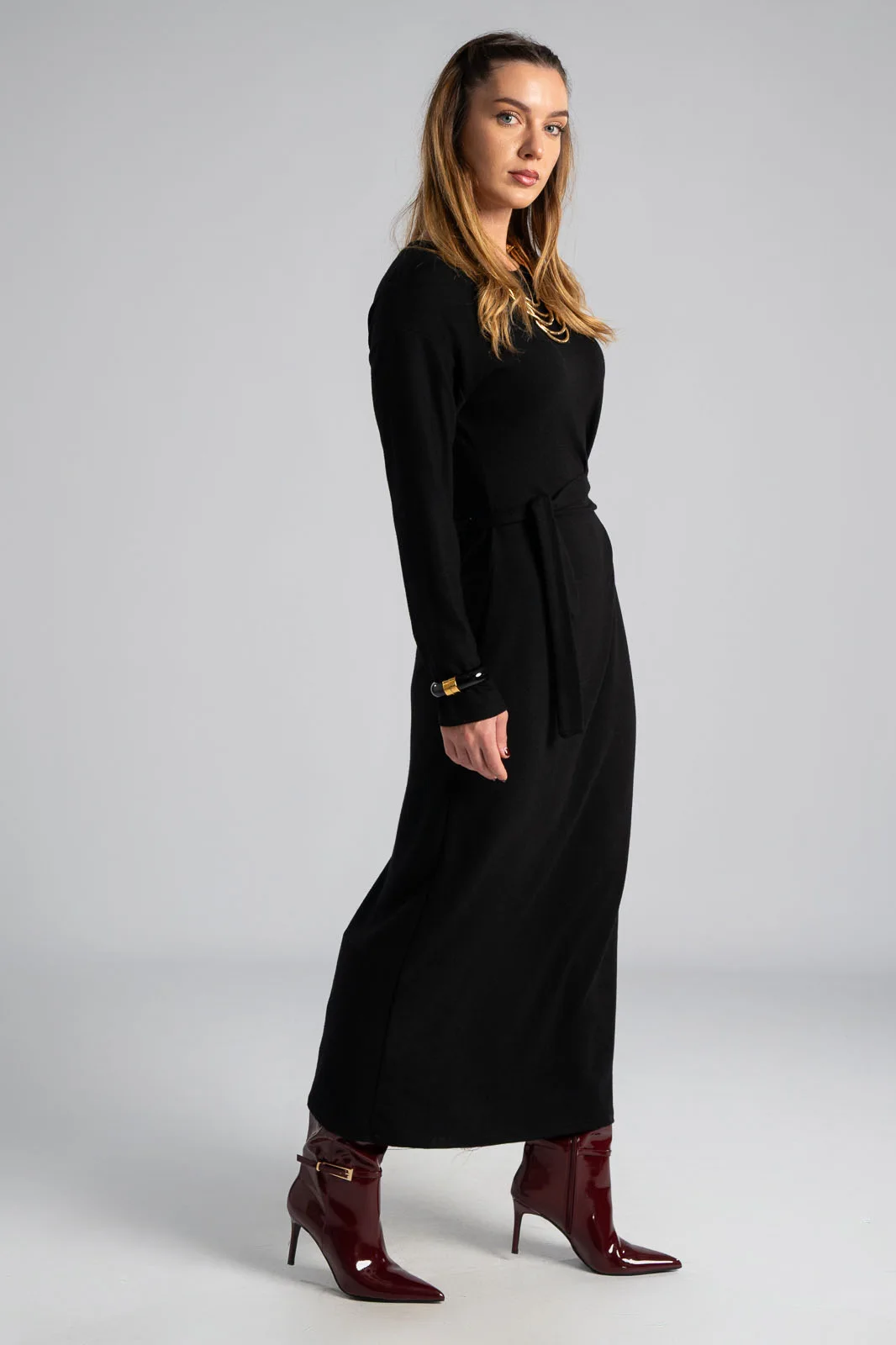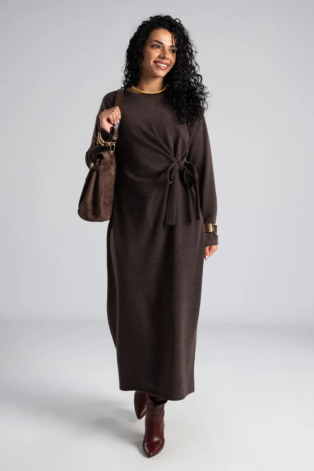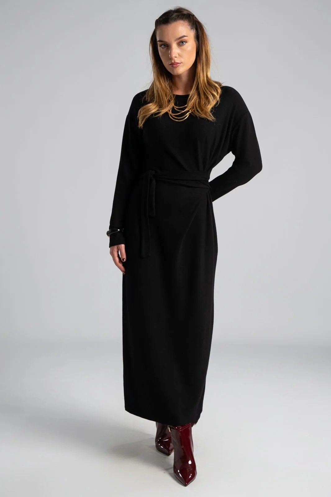Φόρεμα νημάτινο με συμπαγή πλέξη. Έχει στρογγυλή λαιμόκοψη και μακριά μανίκια. Είναι maxi. Στο πλαινό της μέσης διαθέτει δέσιμο με κορδόνια στην ίδια απόχρωση και υφή. Οι μετρήσεις του πίνακα είναι αντιπροσωπευτικές για κάθε κωδικό. 69% polyester, 28% viscose, 3% elastan.