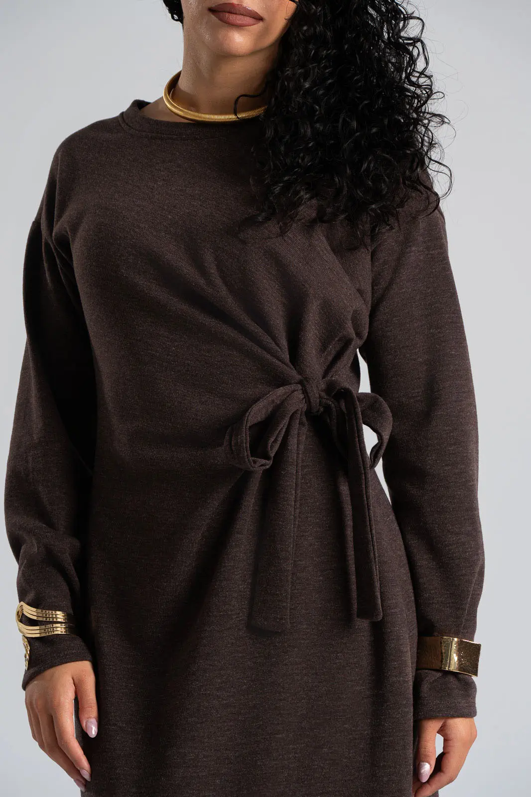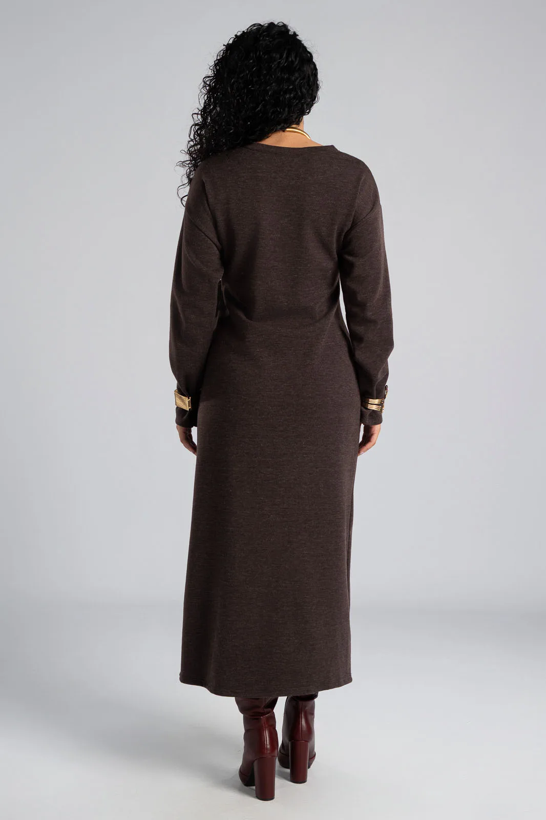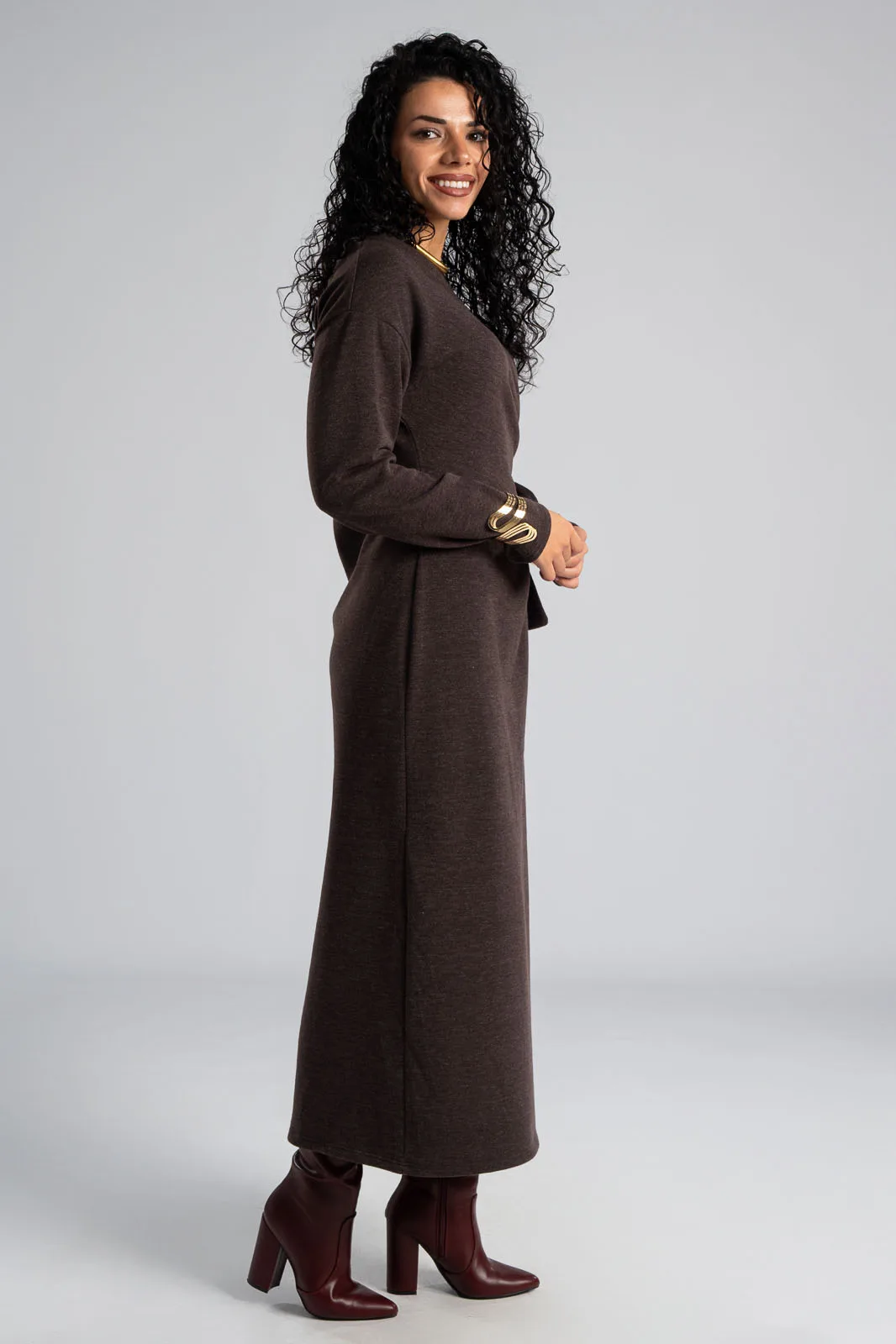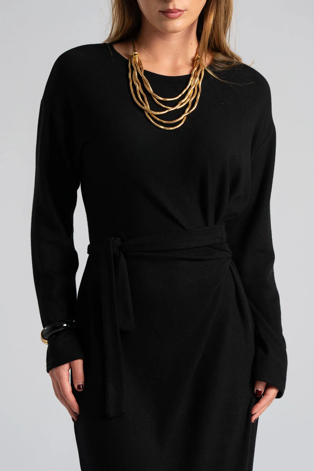 Φόρεμα νημάτινο με συμπαγή πλέξη. Έχει στρογγυλή λαιμόκοψη και μακριά μανίκια. Είναι maxi. Στο πλαινό της μέσης διαθέτει δέσιμο με κορδόνια στην ίδια απόχρωση και υφή. Οι μετρήσεις του πίνακα είναι αντιπροσωπευτικές για κάθε κωδικό. 69% polyester, 28% viscose, 3% elastan.