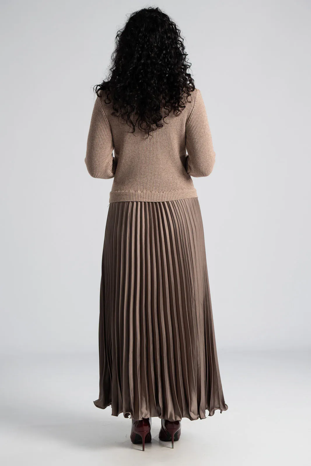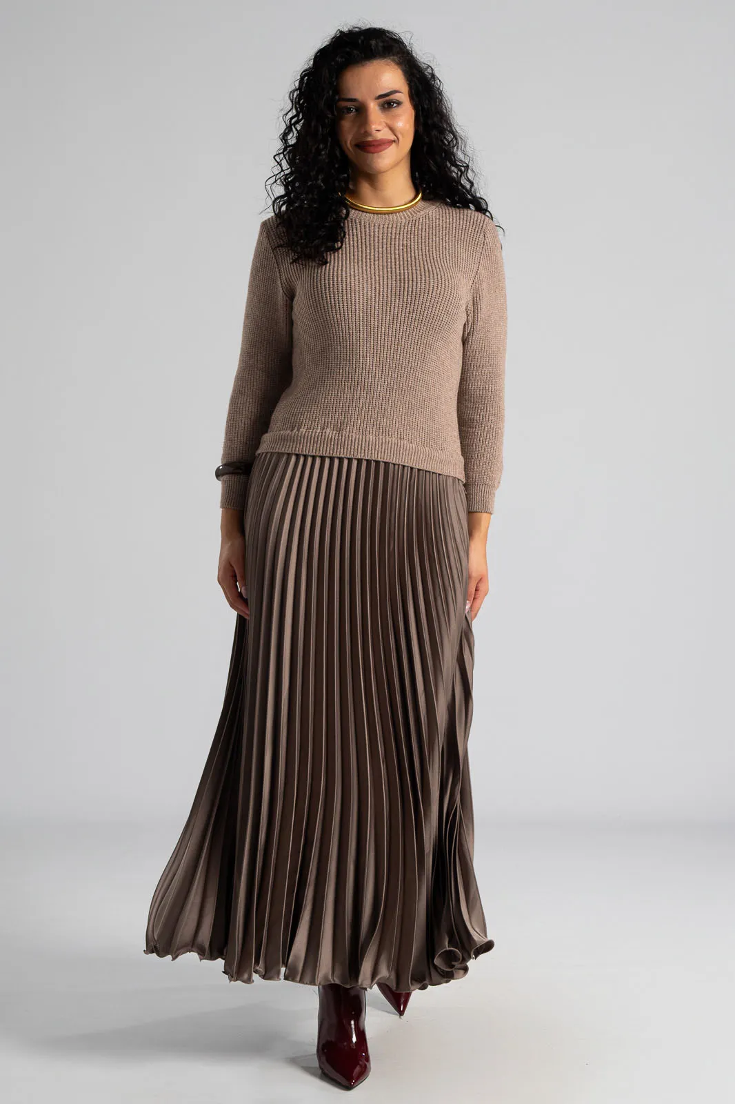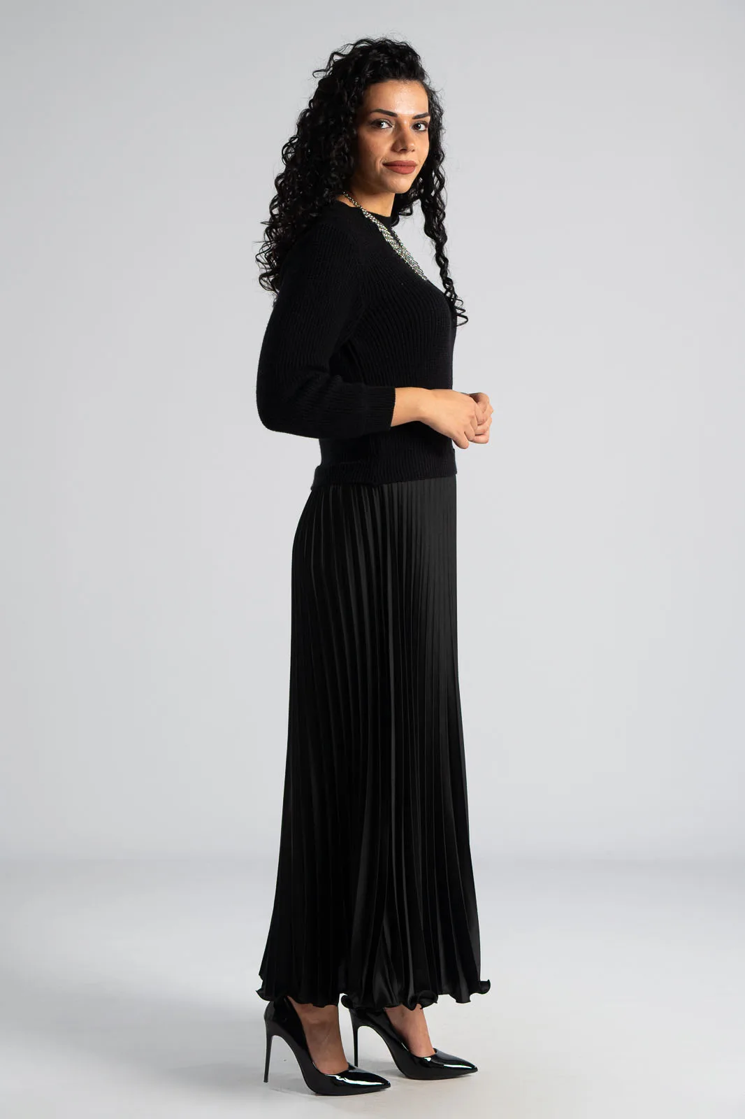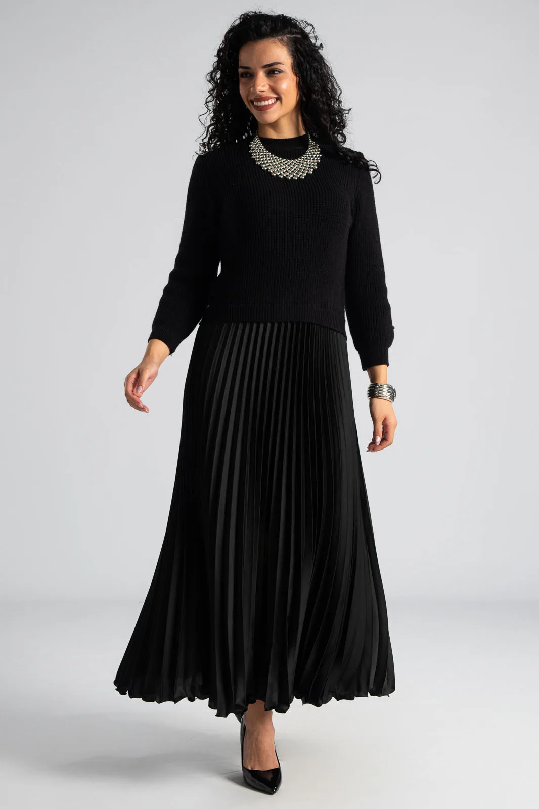 Φόρεμα που αποτελείται από δύο διαφορετικές συνθέσεις. Το επάνω μέρος είναι σε ύφος πουλόβερ πλεκτό με στρογγυλή λαιμόκοψη. Έχει μακριά μανίκια. Στο κάτω μέρος είναι φούστα πλισέ με σατέν υφή. Είναι maxi. Οι μετρήσεις του πίνακα είναι αντιπροσωπευτικές για κάθε προϊόν. 52% viscose, 26% polyester, 22% elestan.