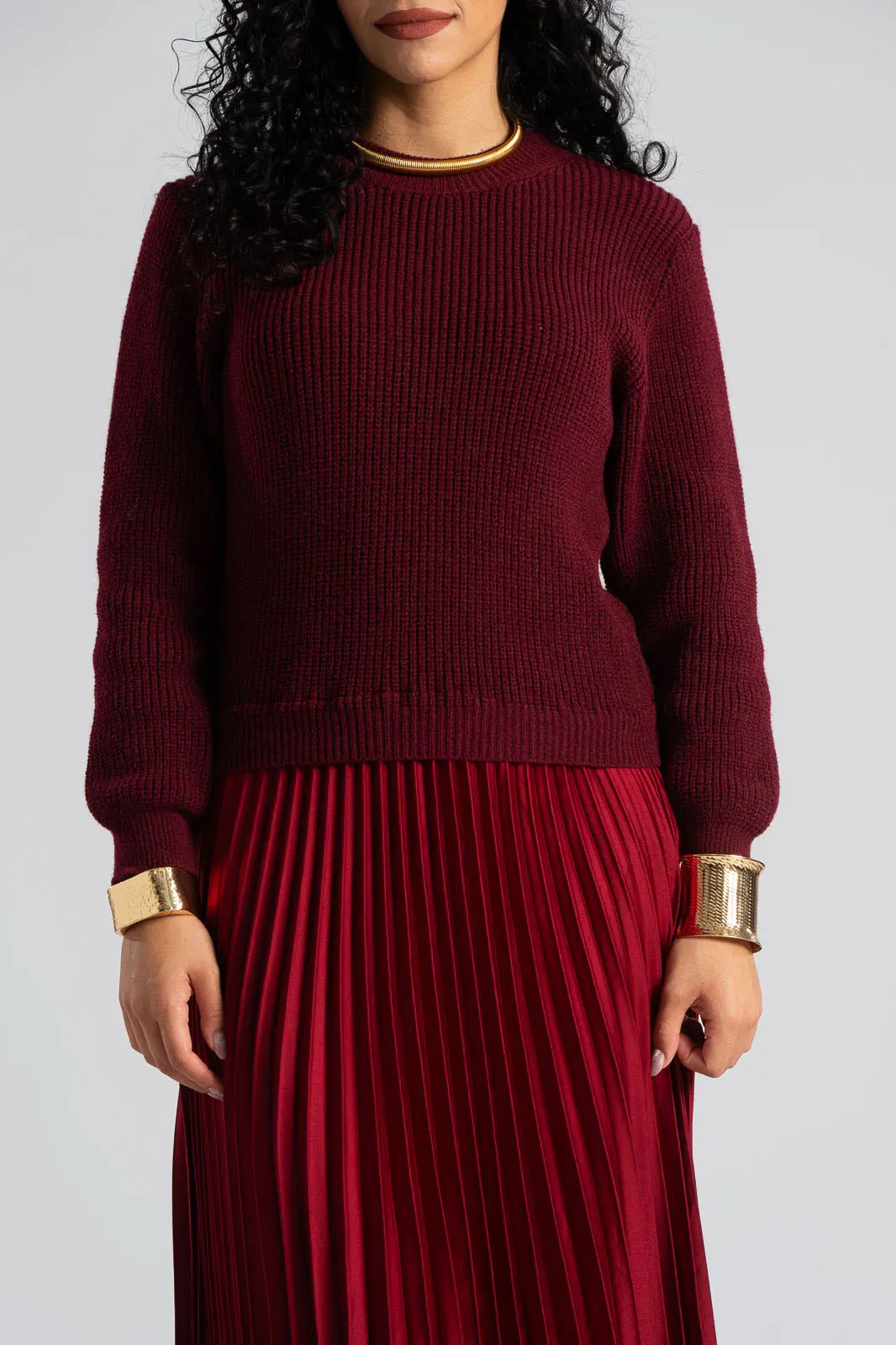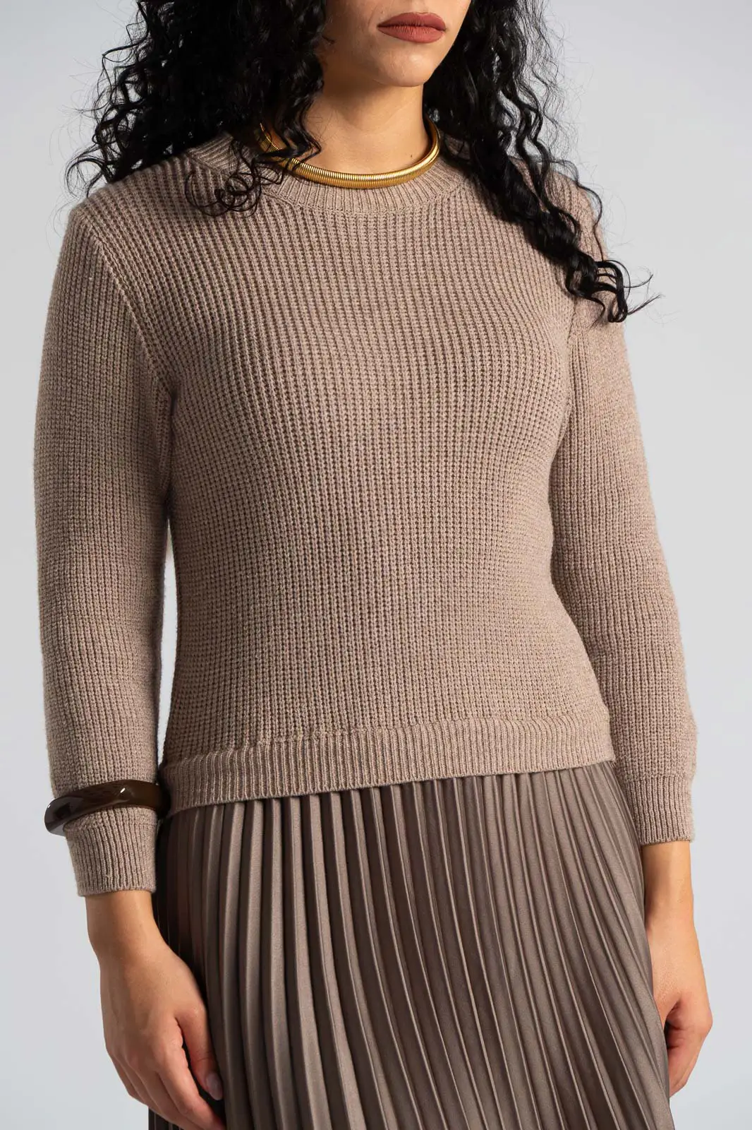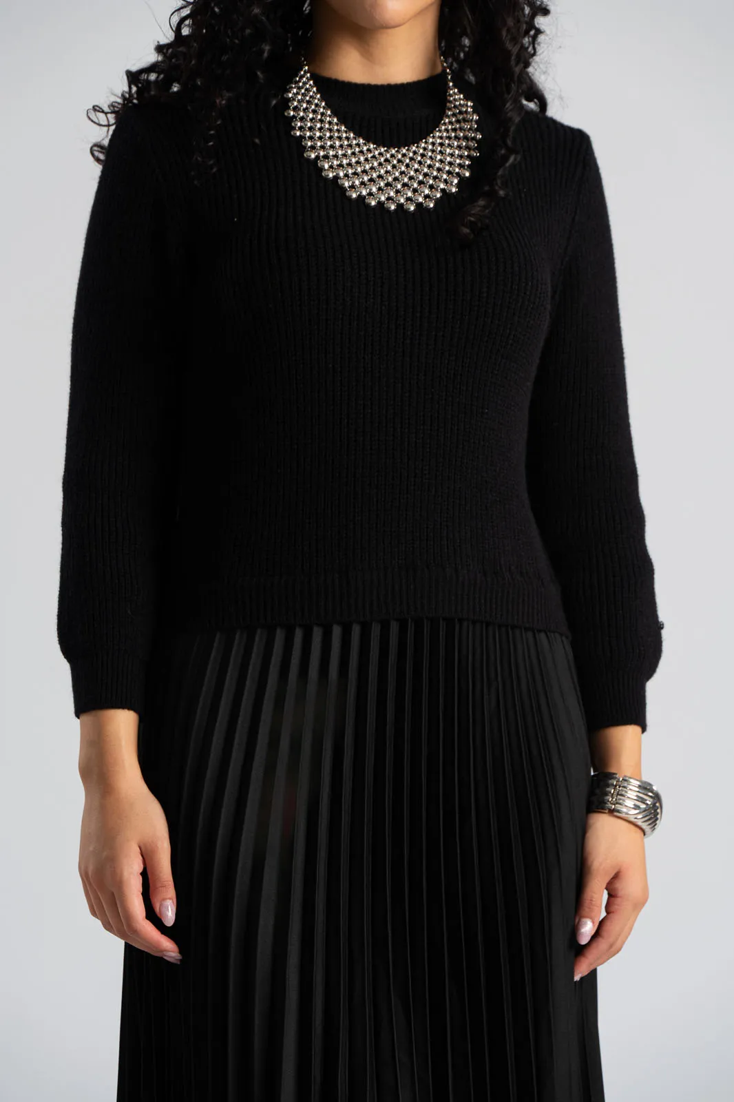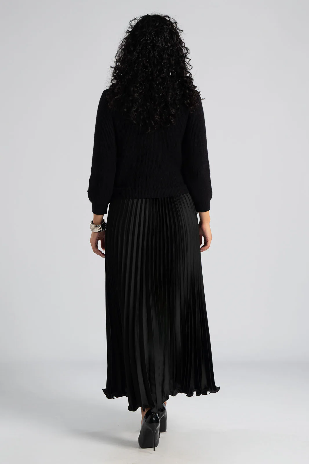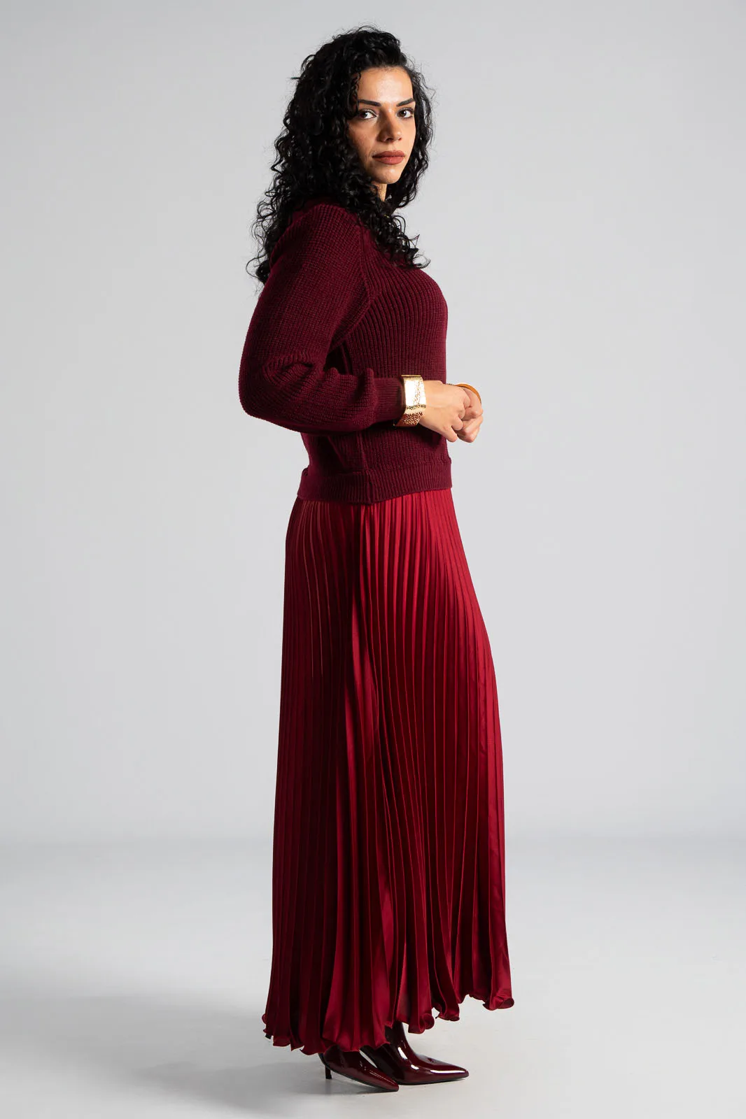 Φόρεμα που αποτελείται από δύο διαφορετικές συνθέσεις. Το επάνω μέρος είναι σε ύφος πουλόβερ πλεκτό με στρογγυλή λαιμόκοψη. Έχει μακριά μανίκια. Στο κάτω μέρος είναι φούστα πλισέ με σατέν υφή. Είναι maxi. Οι μετρήσεις του πίνακα είναι αντιπροσωπευτικές για κάθε προϊόν. 52% viscose, 26% polyester, 22% elestan.