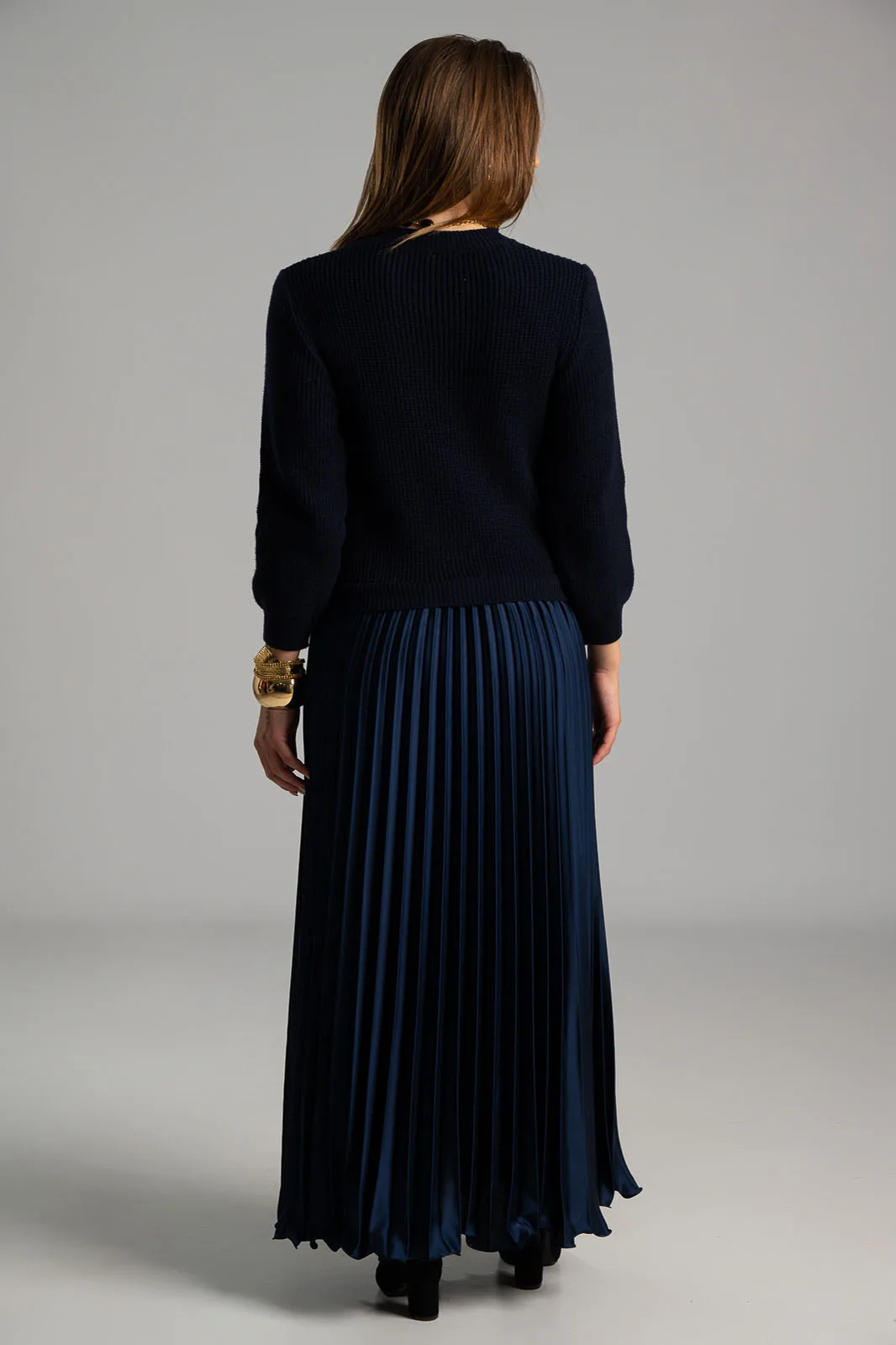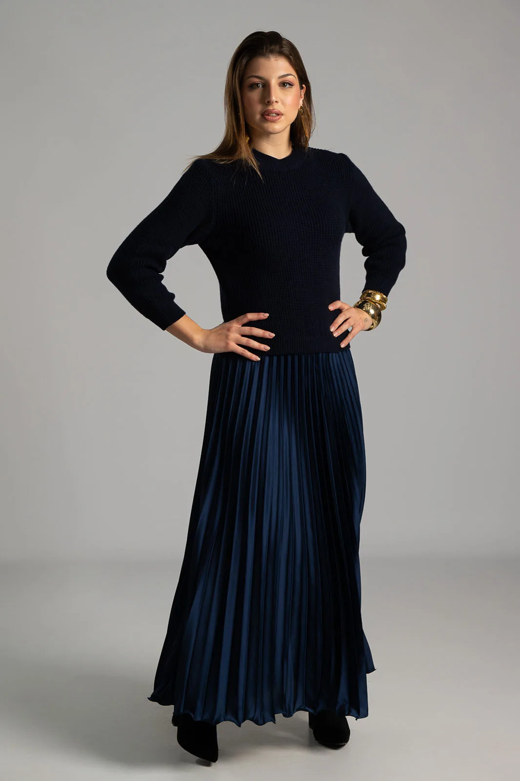 Dress consisting of two different compositions. The top is a knitted pullover style with a round neckline. It has long sleeves. The bottom part is a pleated skirt with a satin texture. It is maxi length. The measurements in the table are representative of each product. 52% viscose, 26% polyester, 22% elastane.