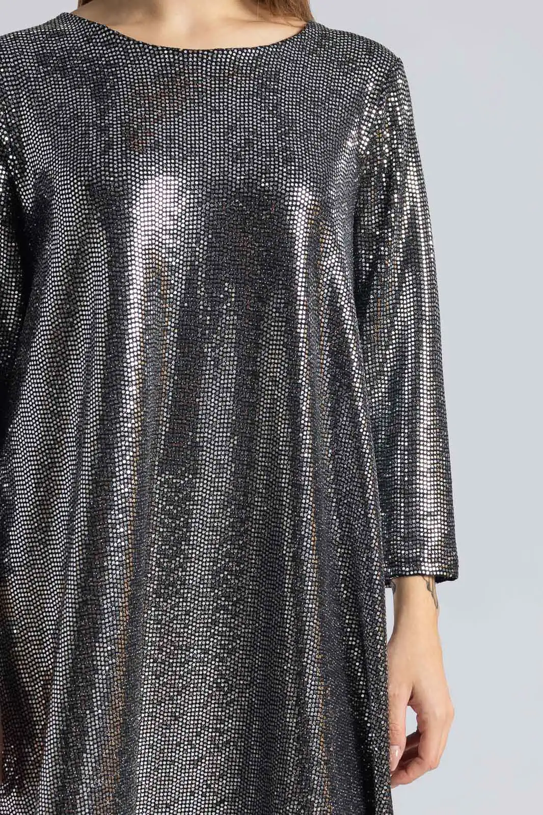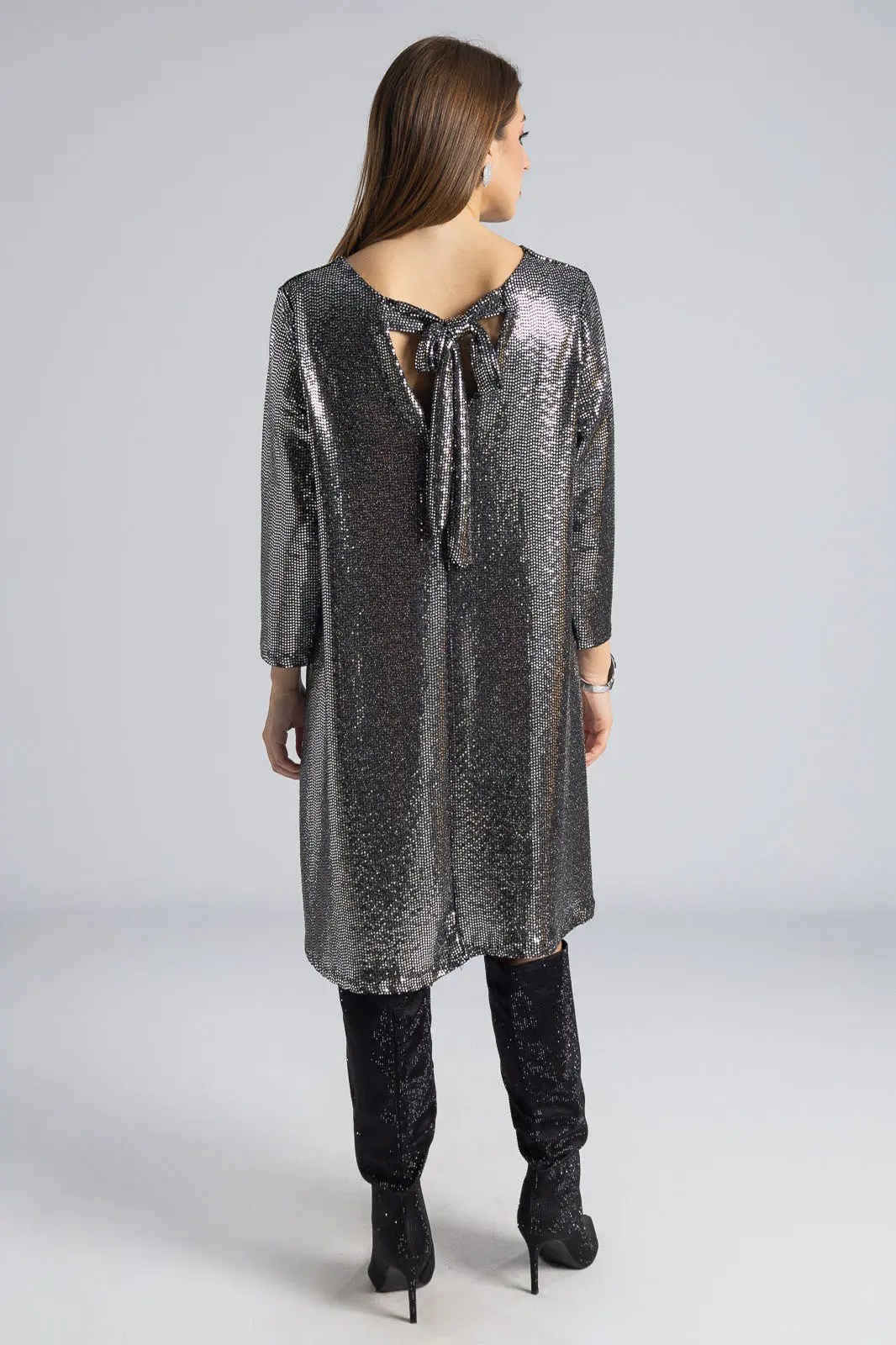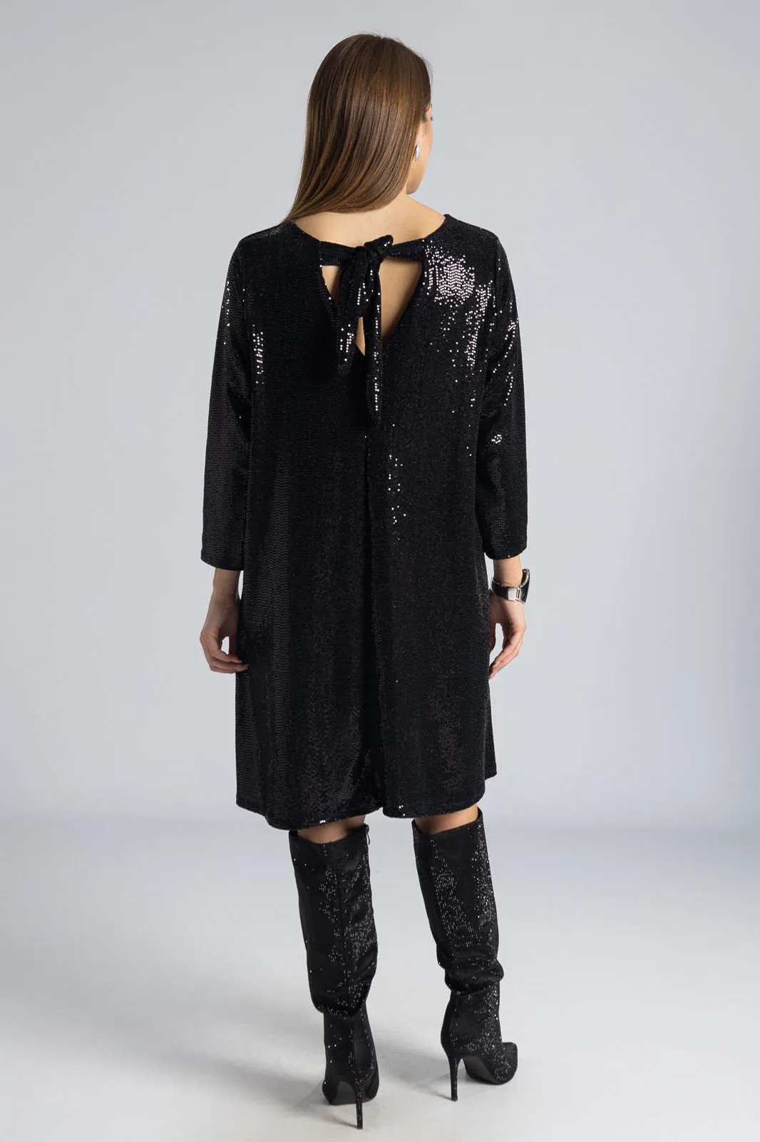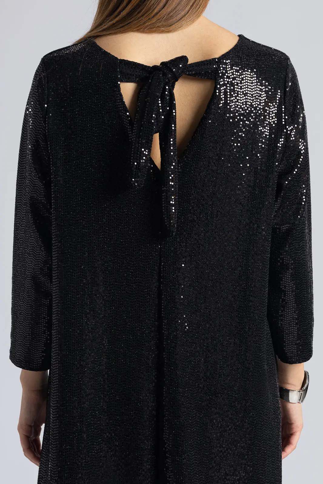 Φόρεμα με μικρές παγιέτες κολλημένες σε όλη την επιφάνεια. Έχει στρογγυλή λαιμόκοψη και μανίκια 3/4. Έχει ίσια γραμμή. Το πίσω μέρος στο ύψος της πλάτης έχει άνοιγμα και δένει με φιόγκο. Οι μετρήσεις του πίνακα είναι αντιπροσωπευτικές για κάθε προϊόν. 95% polyester, 5% elastan.