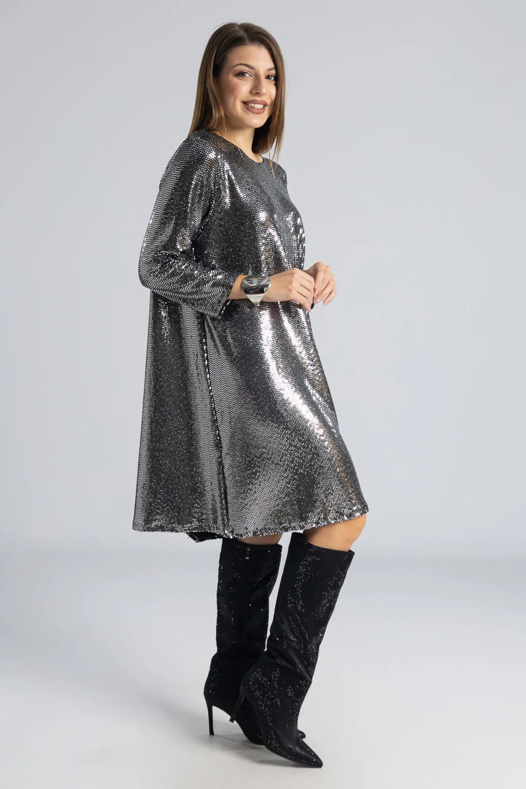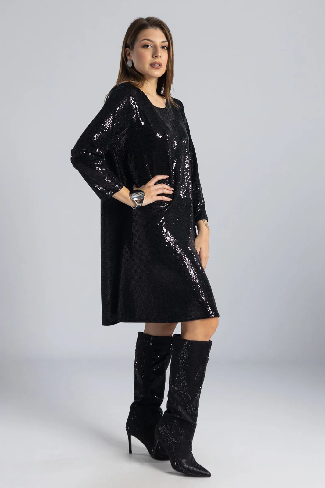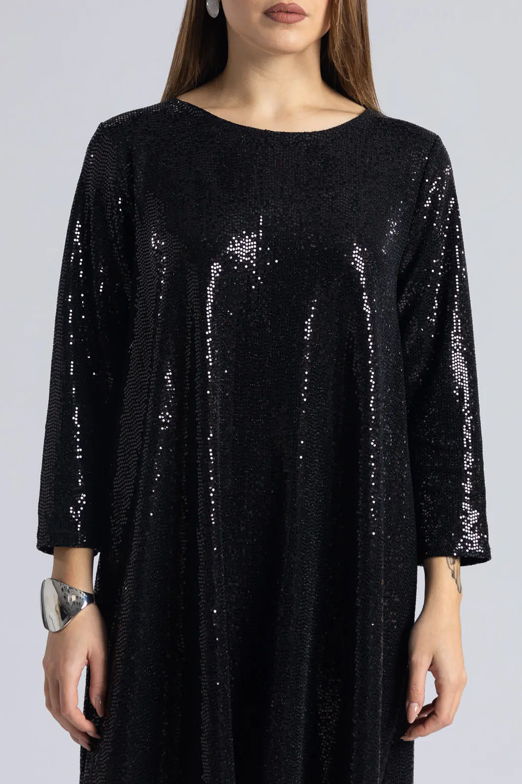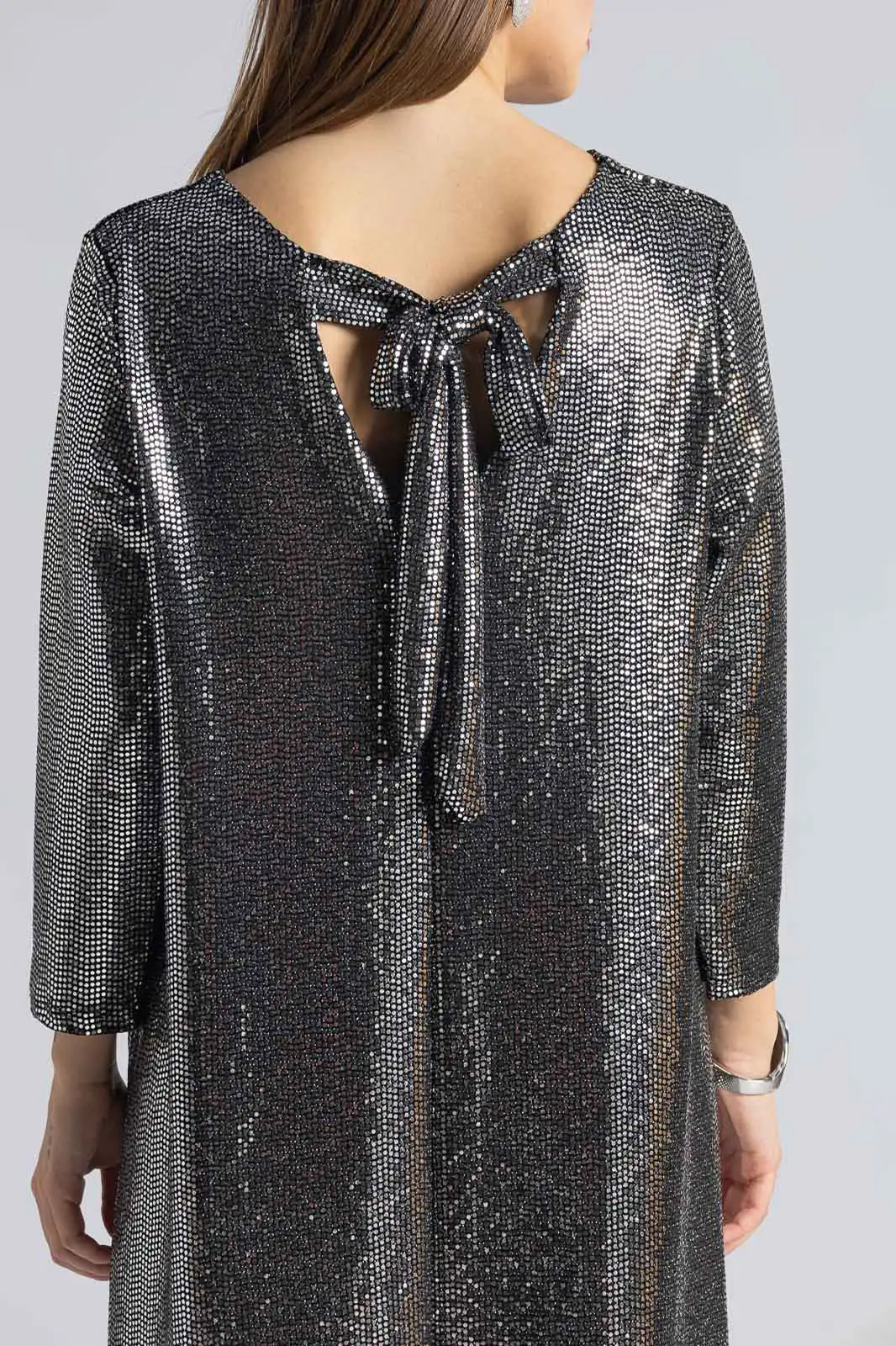 Φόρεμα με μικρές παγιέτες κολλημένες σε όλη την επιφάνεια. Έχει στρογγυλή λαιμόκοψη και μανίκια 3/4. Έχει ίσια γραμμή. Το πίσω μέρος στο ύψος της πλάτης έχει άνοιγμα και δένει με φιόγκο. Οι μετρήσεις του πίνακα είναι αντιπροσωπευτικές για κάθε προϊόν. 95% polyester, 5% elastan.