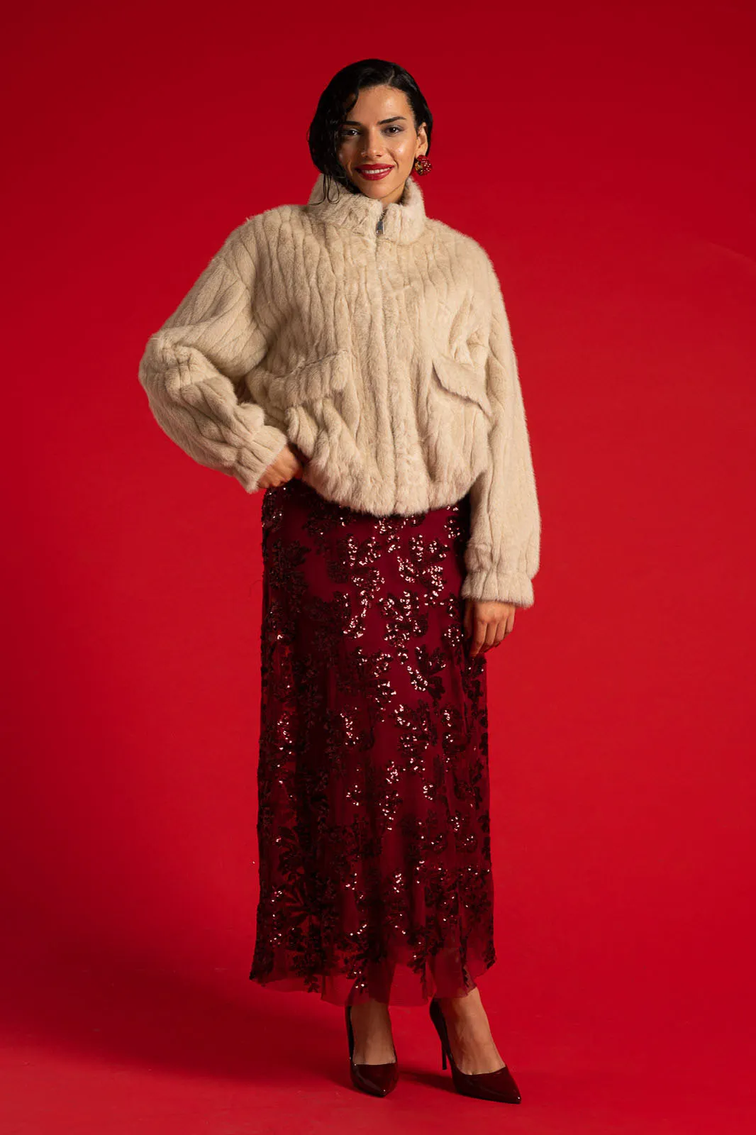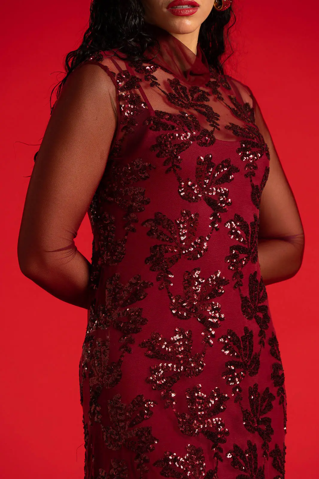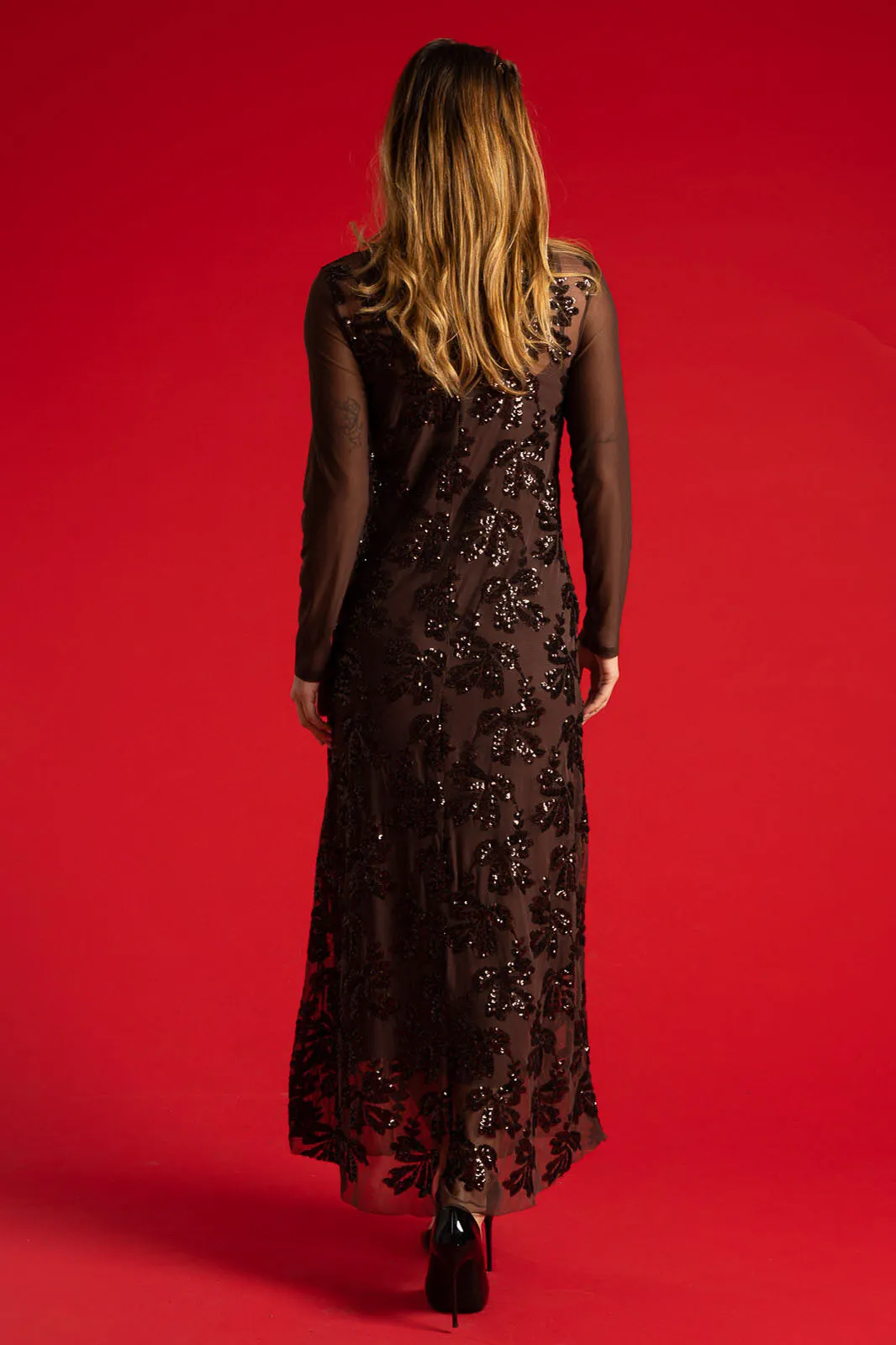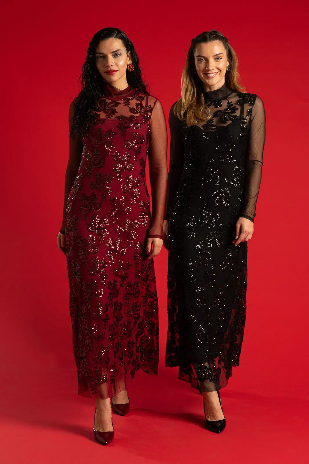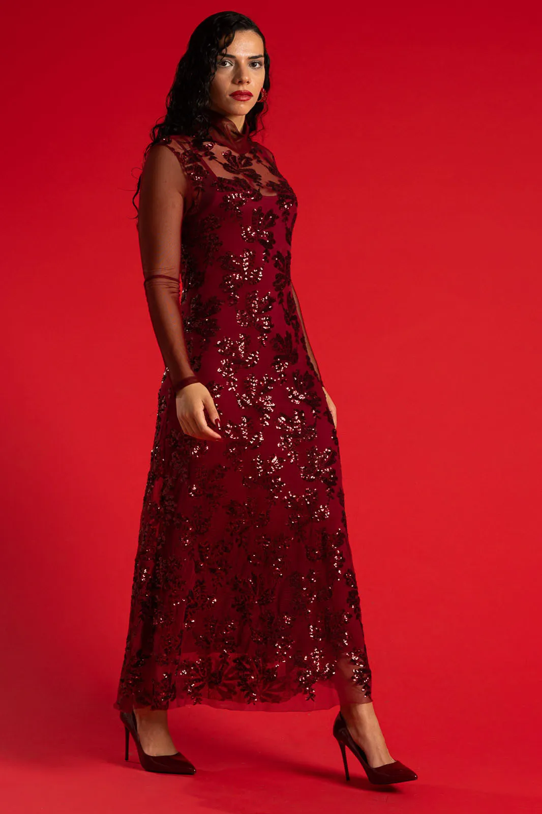 Tulle dress with lupeto neckline. It has long sleeves. The entire surface is tulle with decorative sequins. Inside, it has a slip with a thin strapless bodice. It is maxi length. The measurements in the table are representative of each product. 95% polyester, 5% elastane. (lining) 95% viscose, 5% elastane.
