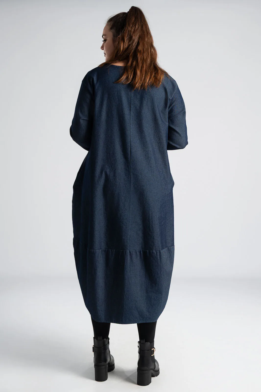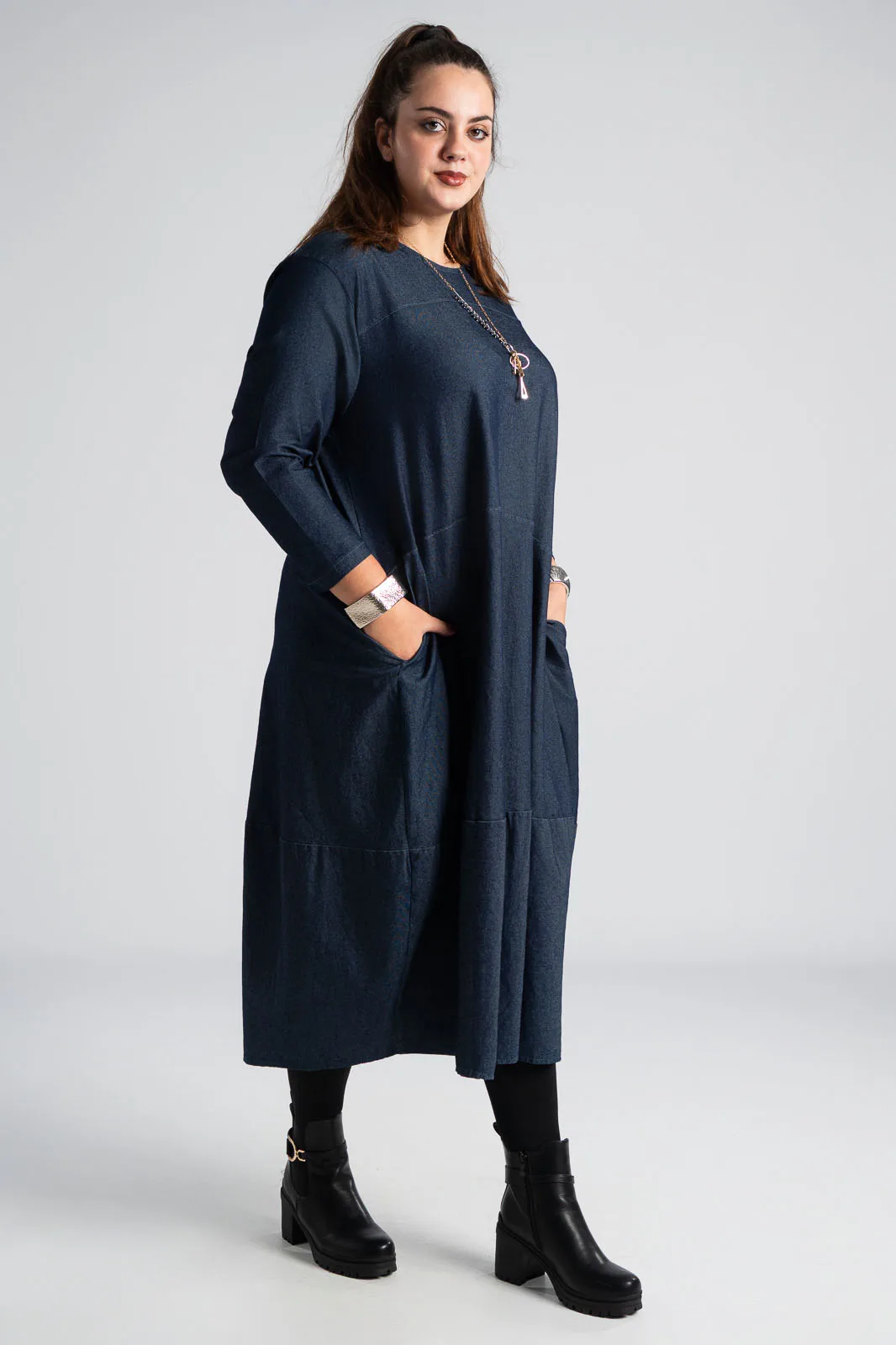 Φόρεμα βαμβακερό maxi με μακριά μανίκια. Είναι σε τζιν ύφασμα και έχει στρογγυλή λαιμόκοψη. Είναι σε Α γραμμή και στα πλαϊνά διαθέτει στέπες. Οι μετρήσεις του πίνακα είναι αντιπροσωπευτικές για κάθε προϊόν. 75% cotton, 23% polyester, 2% elastan.