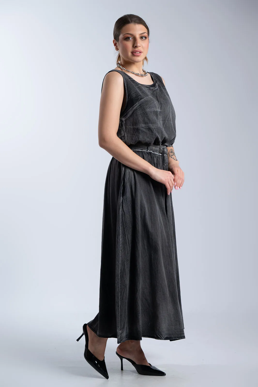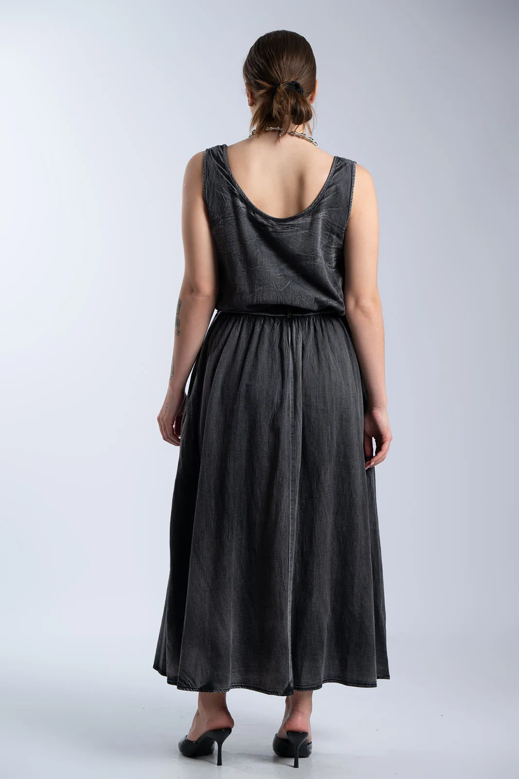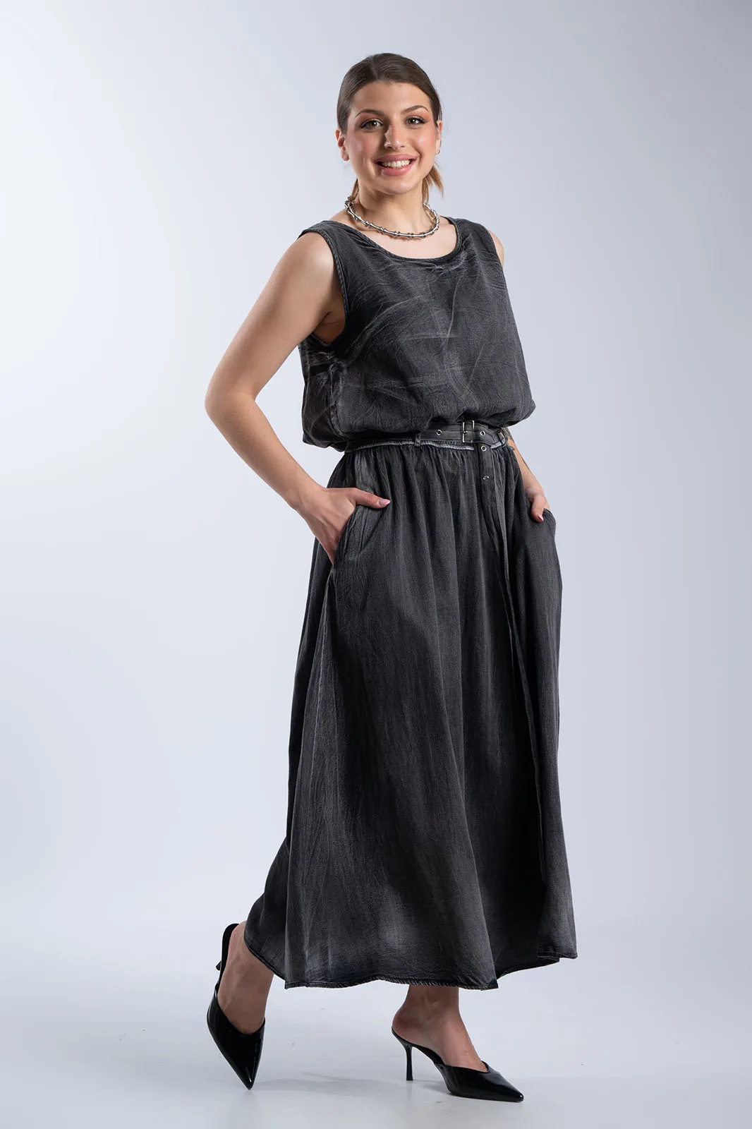 Midi φόρεμα με ανάλαφρη υφή και χαλαρή γραμμή που προσφέρει άνεση και κομψότητα. Διαθέτει στρογγυλή λαιμόκοψη και φαρδιές τιράντες, ενώ η μέση έχει περιμετρικό λάστιχο που αγκαλιάζει το σώμα. Συνοδεύεται από λεπτό ζωνάκι για καλύτερη εφαρμογή και διαθέτει πλαϊνές τσέπες που προσθέτουν πρακτικότητα στο σχέδιο.