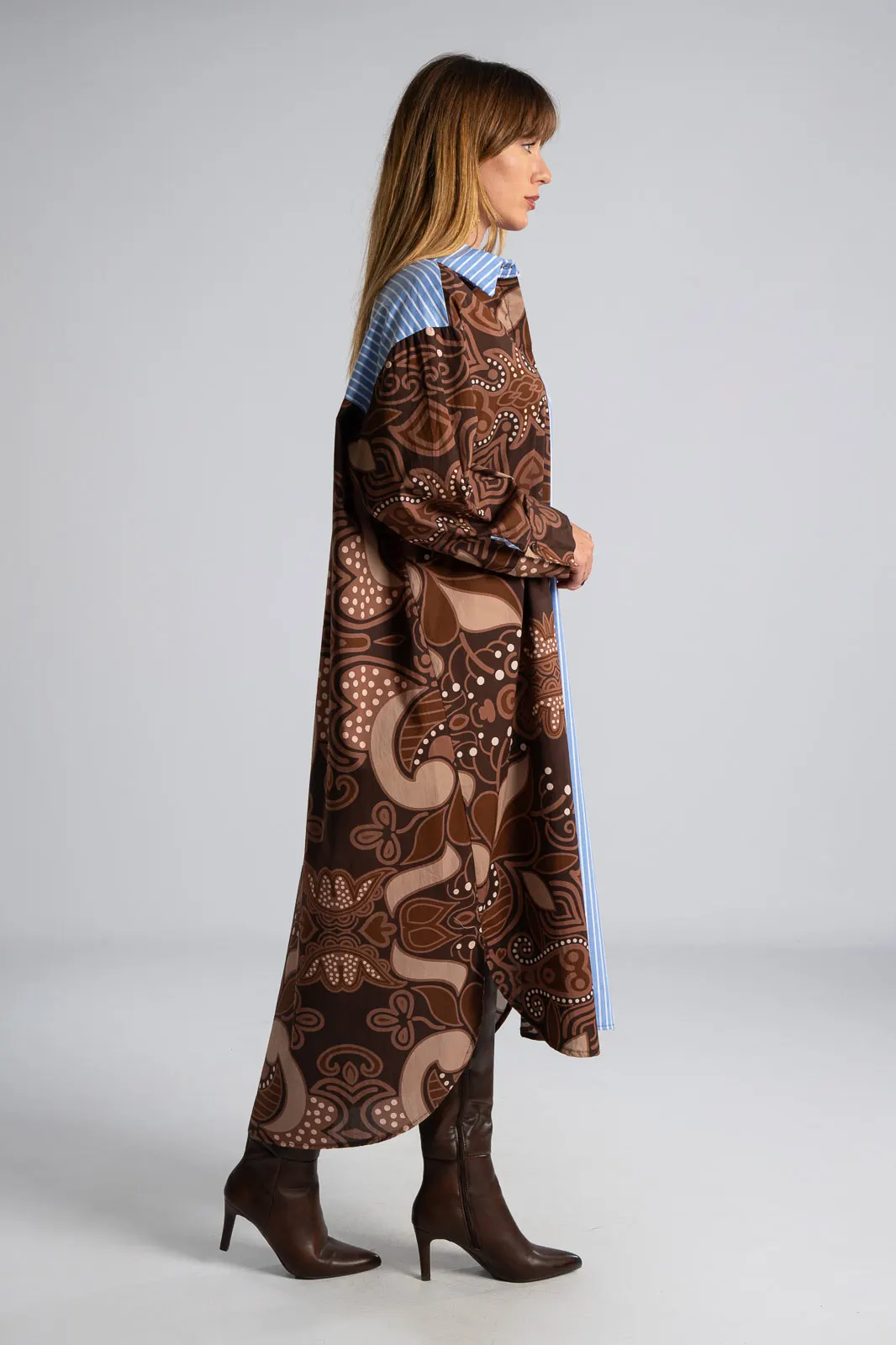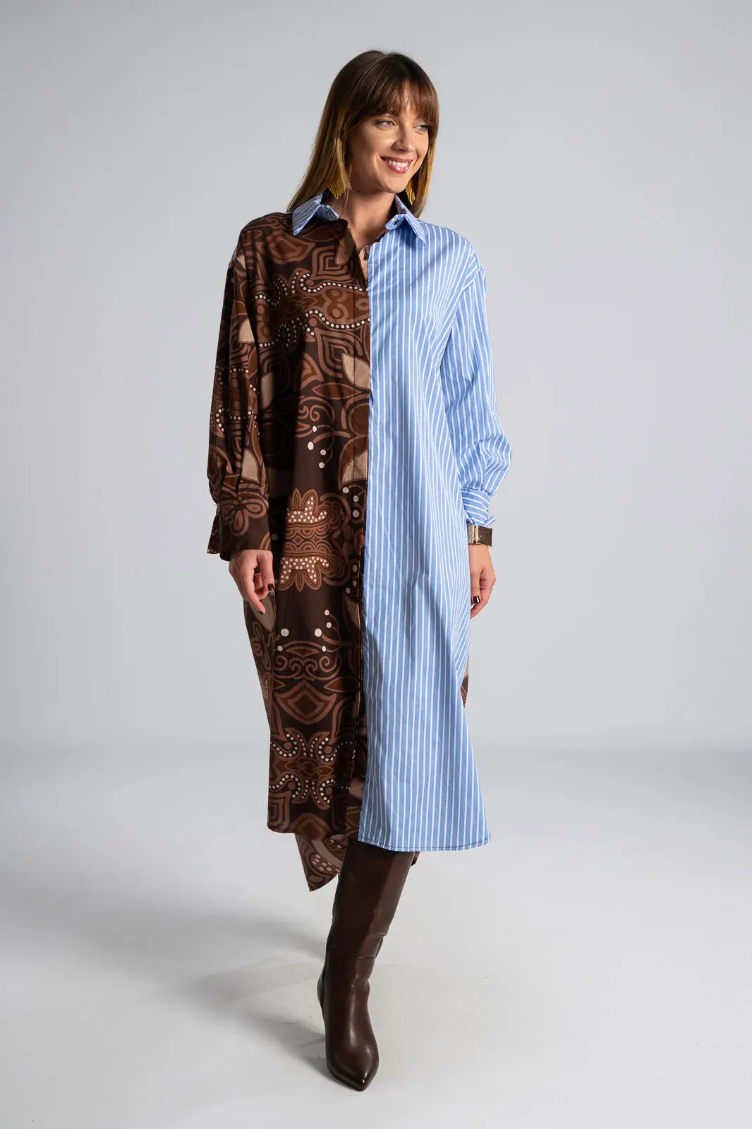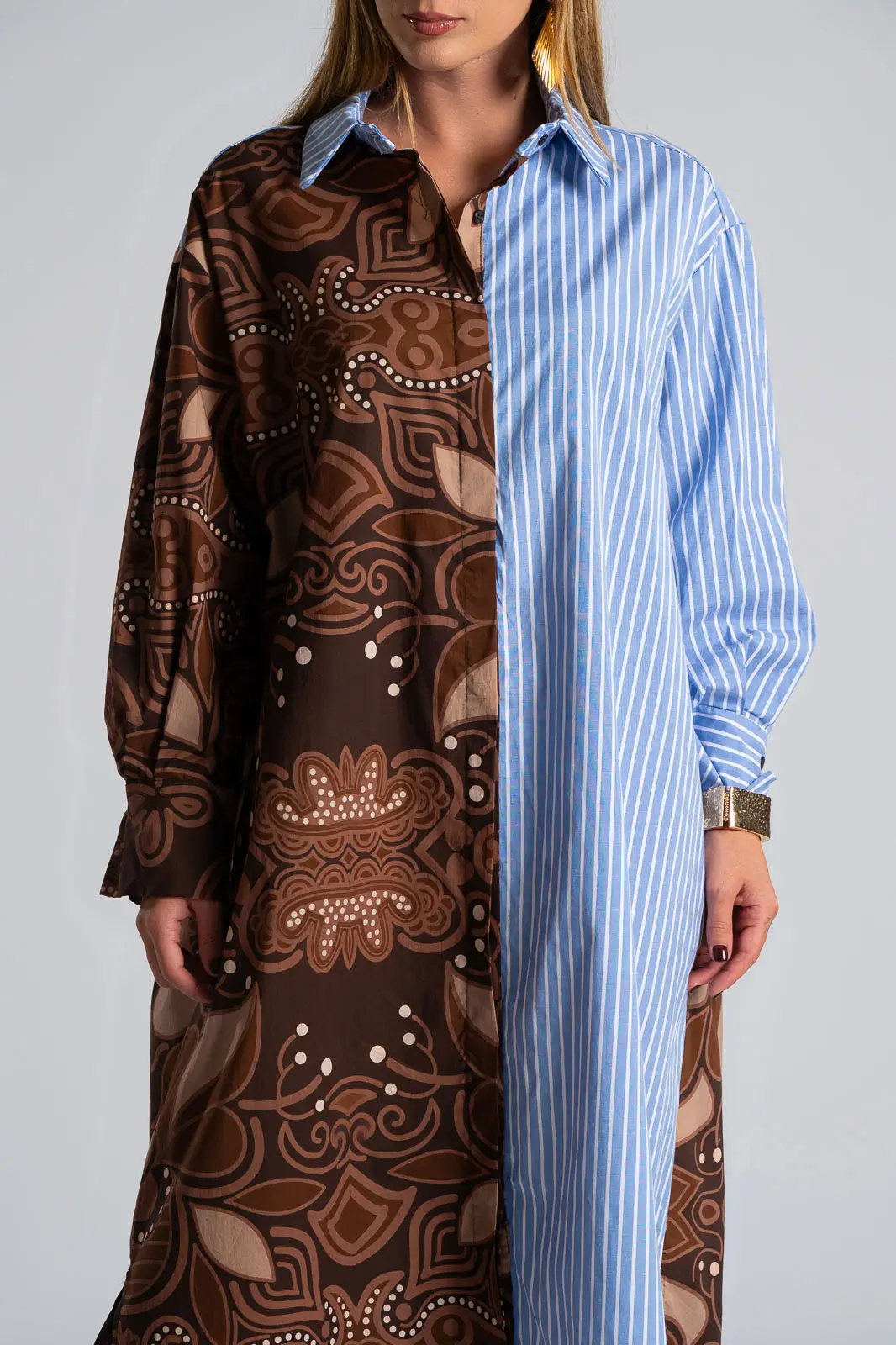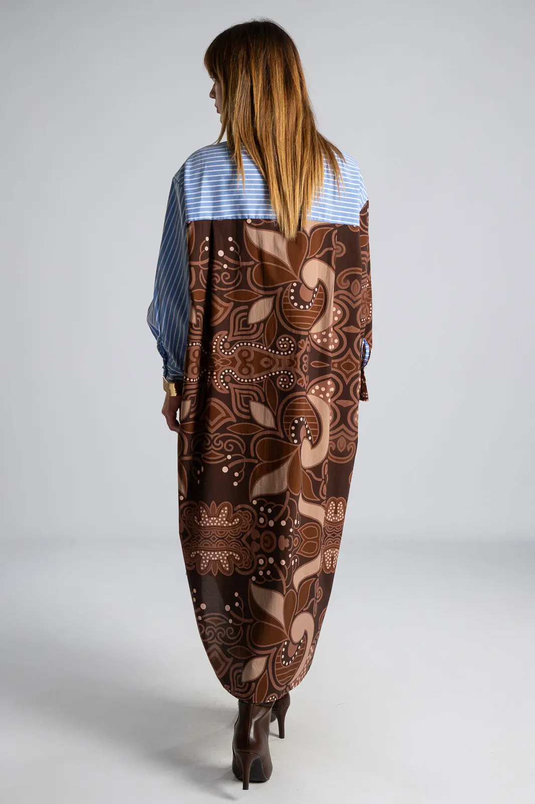 Φόρεμα βαμβακερό maxi. Είναι σε ίσια και άνετη γραμμή. Είναι ριγέ και διαθέτει εμπριμέ σχέδιο. Έχει μακριά μανίκια και κλείνει με κουμπιά. Τα κουμπιά είναι καλυμμένα με πατιλέτα. Στο πίσω μέρος είναι πιο μακρύ και έχει στρογγυλό κόψιμο. Οι μετρήσεις του πίνακα είναι αντιπροσωπευτικές για κάθε προϊόν. 100% cotton.