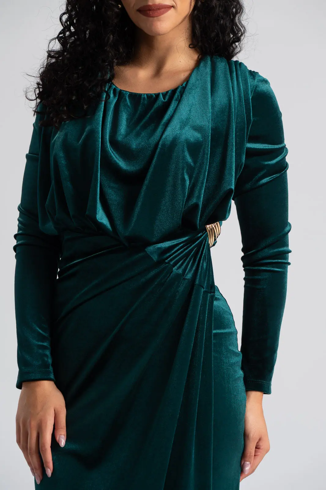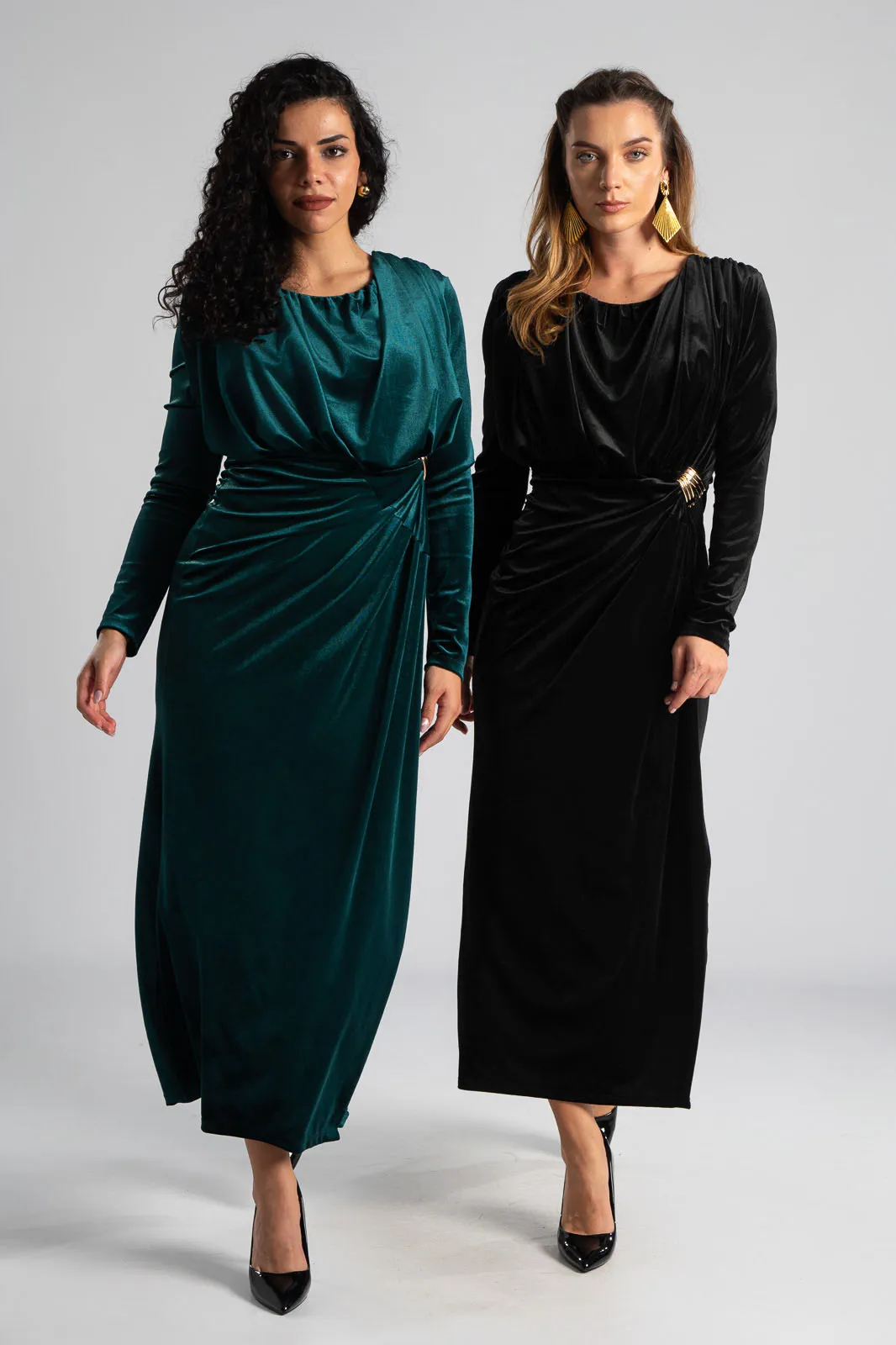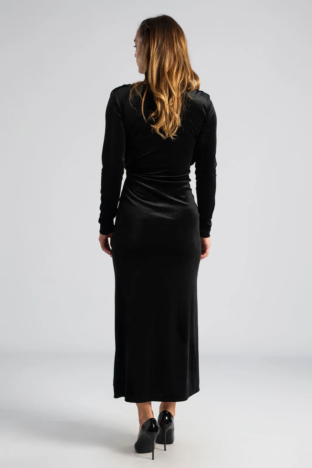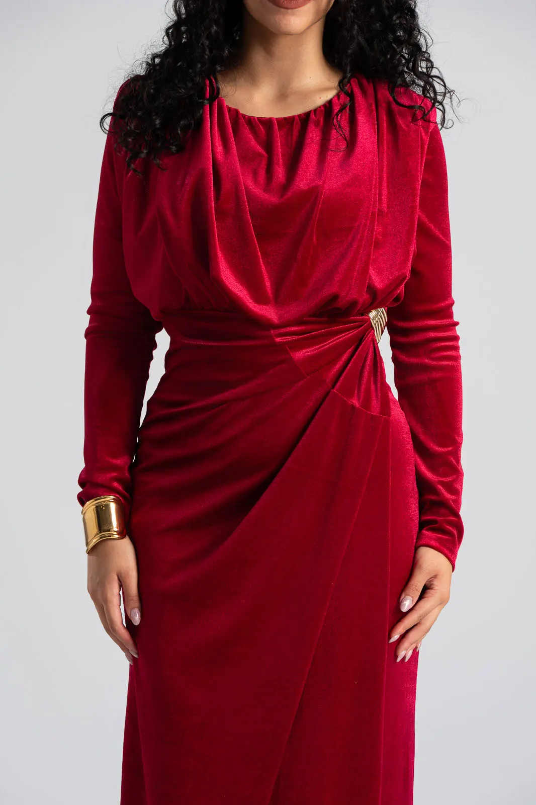 Φόρεμα velvet maxi. Έχει στρογγυλή λαιμόκοψη και μακριά μανίκια. Στο πάνω μέρος διαθέτει πτυχώσεις που προσδίδουν κομψότητα. Στο κάτω μέρος στο πλάι είναι τύπου φάκελος και διαθέτει άνοιγμα. Είναι ιδανικό για όλες τις περιστάσεις. Στο πλάι έχει διακοσμητικό μεταλλικό σχέδιο. Οι μετρήσεις του πίνακα είναι αντιπροσωπευτικές για κάθε κωδικό. 100% polyester, Εσωτερικό ύφασμα: 95% polyester, 5% elastan.