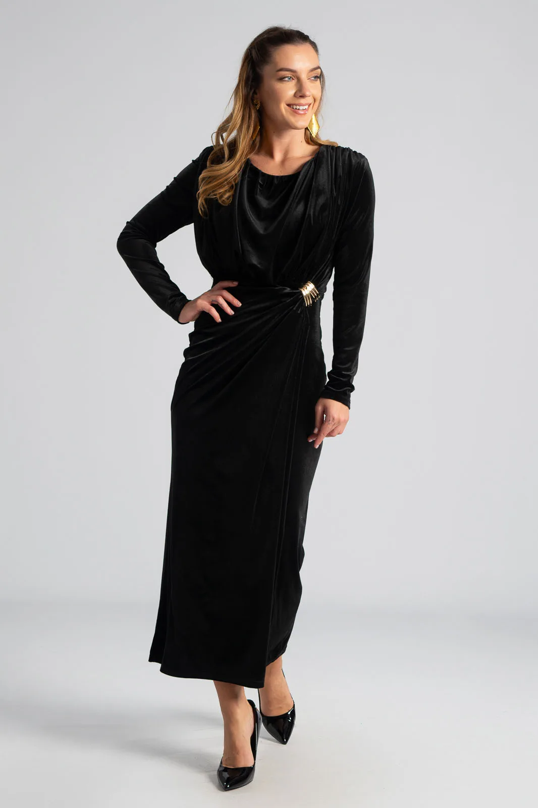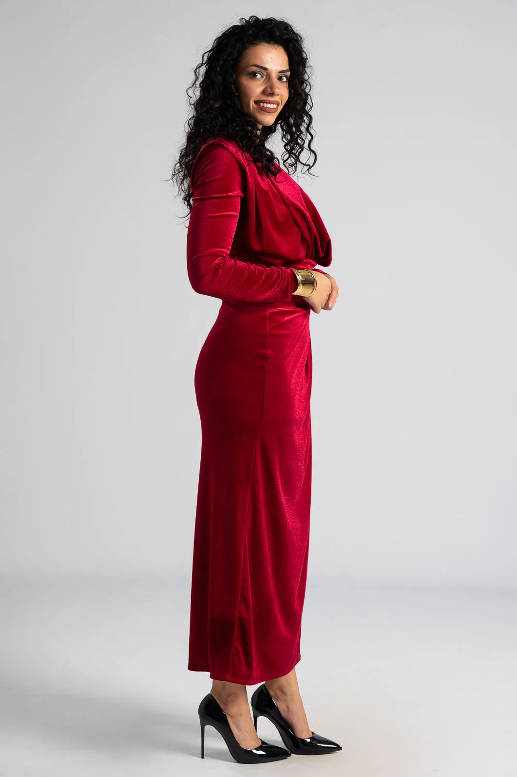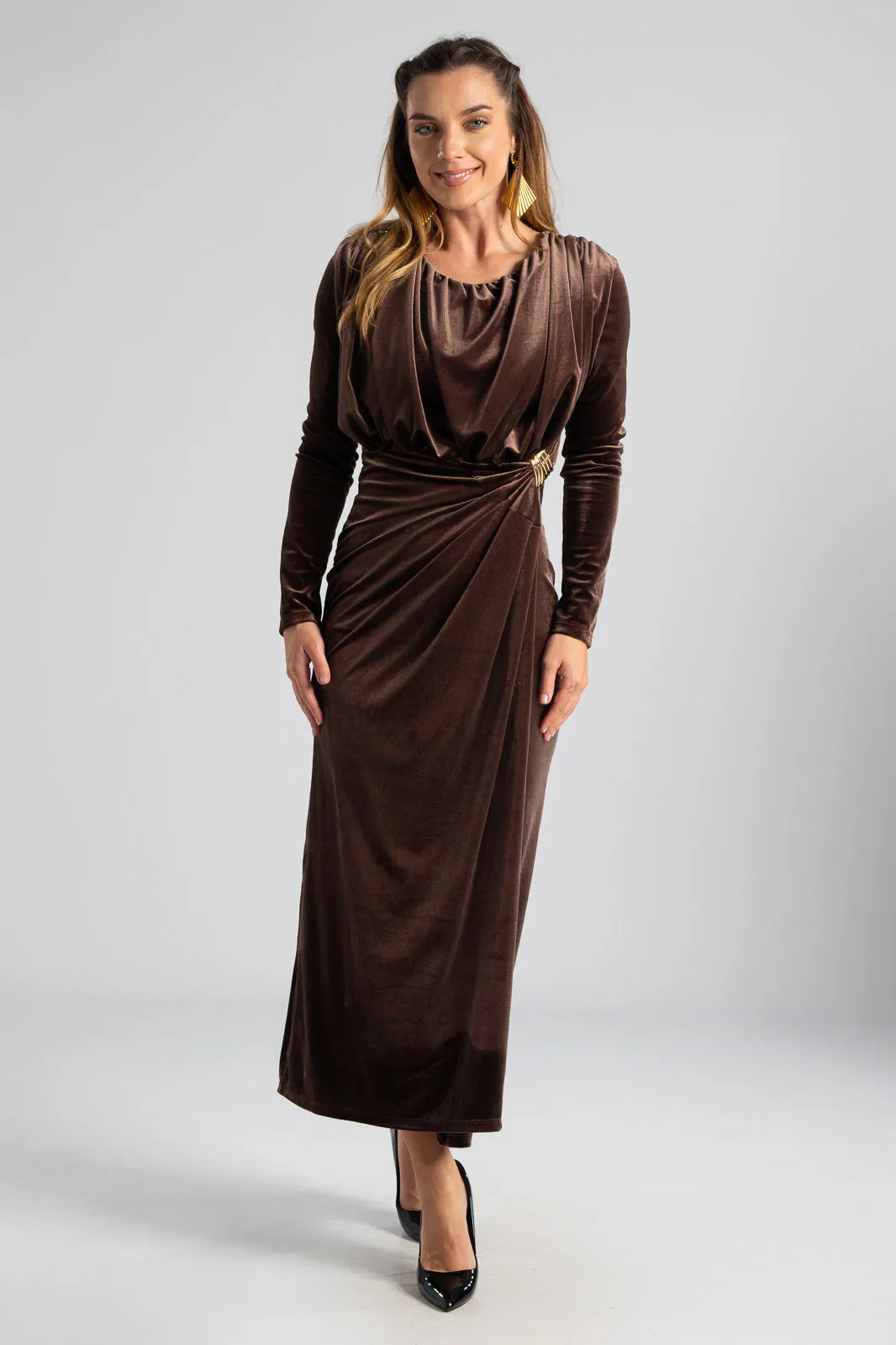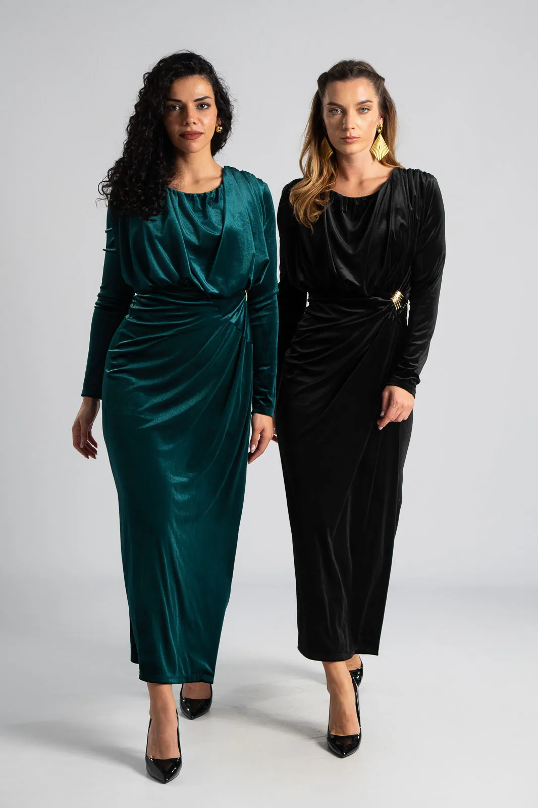 Φόρεμα velvet maxi. Έχει στρογγυλή λαιμόκοψη και μακριά μανίκια. Στο πάνω μέρος διαθέτει πτυχώσεις που προσδίδουν κομψότητα. Στο κάτω μέρος στο πλάι είναι τύπου φάκελος και διαθέτει άνοιγμα. Είναι ιδανικό για όλες τις περιστάσεις. Στο πλάι έχει διακοσμητικό μεταλλικό σχέδιο. Οι μετρήσεις του πίνακα είναι αντιπροσωπευτικές για κάθε κωδικό. 100% polyester, Εσωτερικό ύφασμα: 95% polyester, 5% elastan.