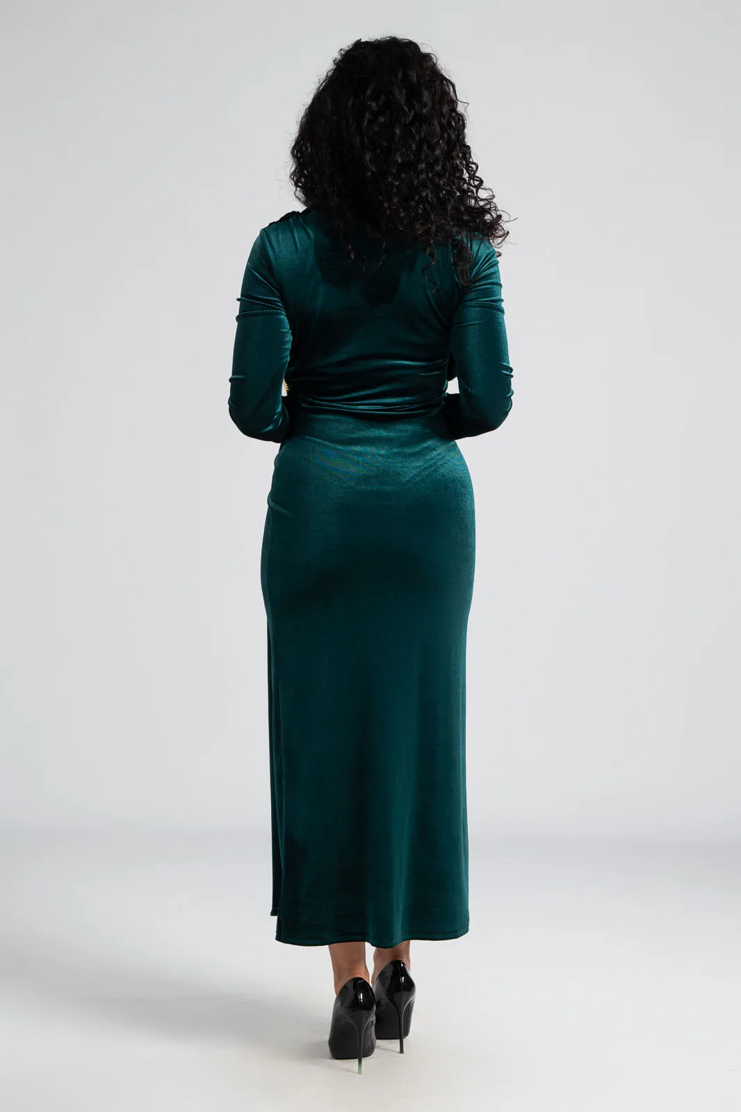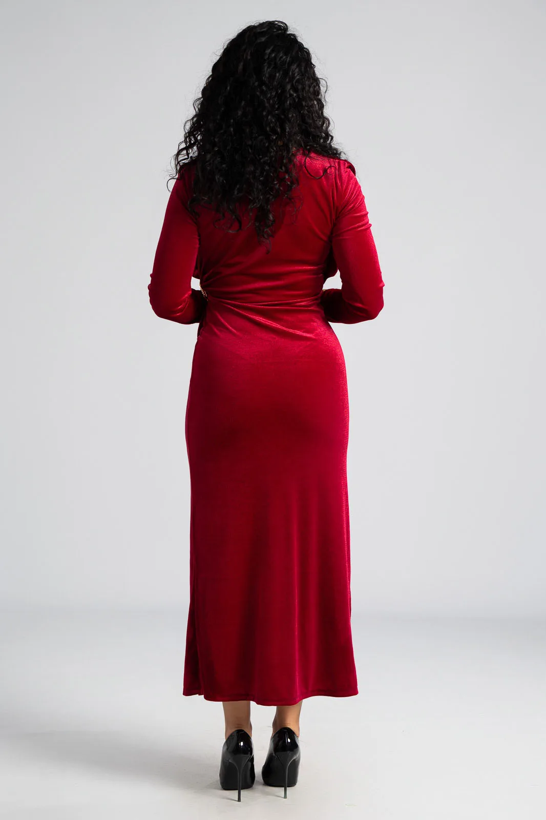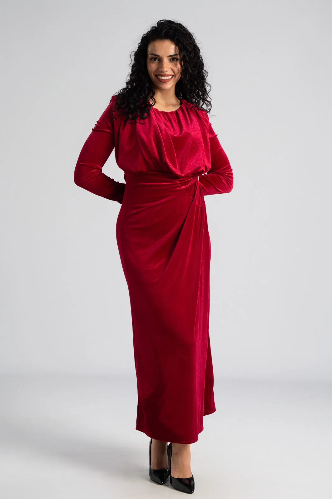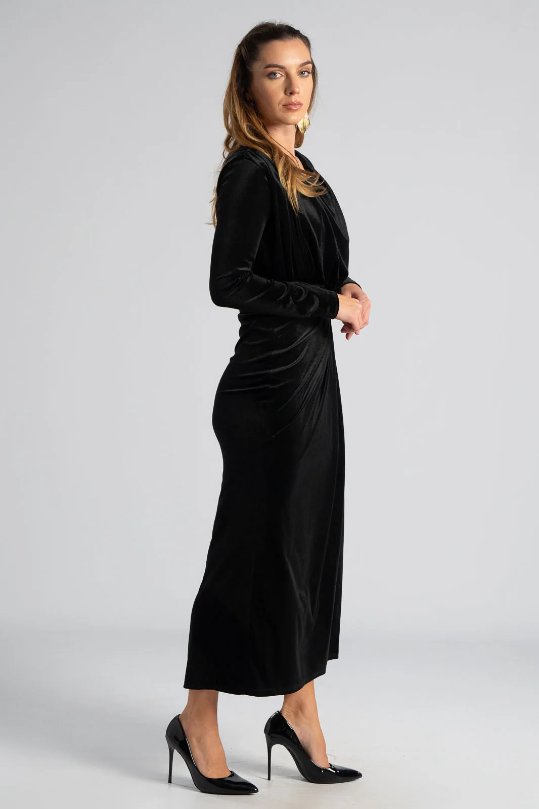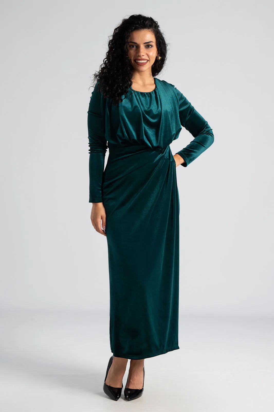Φόρεμα velvet maxi. Έχει στρογγυλή λαιμόκοψη και μακριά μανίκια. Στο πάνω μέρος διαθέτει πτυχώσεις που προσδίδουν κομψότητα. Στο κάτω μέρος στο πλάι είναι τύπου φάκελος και διαθέτει άνοιγμα. Είναι ιδανικό για όλες τις περιστάσεις. Στο πλάι έχει διακοσμητικό μεταλλικό σχέδιο. Οι μετρήσεις του πίνακα είναι αντιπροσωπευτικές για κάθε κωδικό. 100% polyester, Εσωτερικό ύφασμα: 95% polyester, 5% elastan.