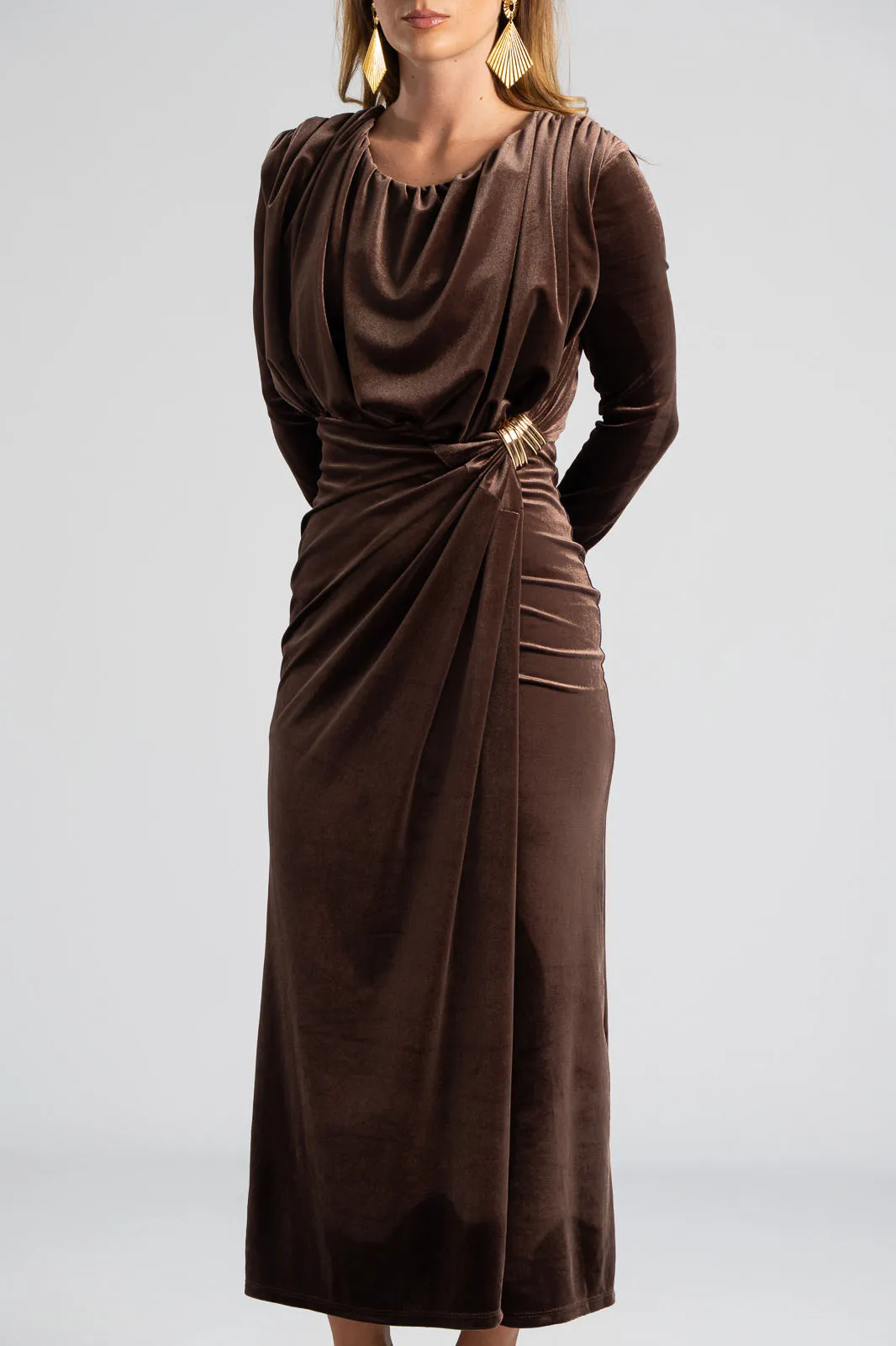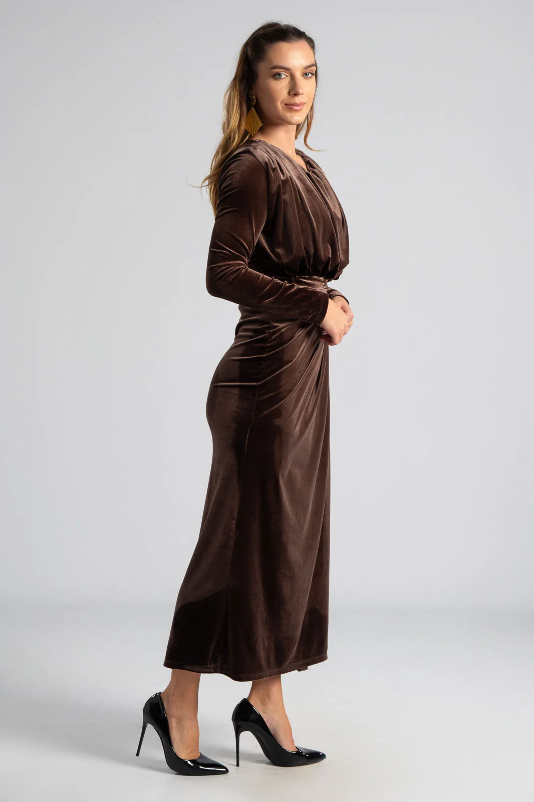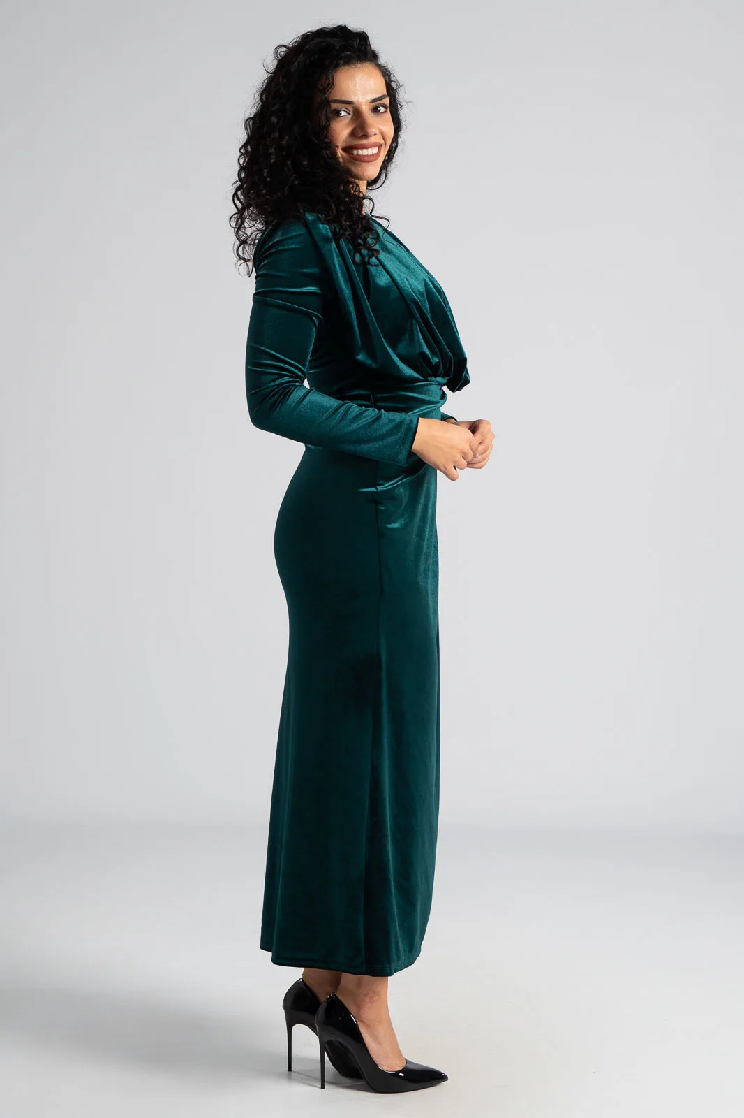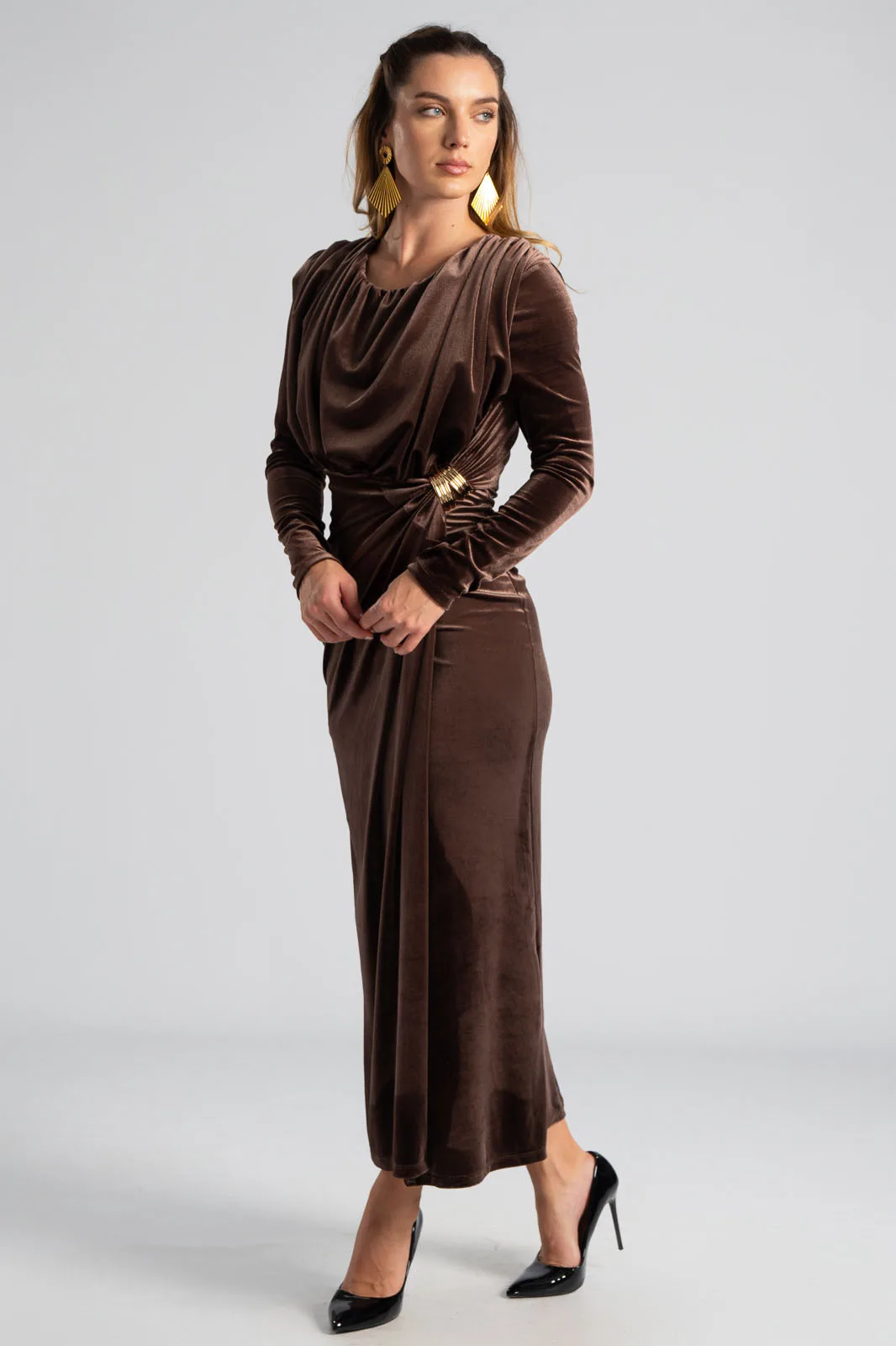 Φόρεμα velvet maxi. Έχει στρογγυλή λαιμόκοψη και μακριά μανίκια. Στο πάνω μέρος διαθέτει πτυχώσεις που προσδίδουν κομψότητα. Στο κάτω μέρος στο πλάι είναι τύπου φάκελος και διαθέτει άνοιγμα. Είναι ιδανικό για όλες τις περιστάσεις. Στο πλάι έχει διακοσμητικό μεταλλικό σχέδιο. Οι μετρήσεις του πίνακα είναι αντιπροσωπευτικές για κάθε κωδικό. 100% polyester, Εσωτερικό ύφασμα: 95% polyester, 5% elastan.