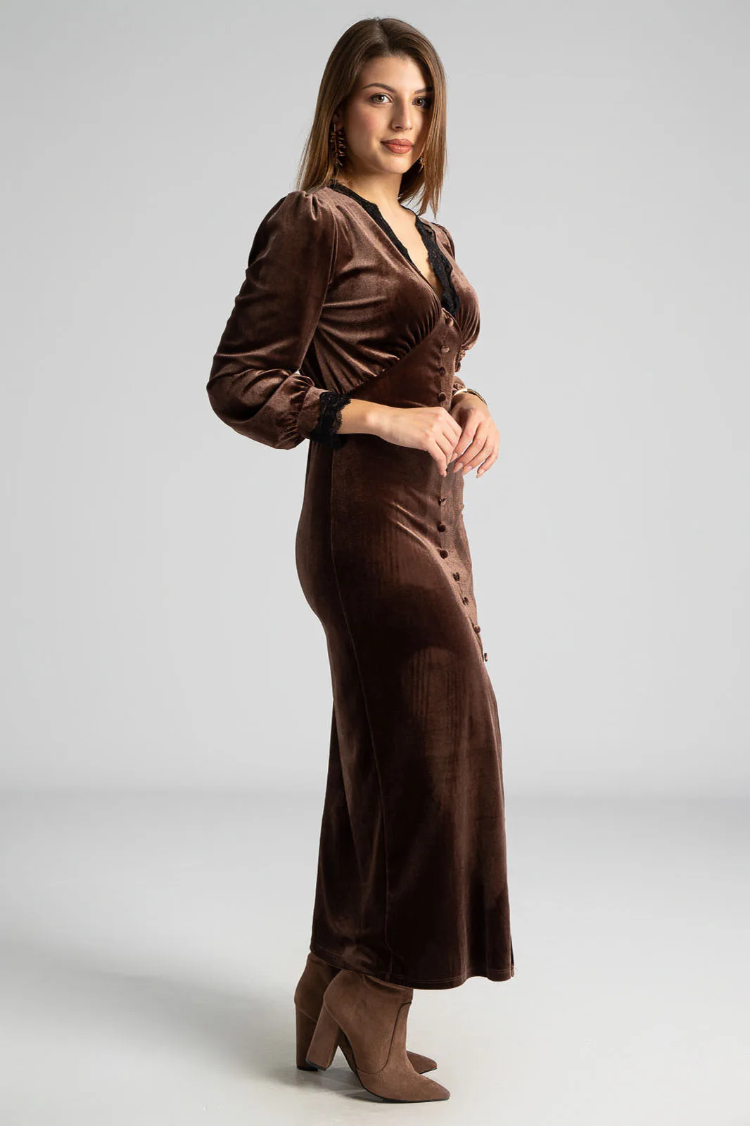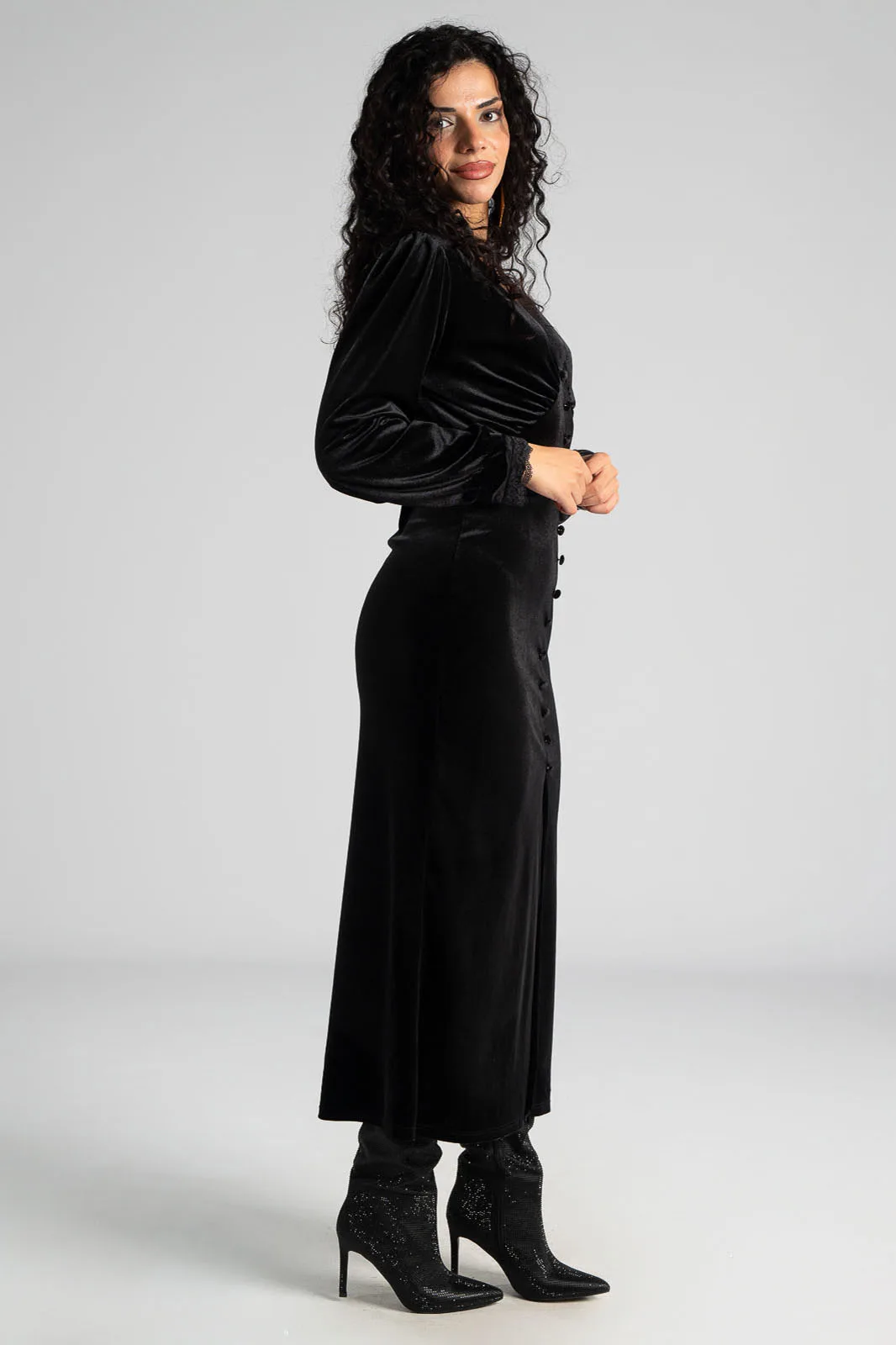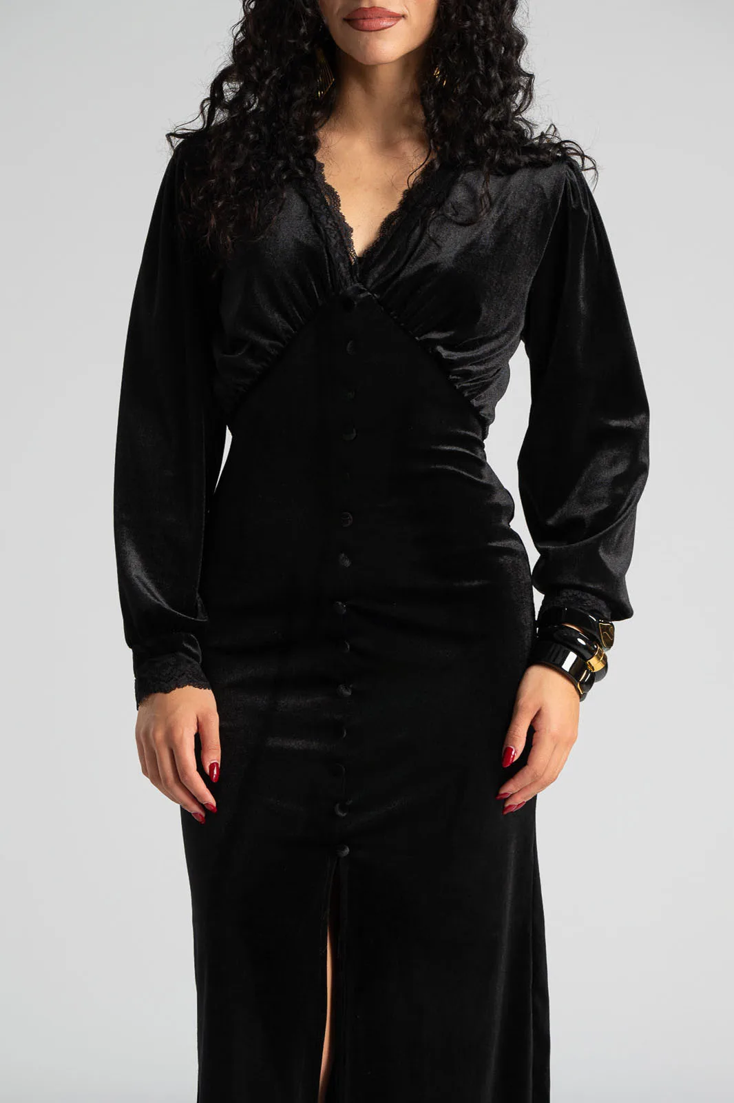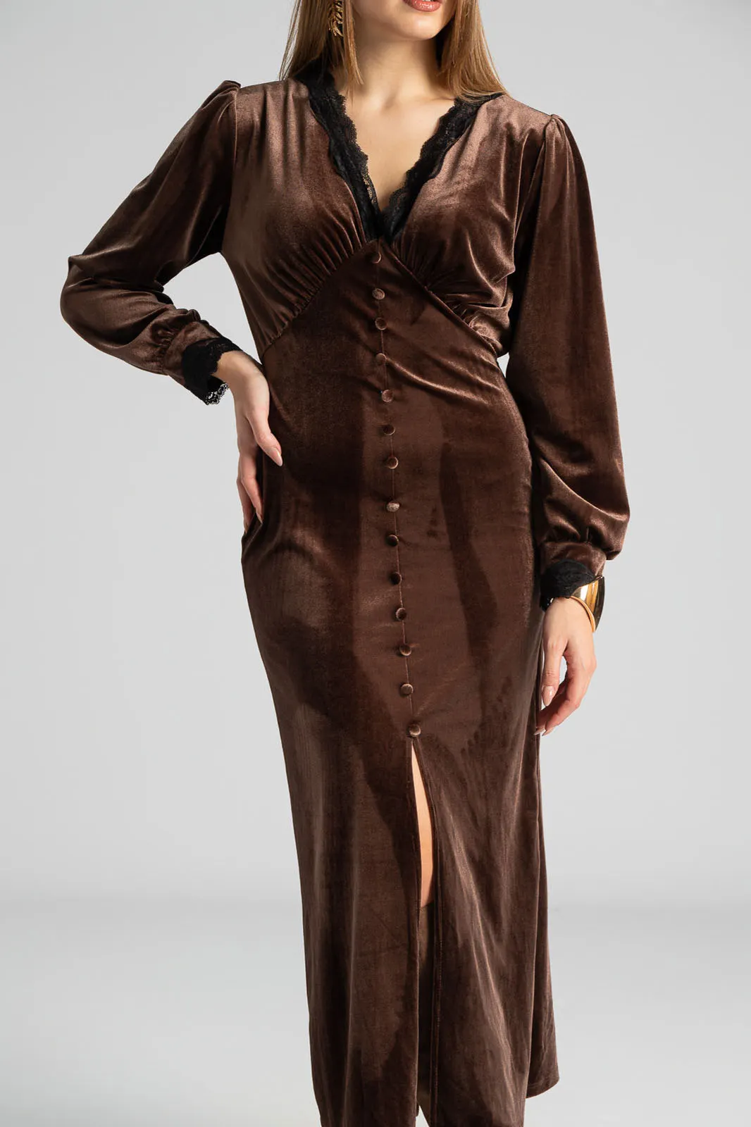 Dress with a V-neckline and decorative lace around the edges. It has long sleeves and ends with decorative lace. There are decorative buttons along the length of the dress. There is elastic at the back at the height of the back. There is a small opening at the front. The entire surface has a velvet texture. The measurements in the table are representative of each product. 95% polyester, 5% elastane.