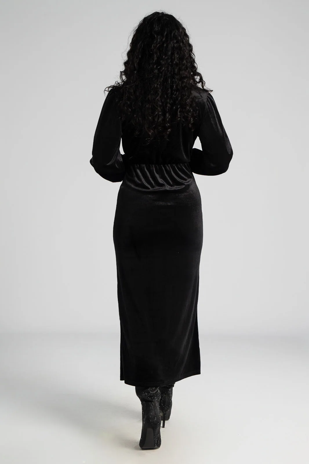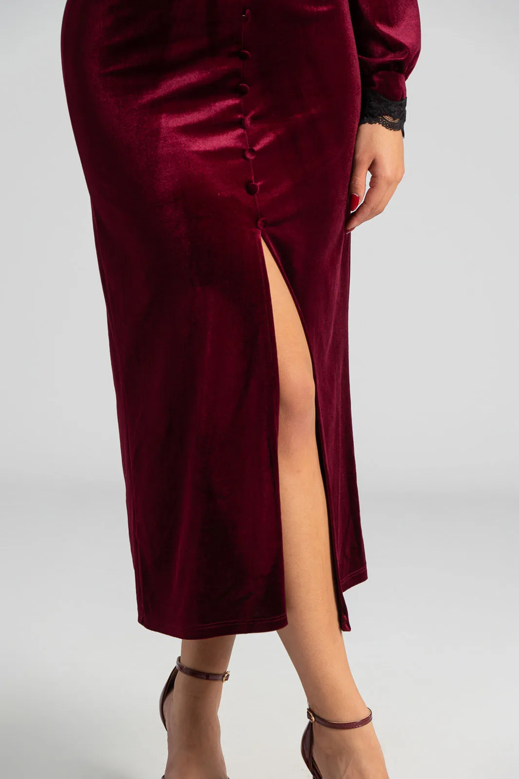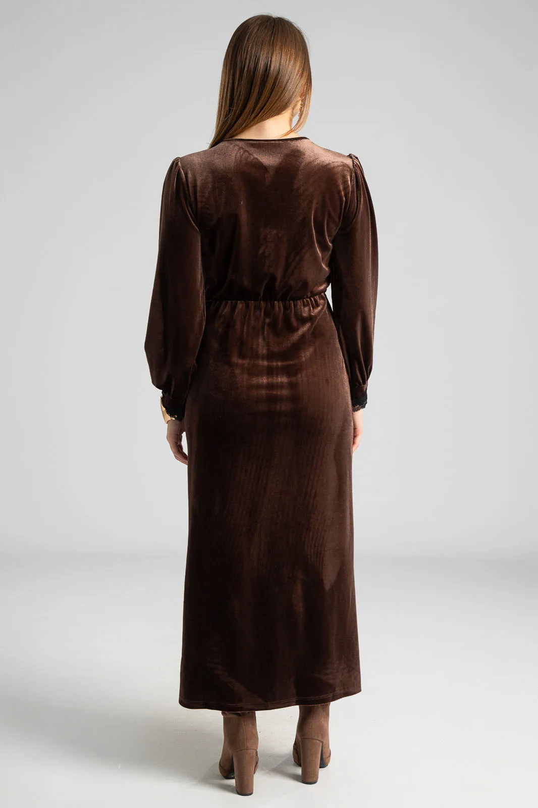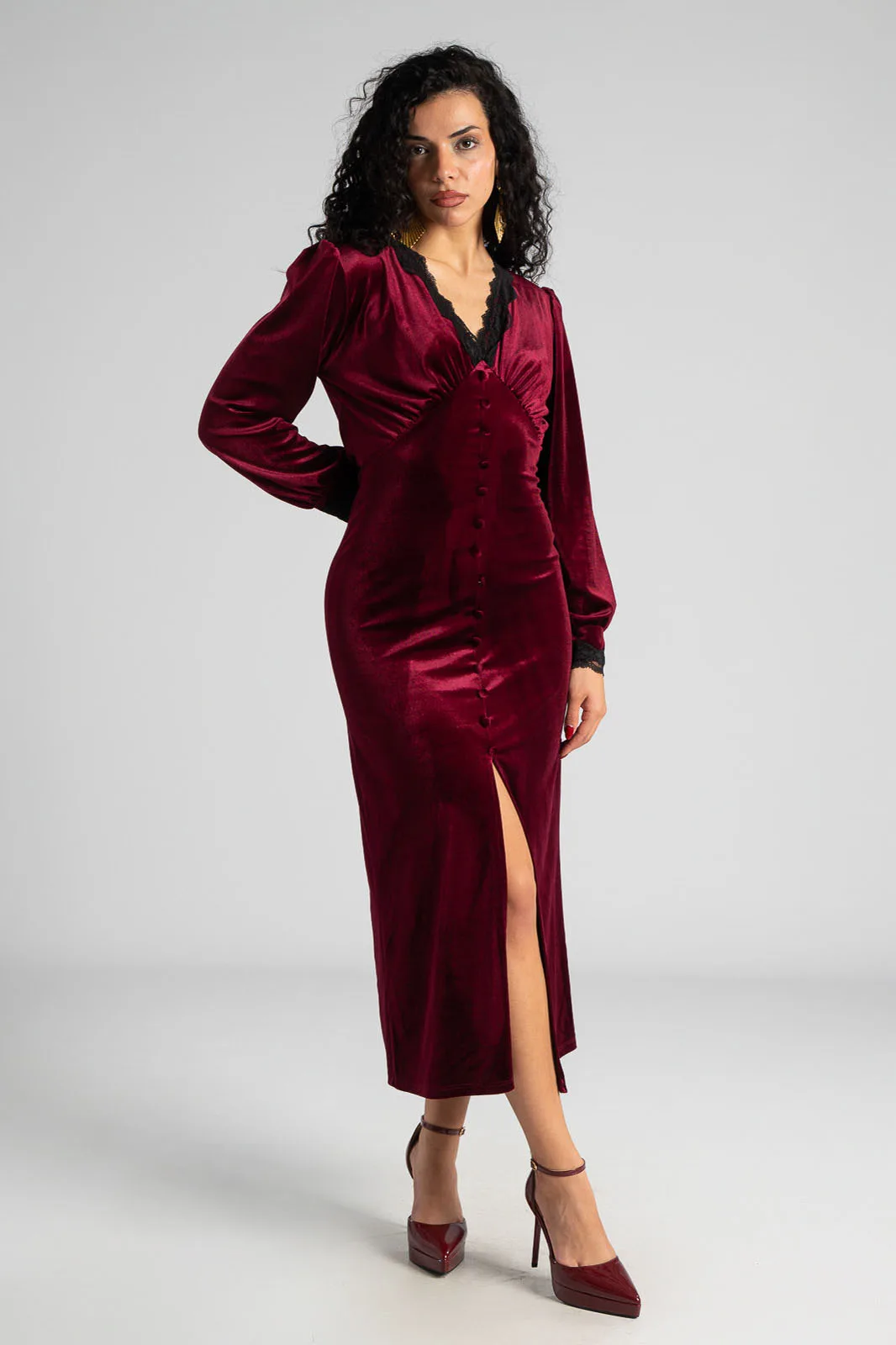 Dress with a V-neckline and decorative lace around the edges. It has long sleeves and ends with decorative lace. There are decorative buttons along the length of the dress. There is elastic at the back at the height of the back. There is a small opening at the front. The entire surface has a velvet texture. The measurements in the table are representative of each product. 95% polyester, 5% elastane.