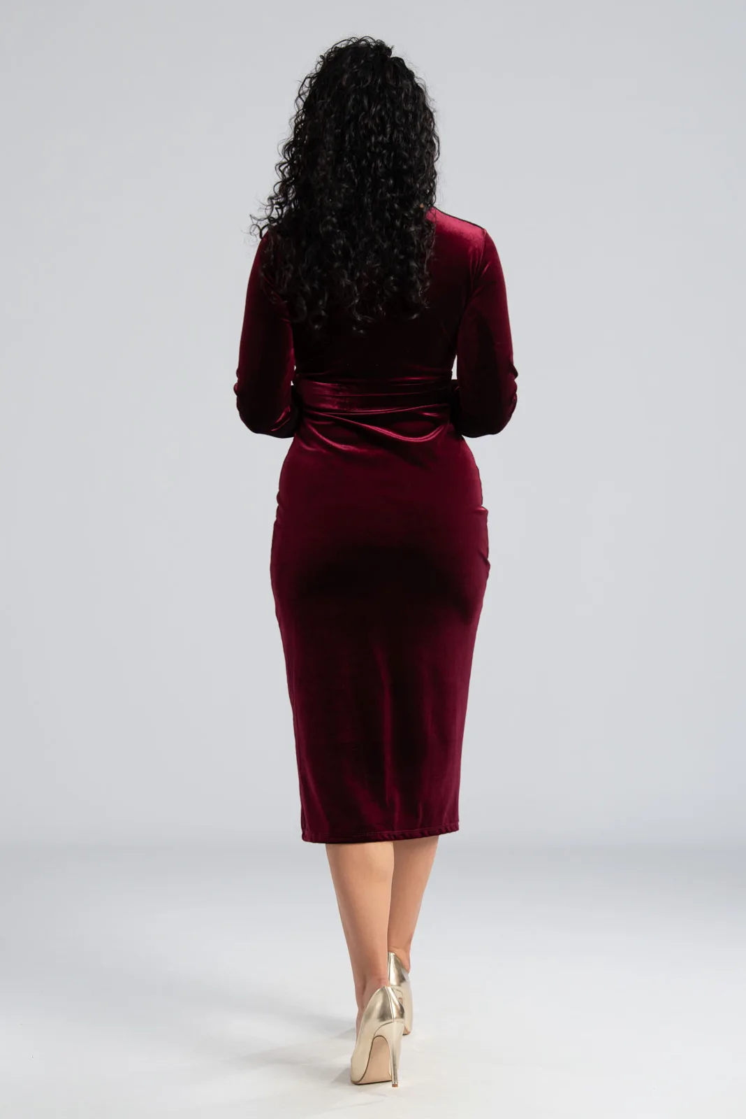 Midi velvet dress. It is wrapped and has cups at the chest. It has a metal detail and a drawstring at the side. It has a pleat at the waist and an opening at the bottom. It has long sleeves. It is an ideal choice for any occasion! The measurements in the table are representative of each product. 92% polyester, 8% elastane.