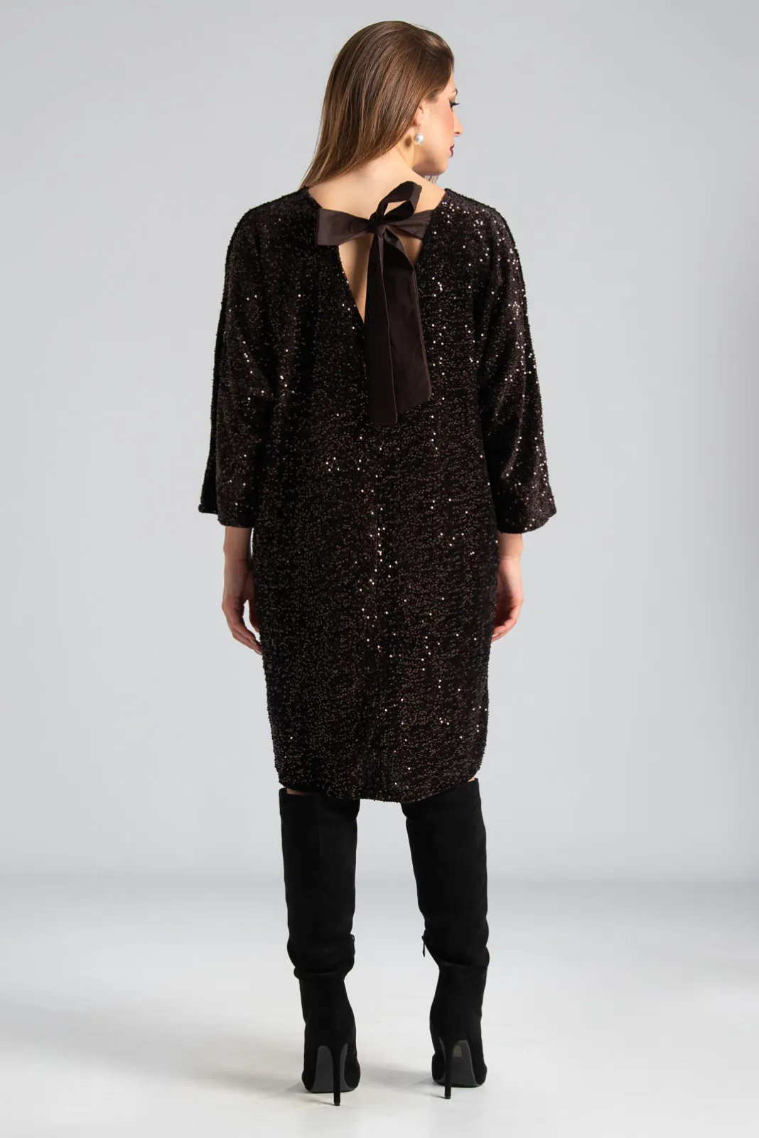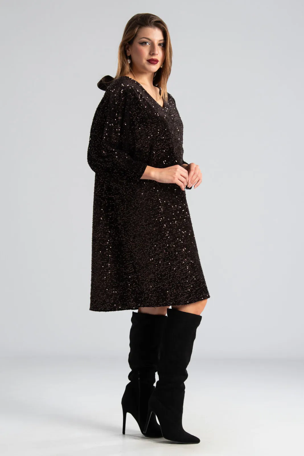 Φόρεμα mini velvet. Έχει V λαιμόκοψη και τα μανίκια είναι 3/4 τύπου νυχτερίδα. Σε όλη την επιφάνεια του είναι διακοσμημένο με παγιέτες. Εσωτερικά είναι φοδραρισμένο. Στο πίσω μέρος διαθέτει άνοιγμα και κορδέλα που δένει σε φιόγκο. Είναι ιδανικό για κάθε περίσταση. Οι μετρήσεις του πίνακα είναι αντιπροσωπευτικές για κάθε προϊόν.Φόρεμα: 95% polyester, 5% elastan. Φόδρα: 95% viscose, 5% elastan.