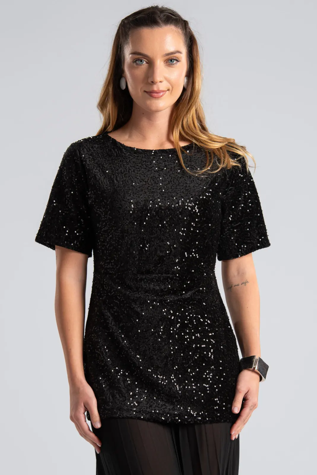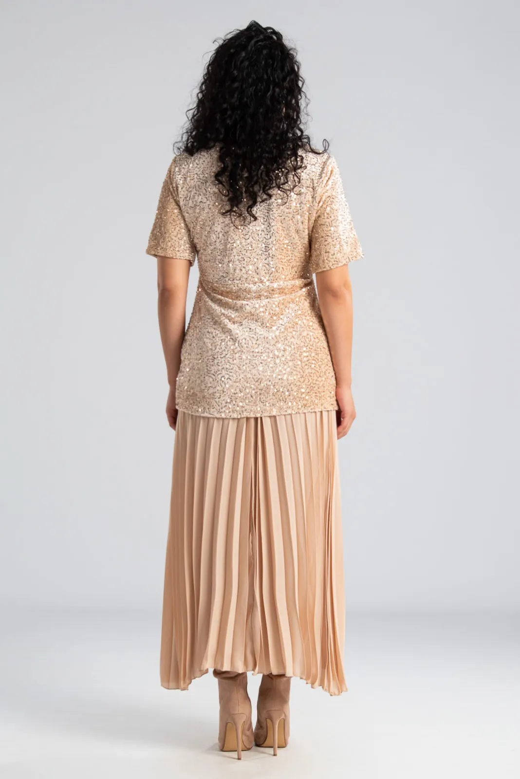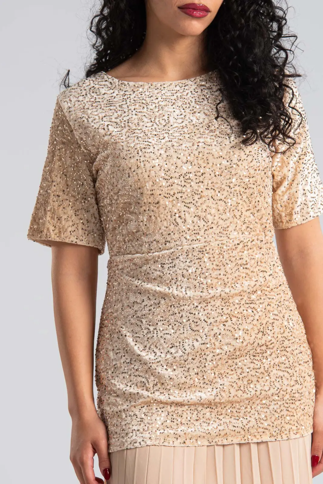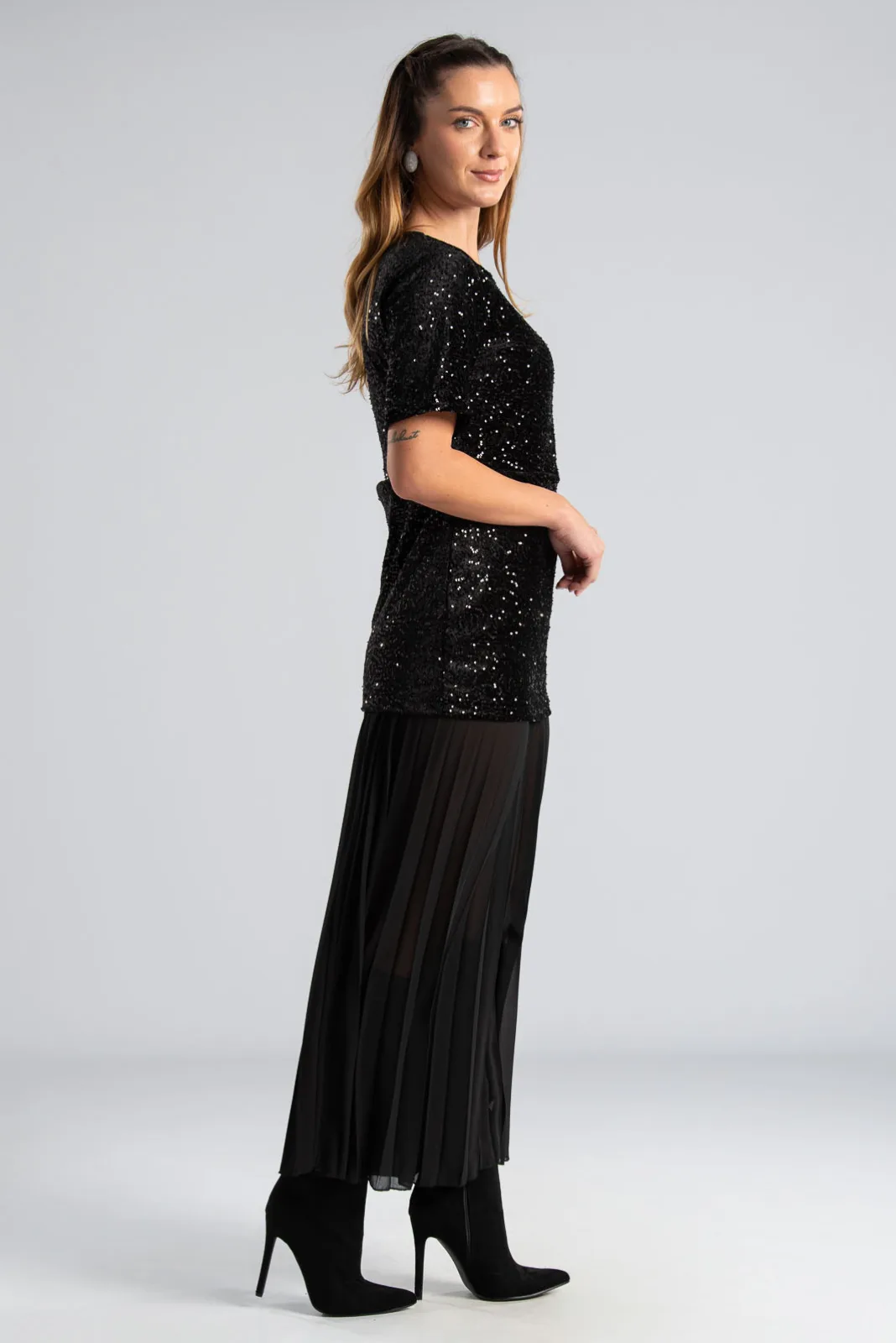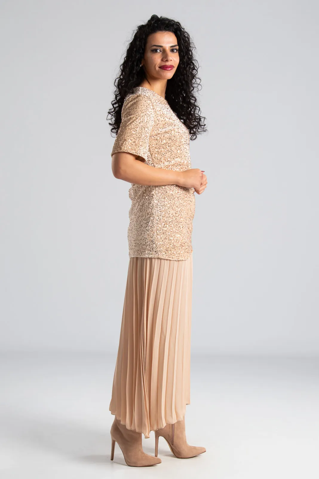 Φόρεμα maxi velvet. Είναι διακοσμημένο στο πάνω μέρος με παγιέτα. Στο κάτω μέρος είναι πλισέ. Έχει στρογγυλή λαιμόκοψη και μακριά μανίκια. Εσωτερικά είναι φοδραρισμένο στο πάνω μέρος. Είναι σε Α γραμμή. Είναι ιδανικό για κάθε περίσταση. Οι μετρήσεις του πίνακα είναι αντιπροσωπευτικές για κάθε προϊόν. 100% polyester.