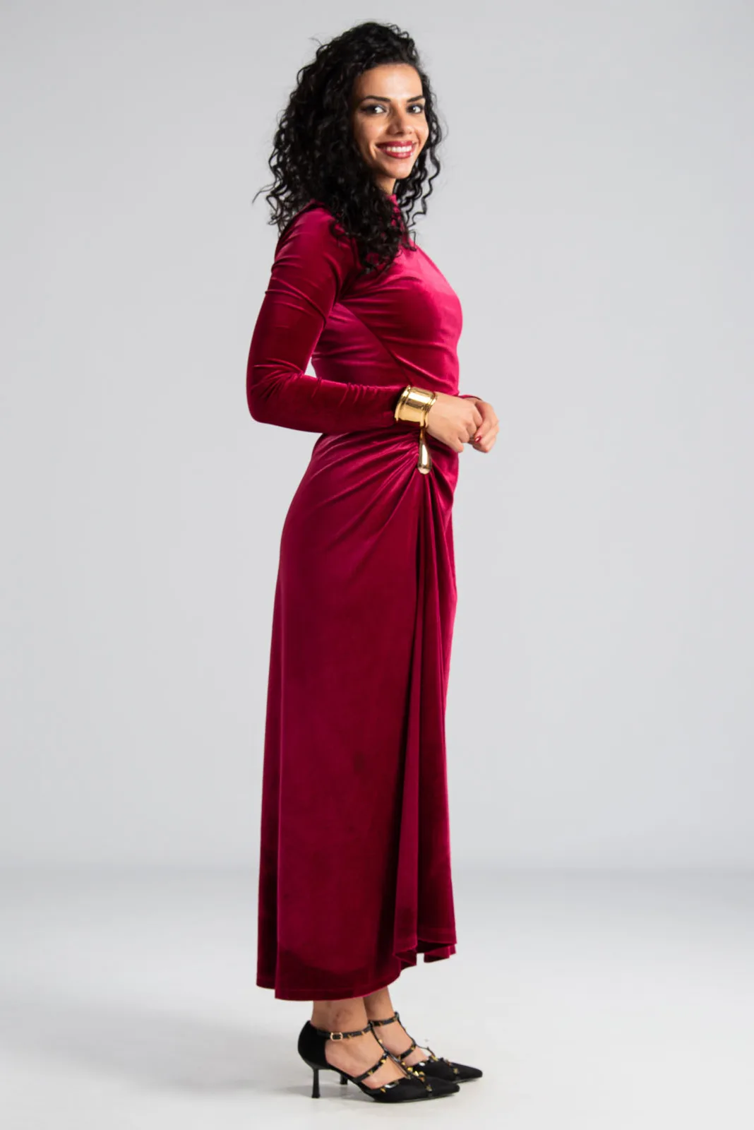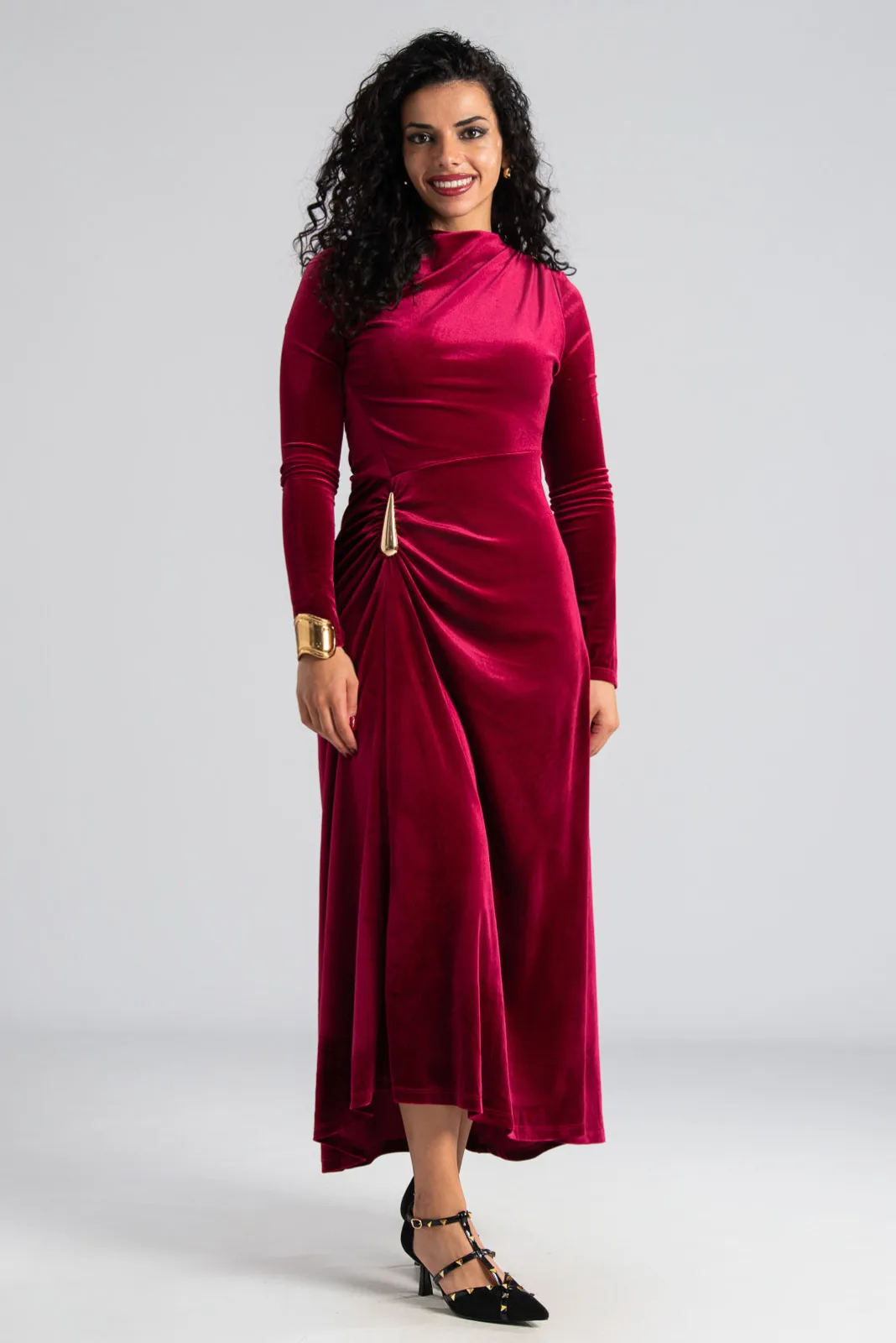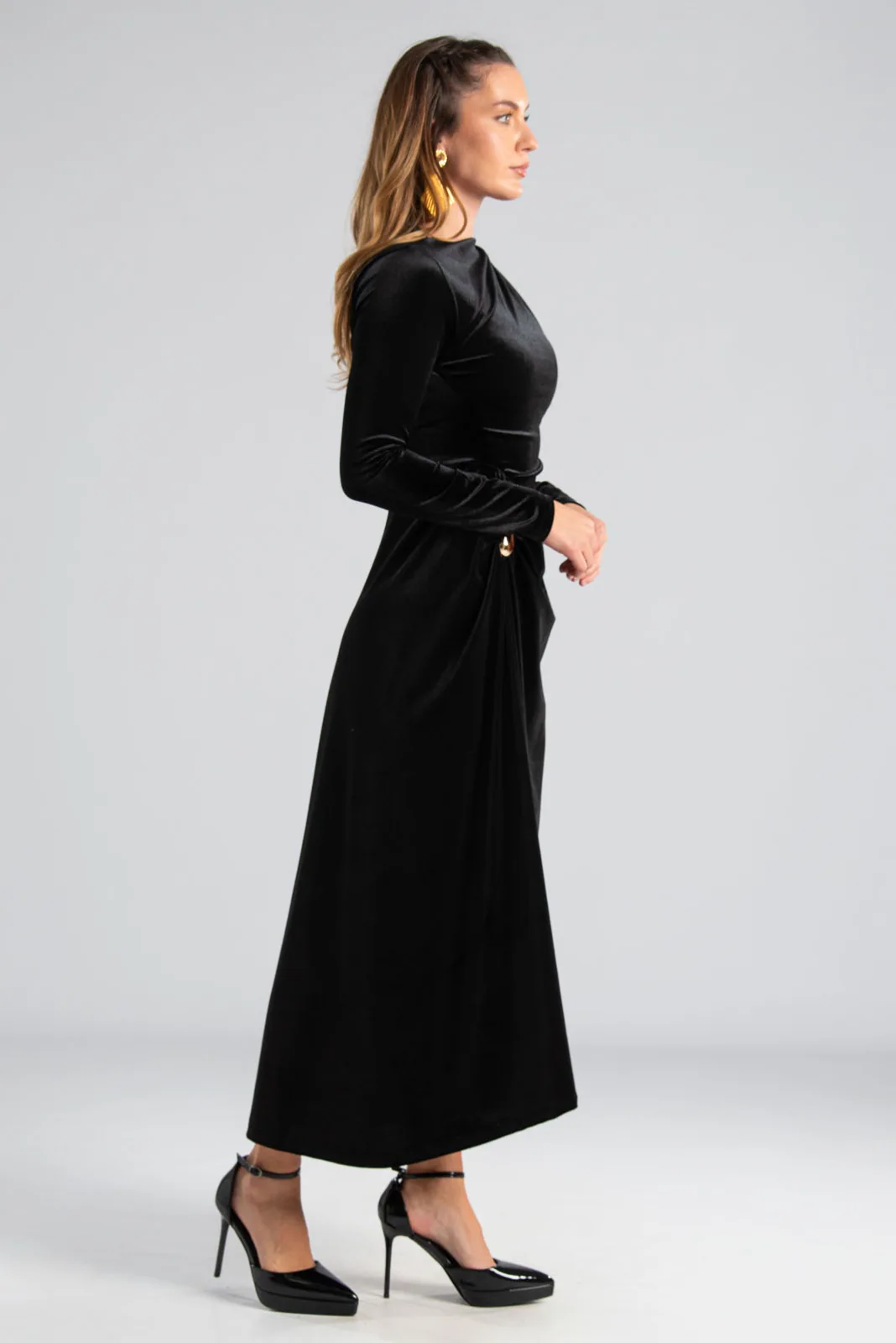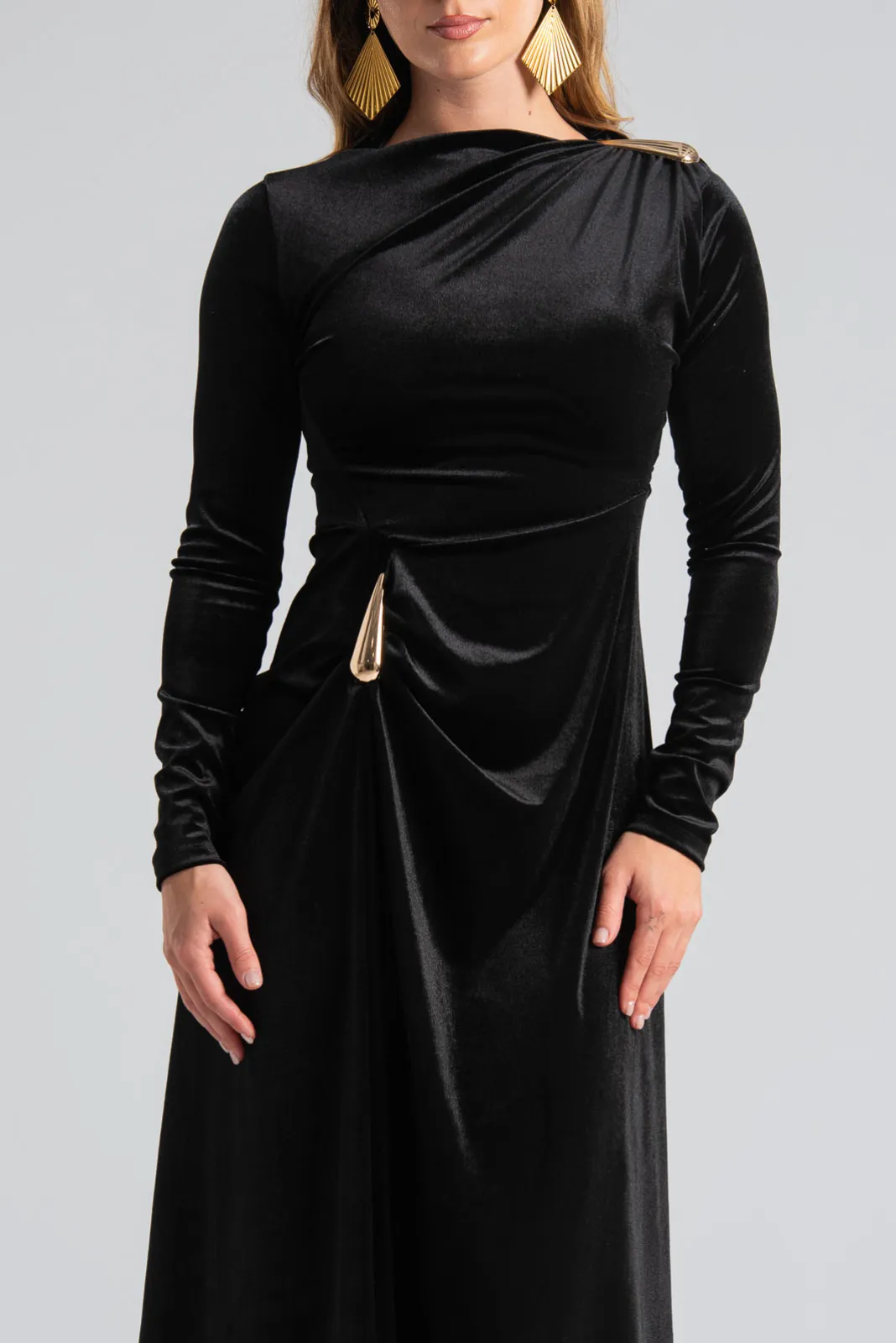 Φόρεμα maxi με μακριά μανίκια. Είναι velvet και έχει στη μέση και στον ώμο διακοσμητική μεταλλική λεπτομέρεια. Στο πλάι έχει σούρα. Στο τελείωμα είναι ελαφρώς ασύμμετρο και το πίσω μέρος είναι πιο μακρύ. Οι μετρήσεις του πίνακα είναι αντιπροσωπευτικές για κάθε κωδικό. 95% polyester, 5% elastan.