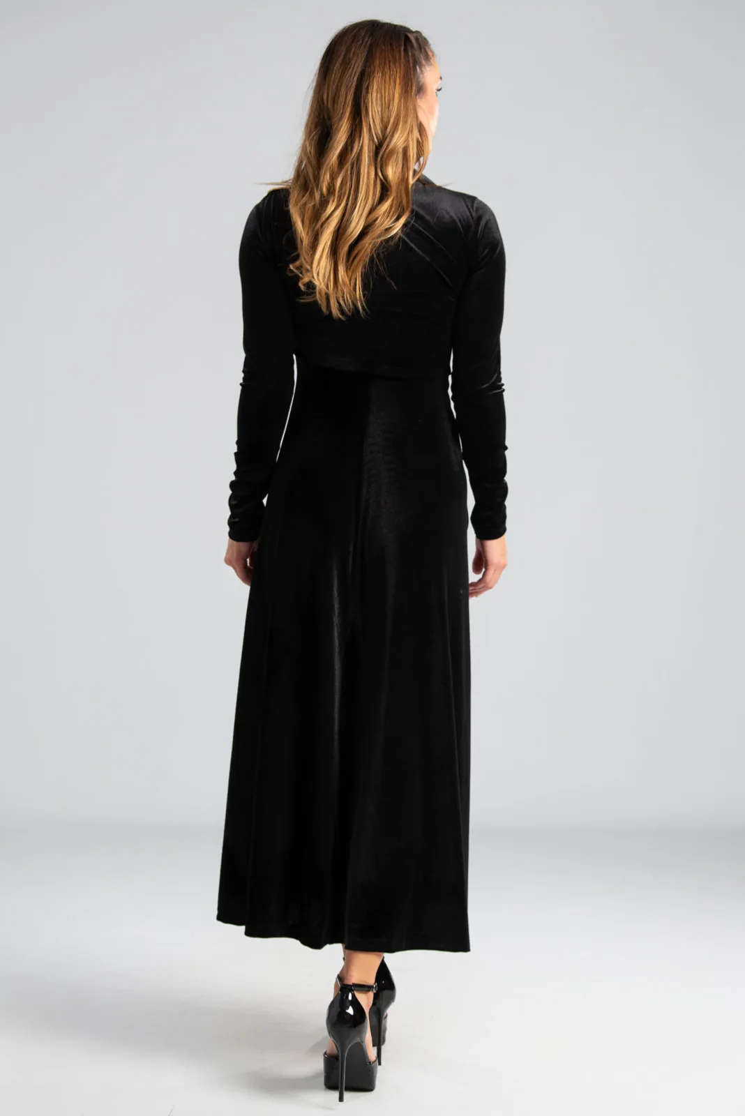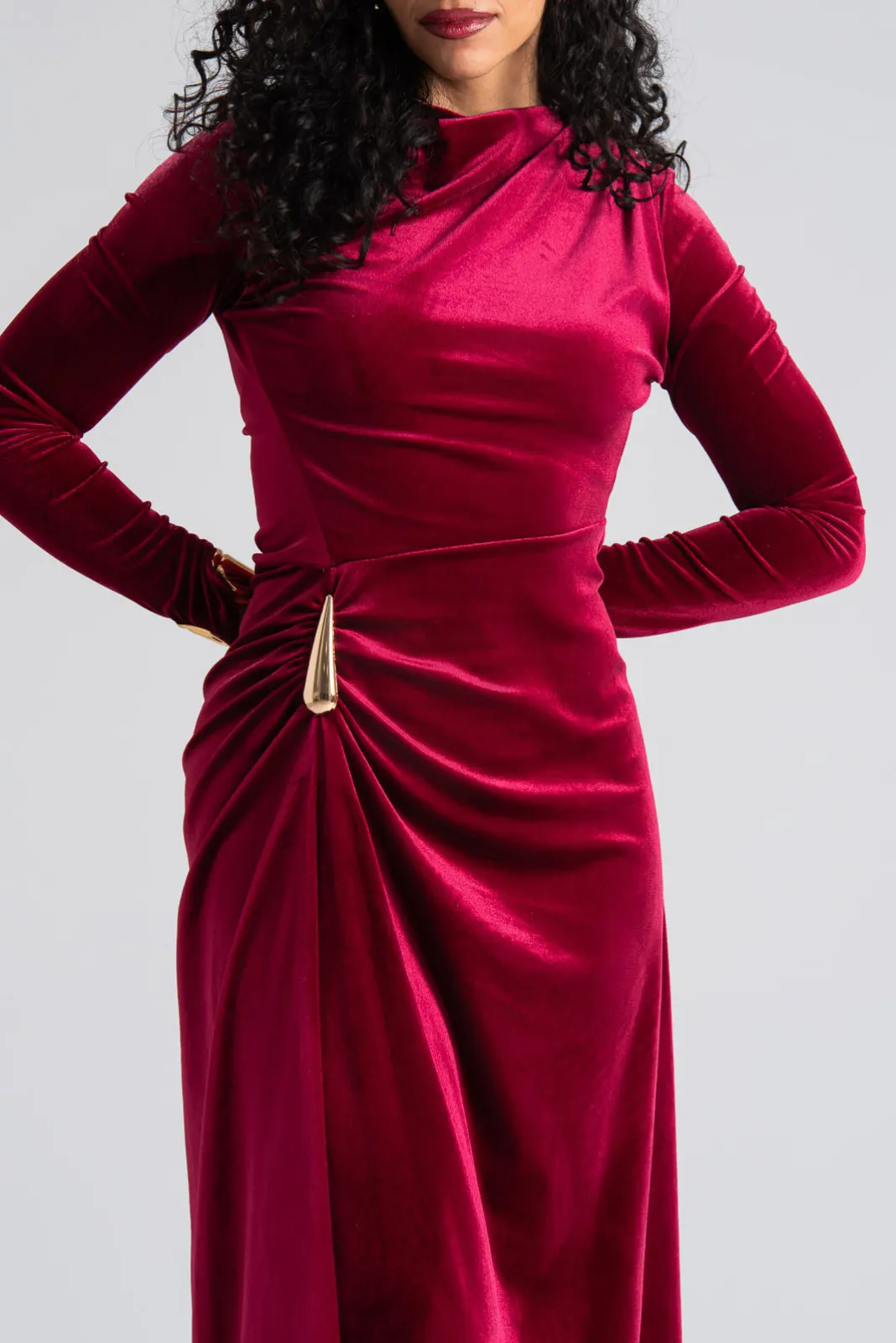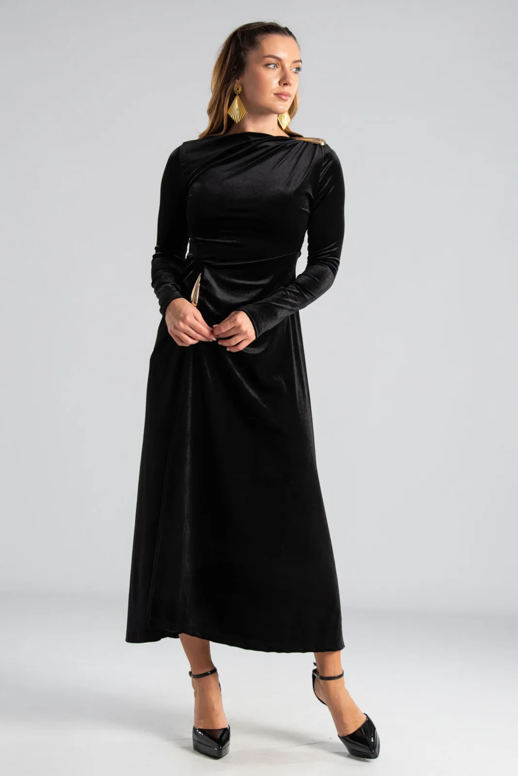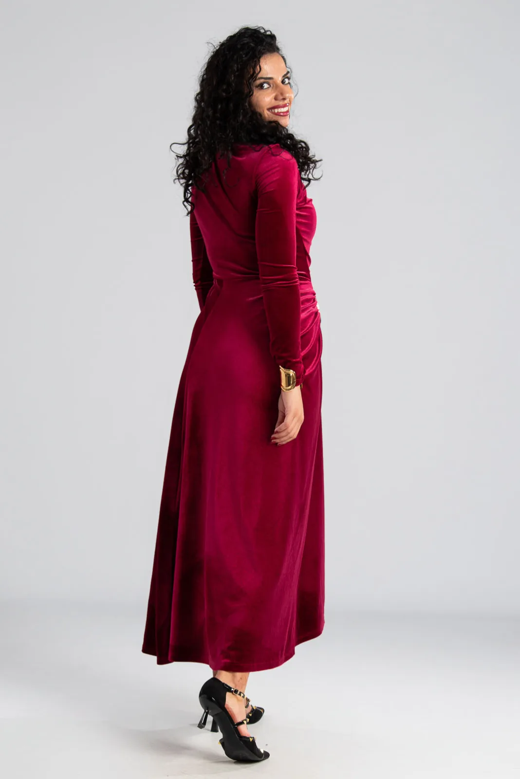 Φόρεμα maxi με μακριά μανίκια. Είναι velvet και έχει στη μέση και στον ώμο διακοσμητική μεταλλική λεπτομέρεια. Στο πλάι έχει σούρα. Στο τελείωμα είναι ελαφρώς ασύμμετρο και το πίσω μέρος είναι πιο μακρύ. Οι μετρήσεις του πίνακα είναι αντιπροσωπευτικές για κάθε κωδικό. 95% polyester, 5% elastan.