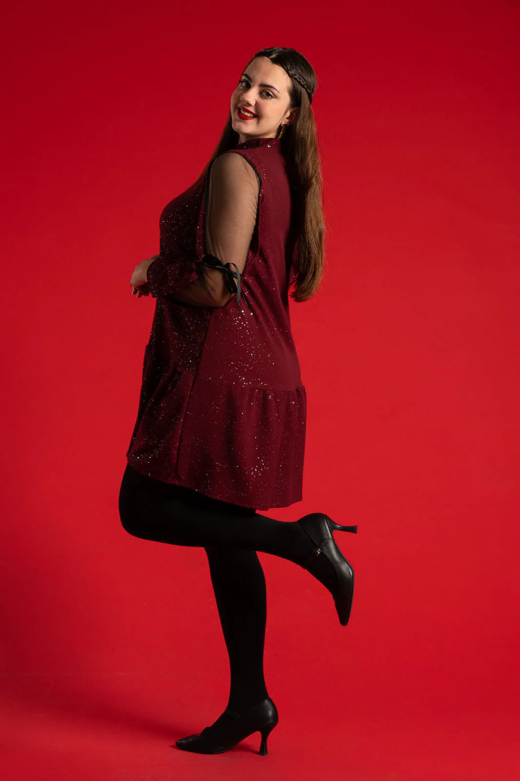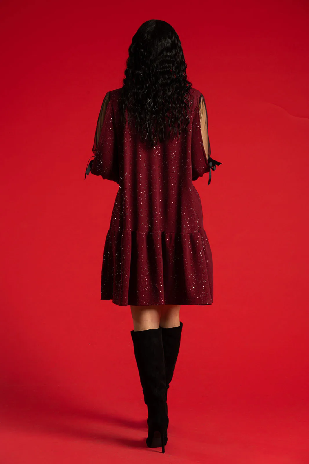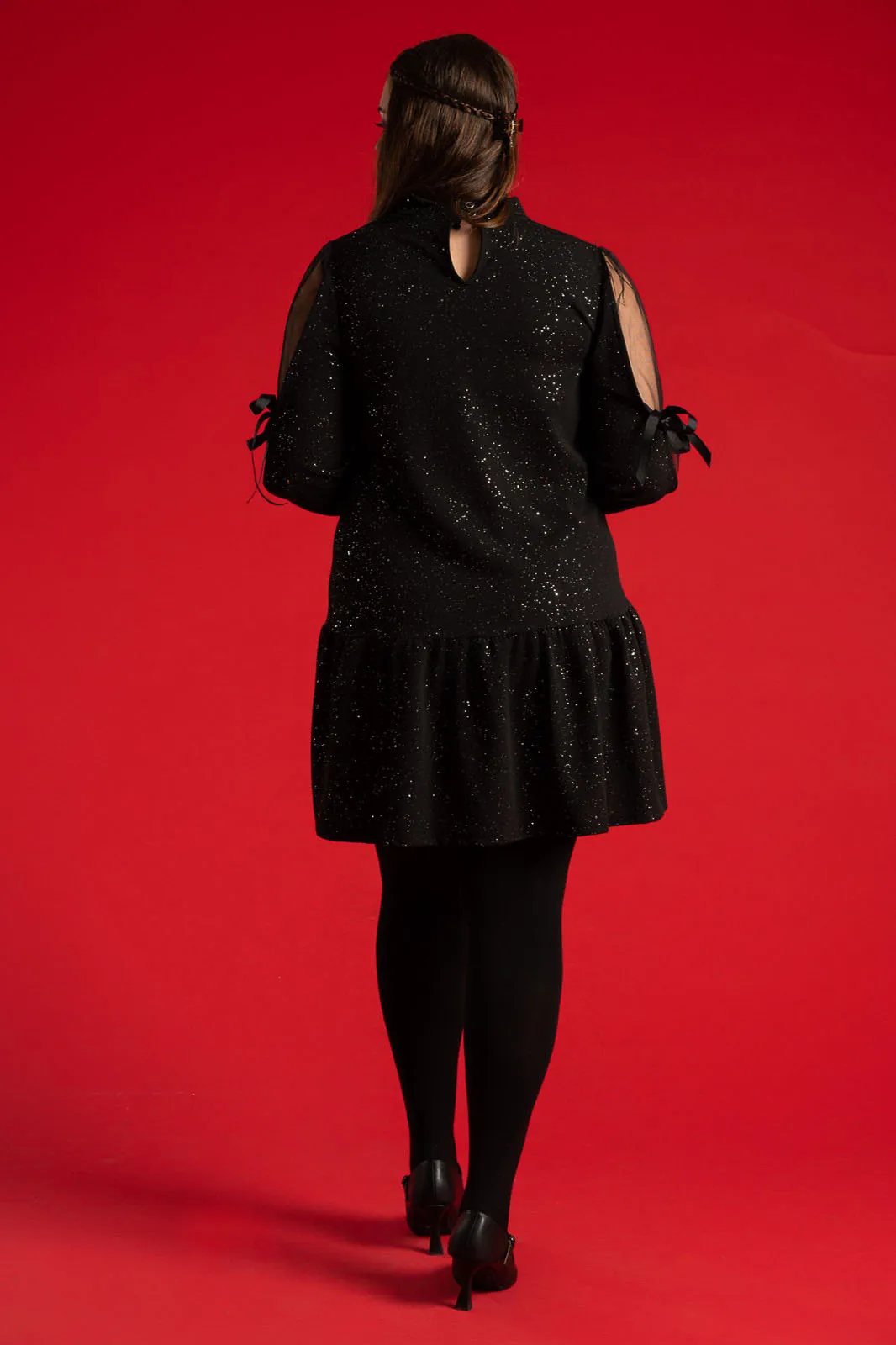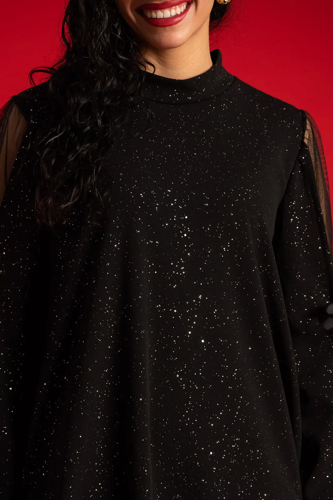Dress with a round neckline. It fastens at the back of the neckline with two buttons. It has long sleeves with tulle overlay on the upper arm that ties with a bow. The entire surface is covered with sparkling embellishments. It ends in a ruffle. The measurements in the table are representative for each code. 95% polyester, 5% elastane.