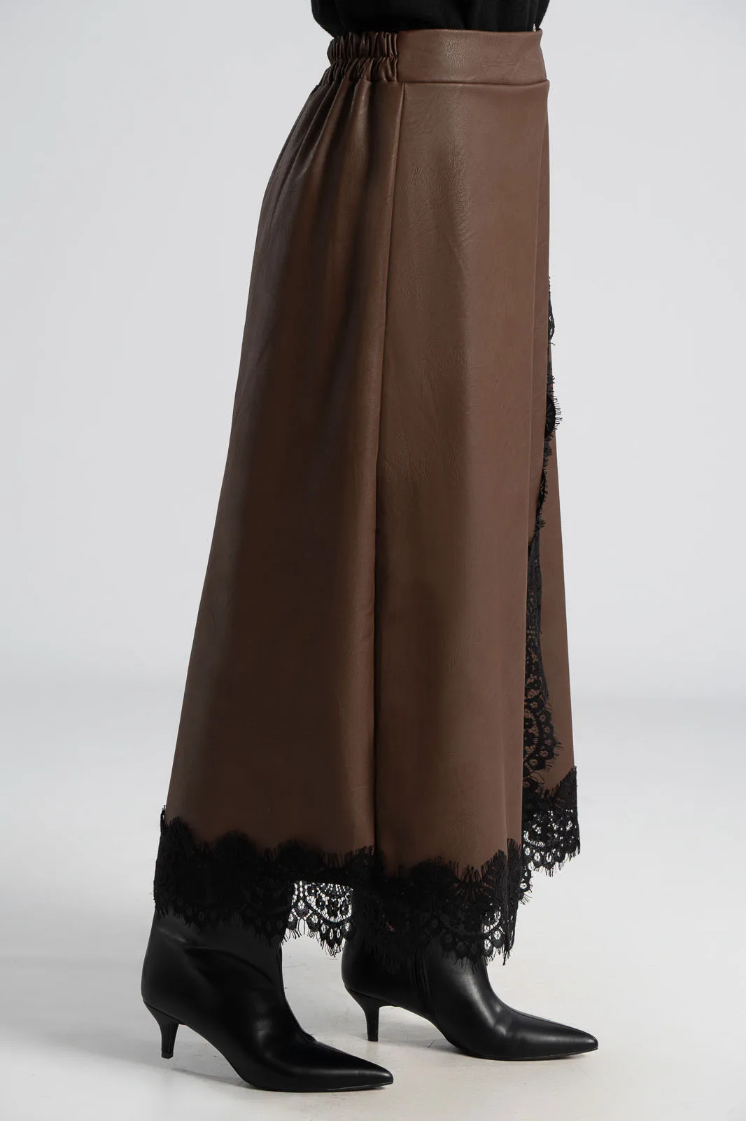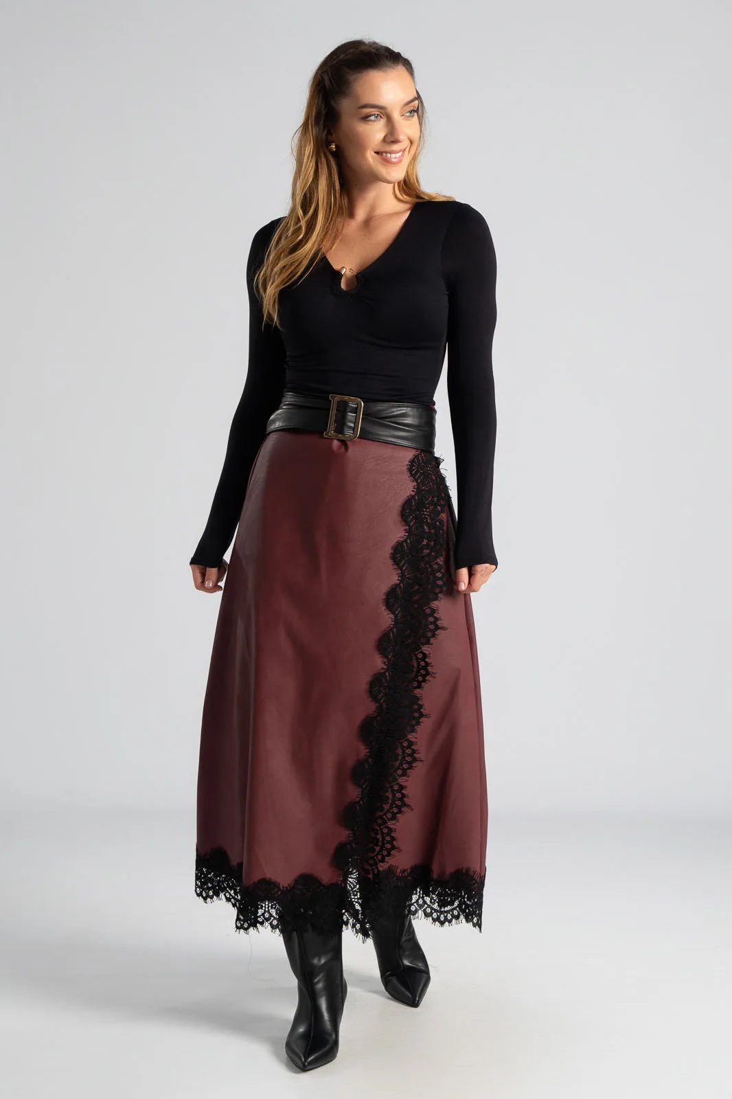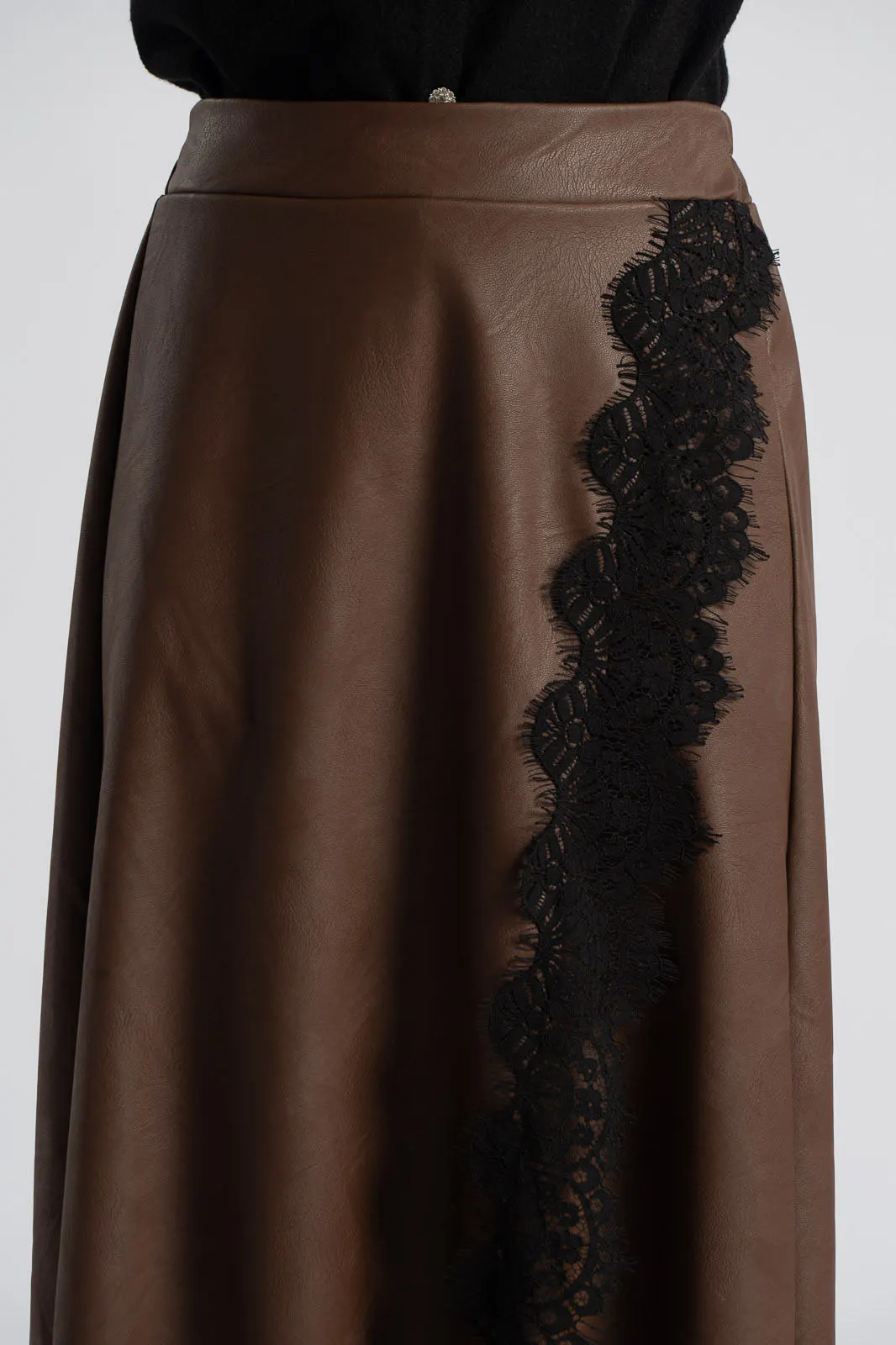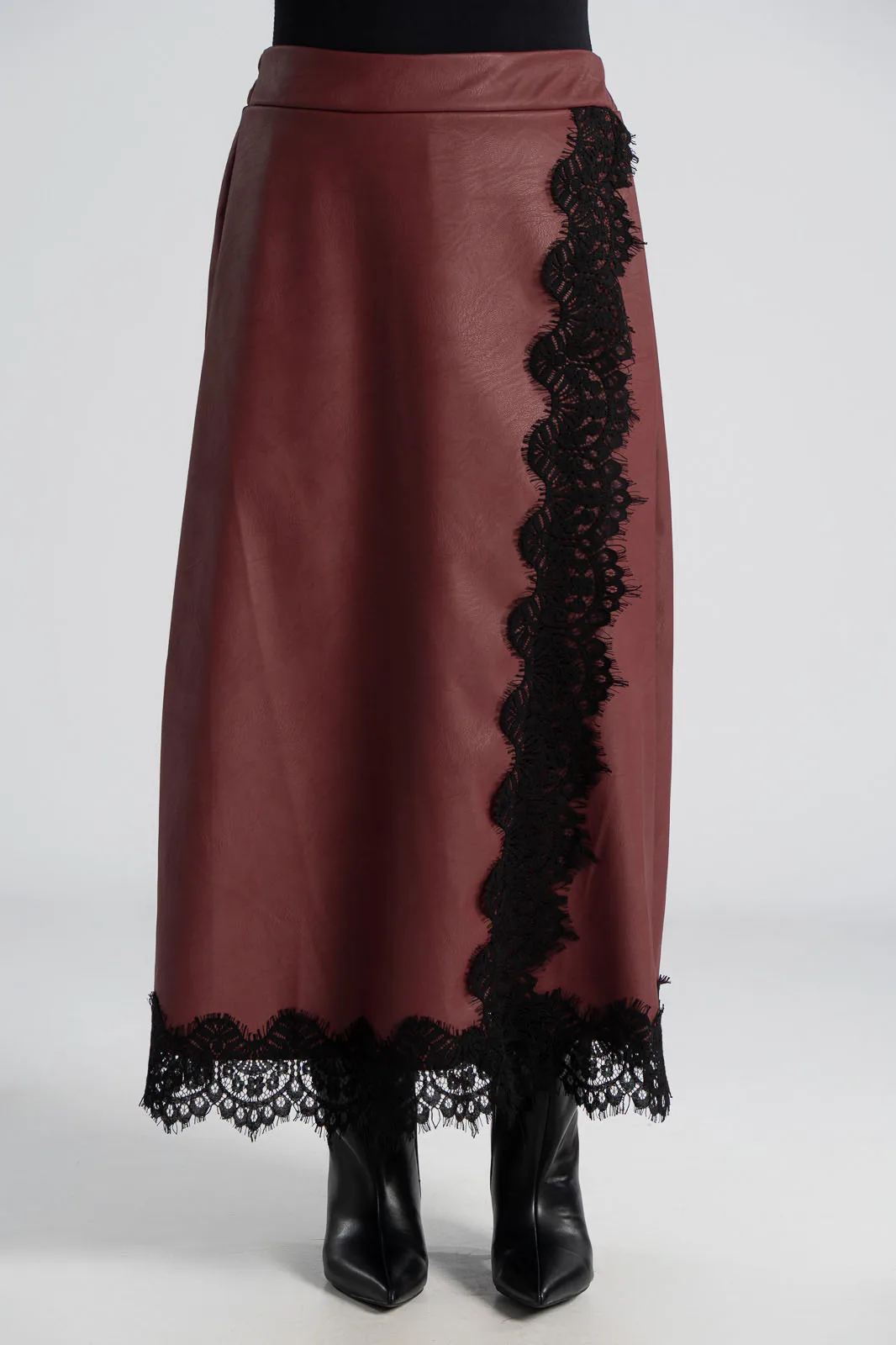 Skirt made of high-quality leatherette. It has elastic at the back for a better fit. The hem and sides feature lace detailing that ends in a small opening at the hem. There is an opening at the front. The measurements in the table are representative of each product. 76% viscose, 19% polyamide, 5% elastane.