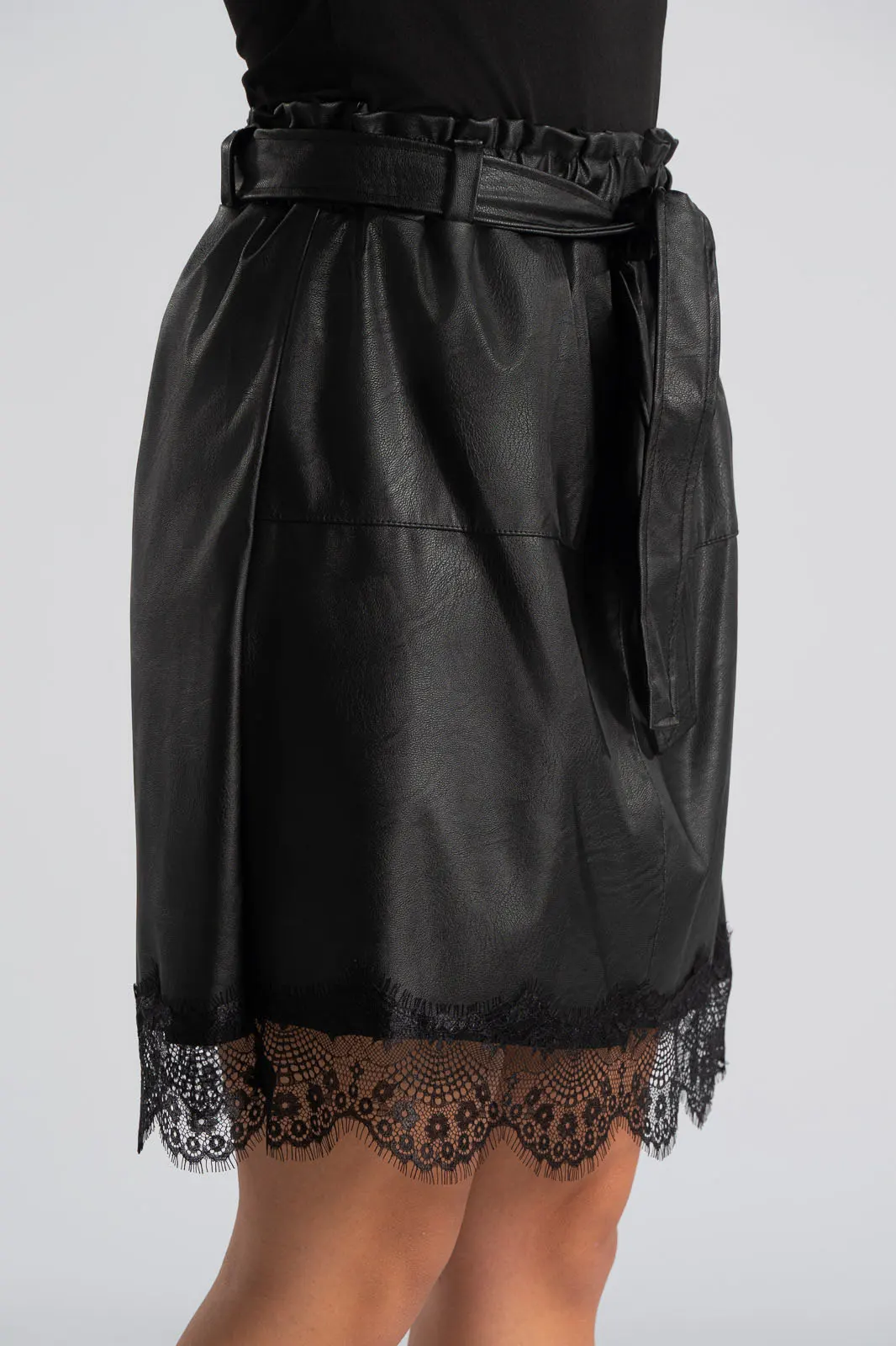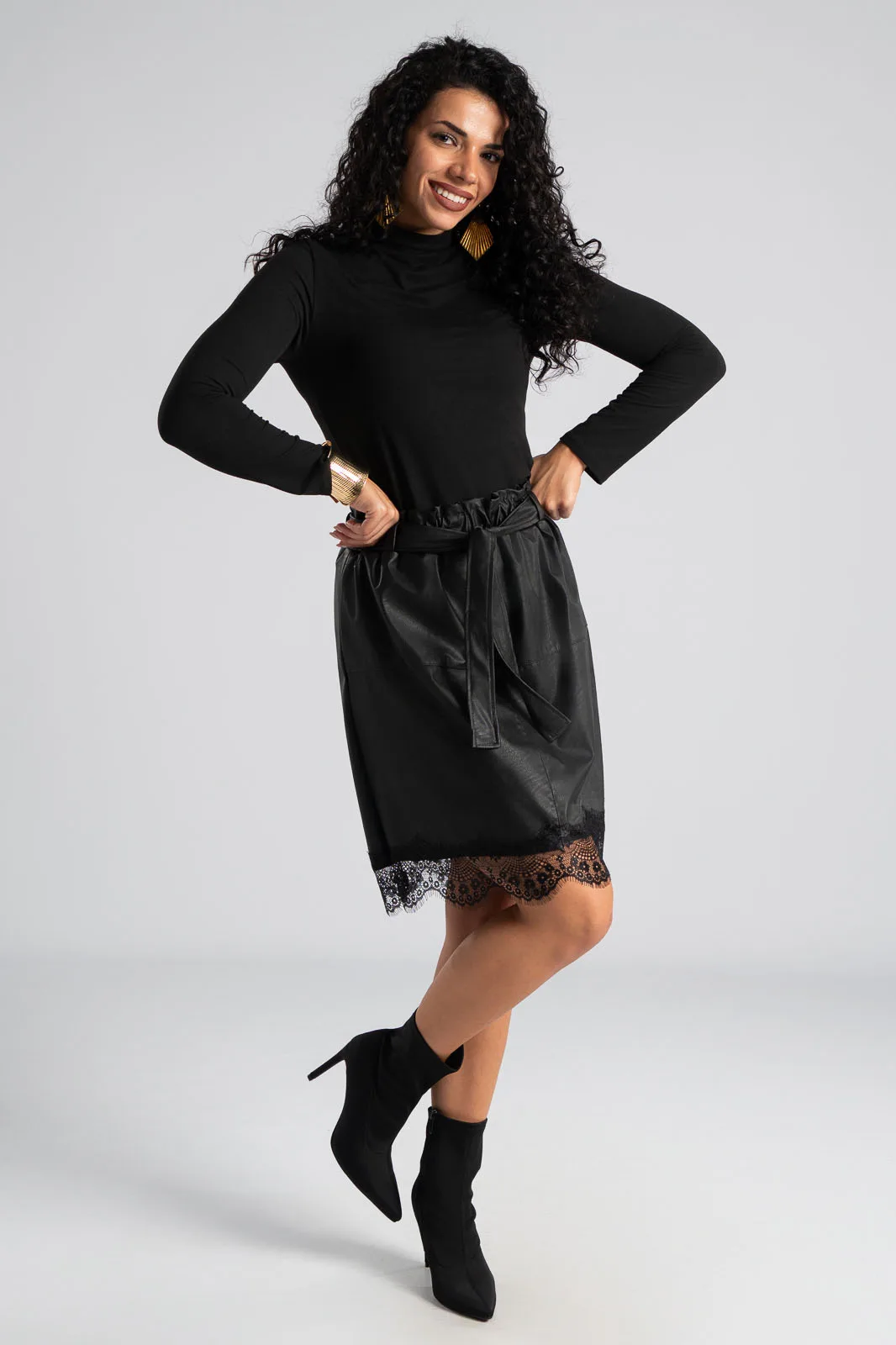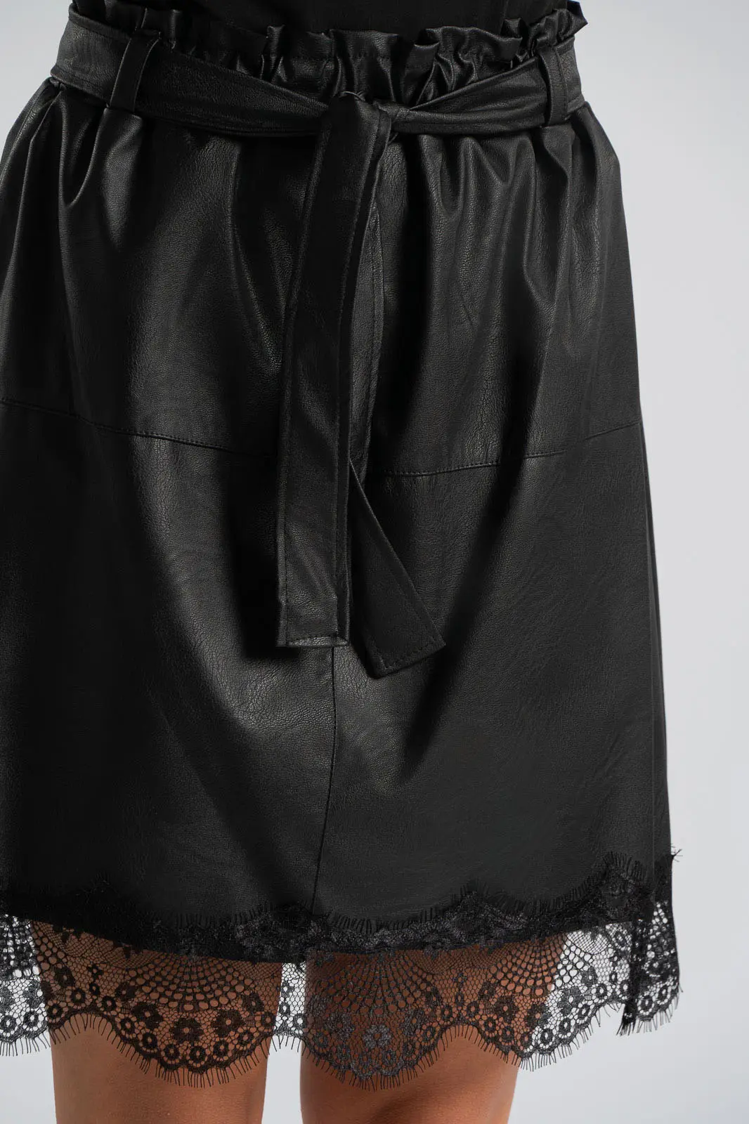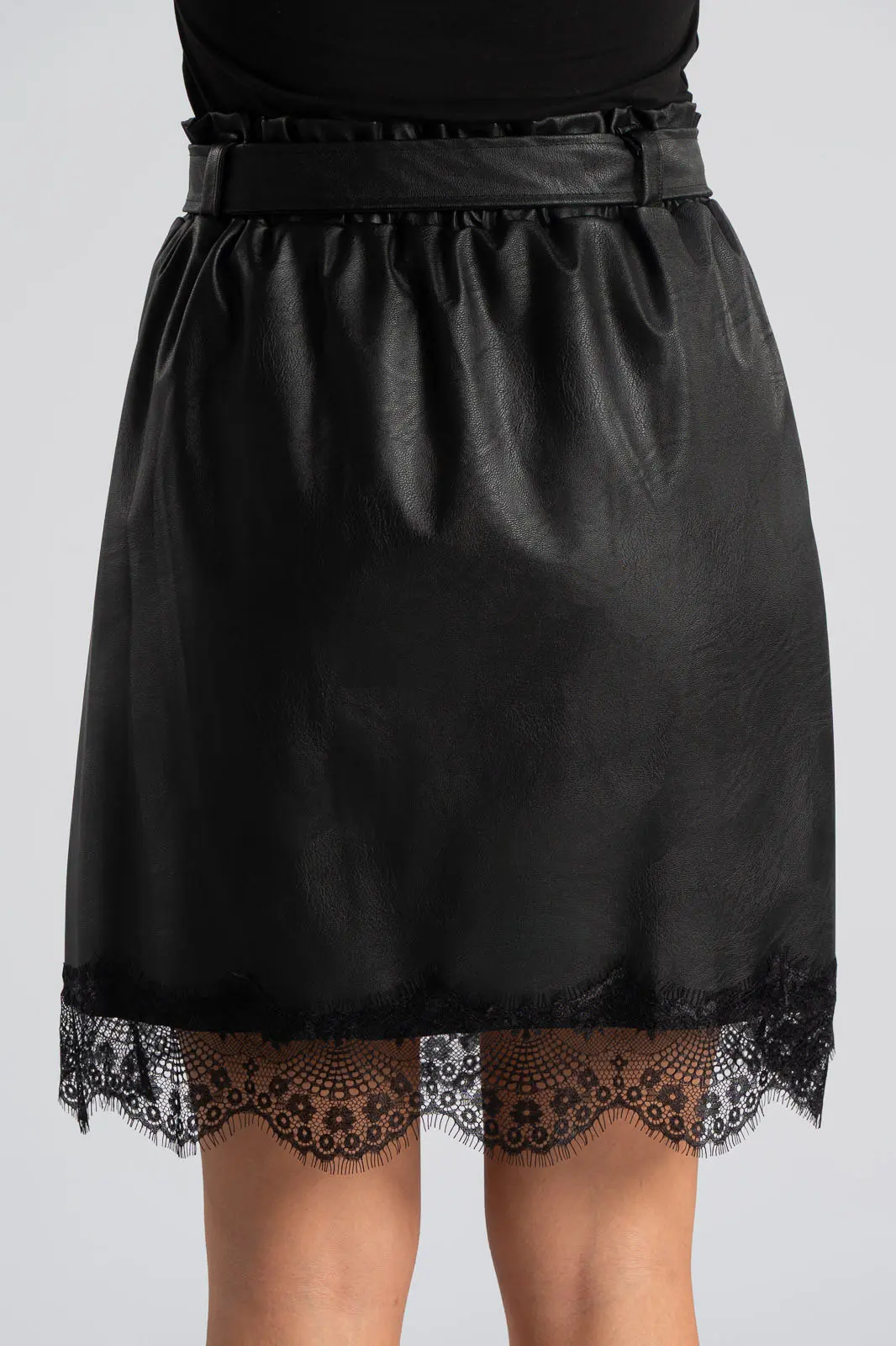 Φούστα mini με λάστιχο στη μέση περιμετρικά για καλύτερη εφαρμογή. Είναι δερματίνη και έχει δική της ζώνη με το ίδιο ύφασμα. Στο τελείωμα της διαθέτει δαντέλα. Είναι μια ιδανική επιλογή για κάθε περίσταση. Οι μετρήσεις του πίνακα είναι αντιπροσωπευτικές για κάθε κωδικό. 75% viscose, 19% polyamide, 5% elastan.
