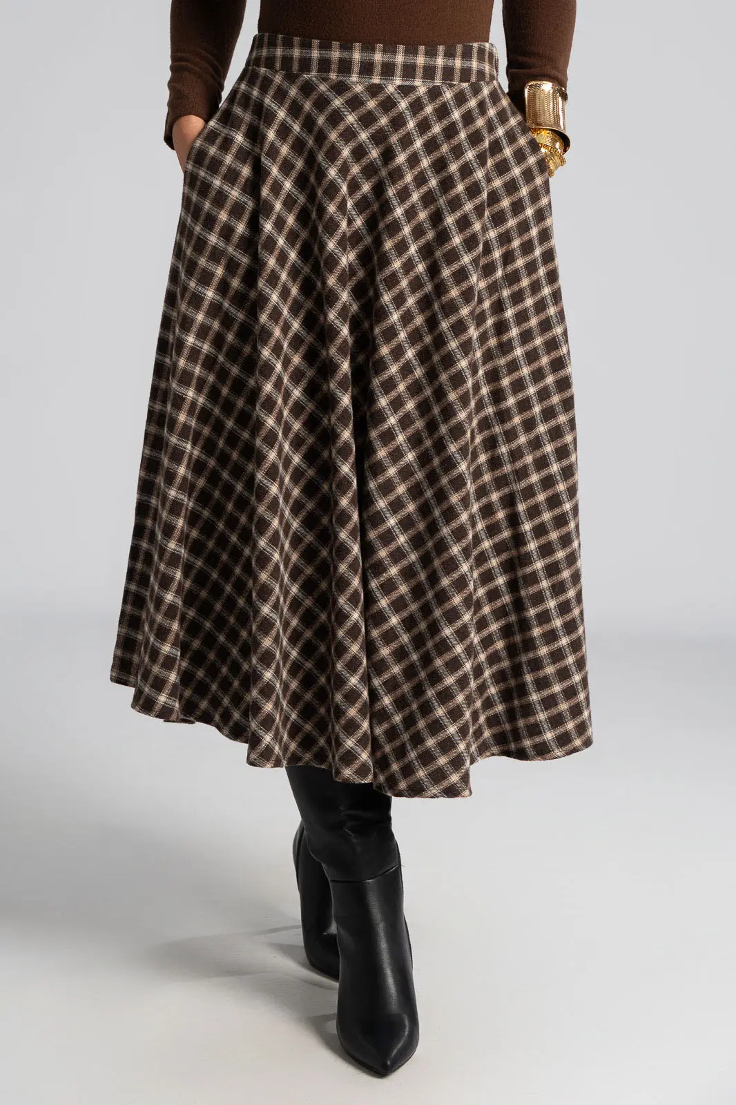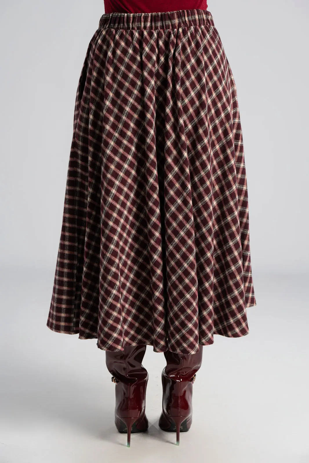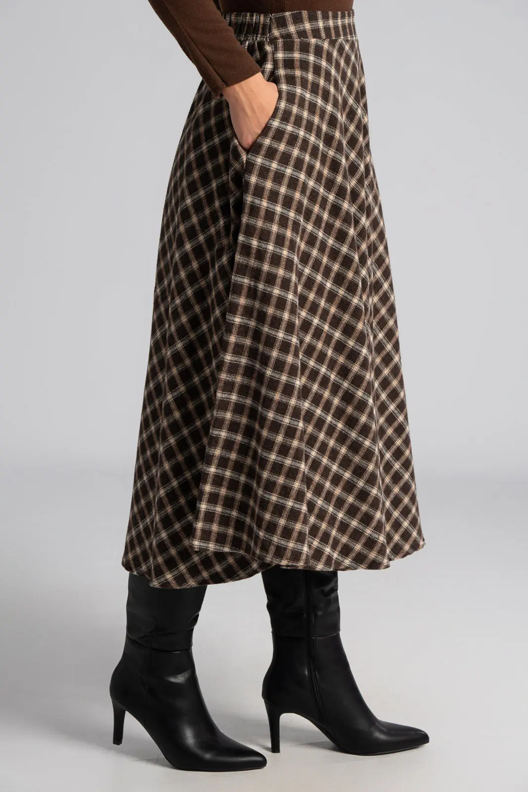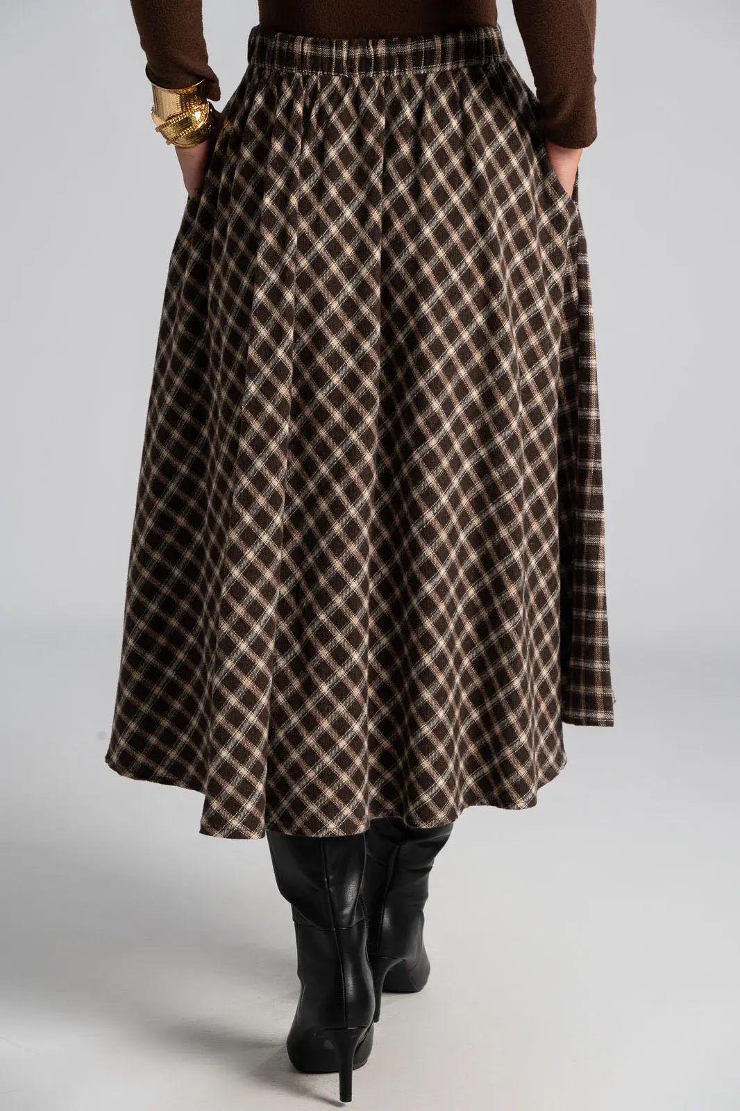 Φούστα που διαθέτει στο πίσω μέρος λάστιχο. Είναι σε Α γραμμή, σε ύφος κλος. Στα πλαινά έχει τσέπες. Σε όλη την επιφάνεια έχει καρώ σχέδιο. Οι μετρήσεις του πίνακα είναι αντιπροσωπευτικές για κάθε προϊόν. 33% viscose, 65% polyester, 2% elastan.