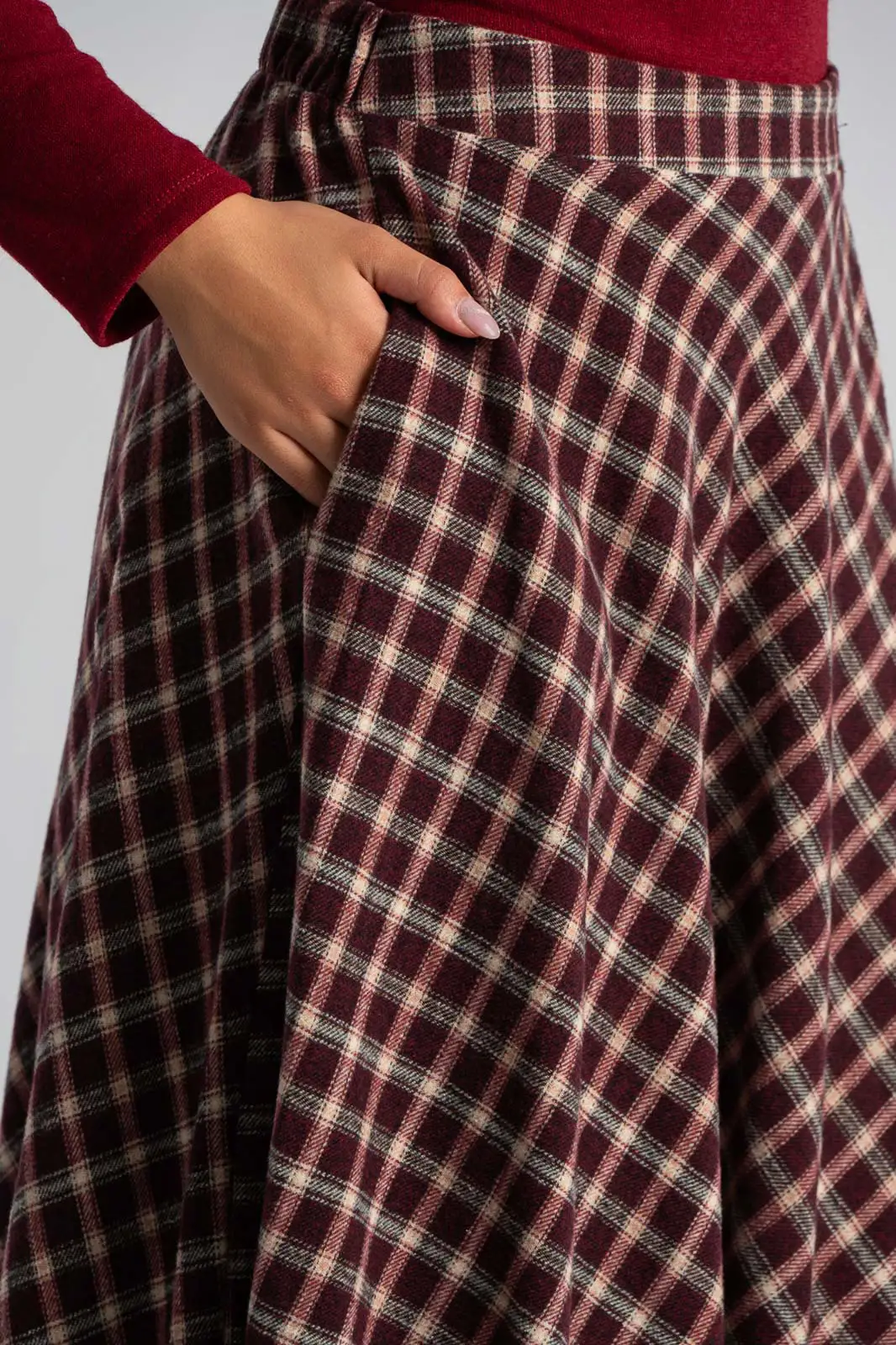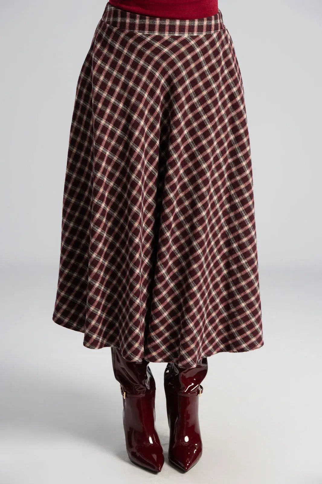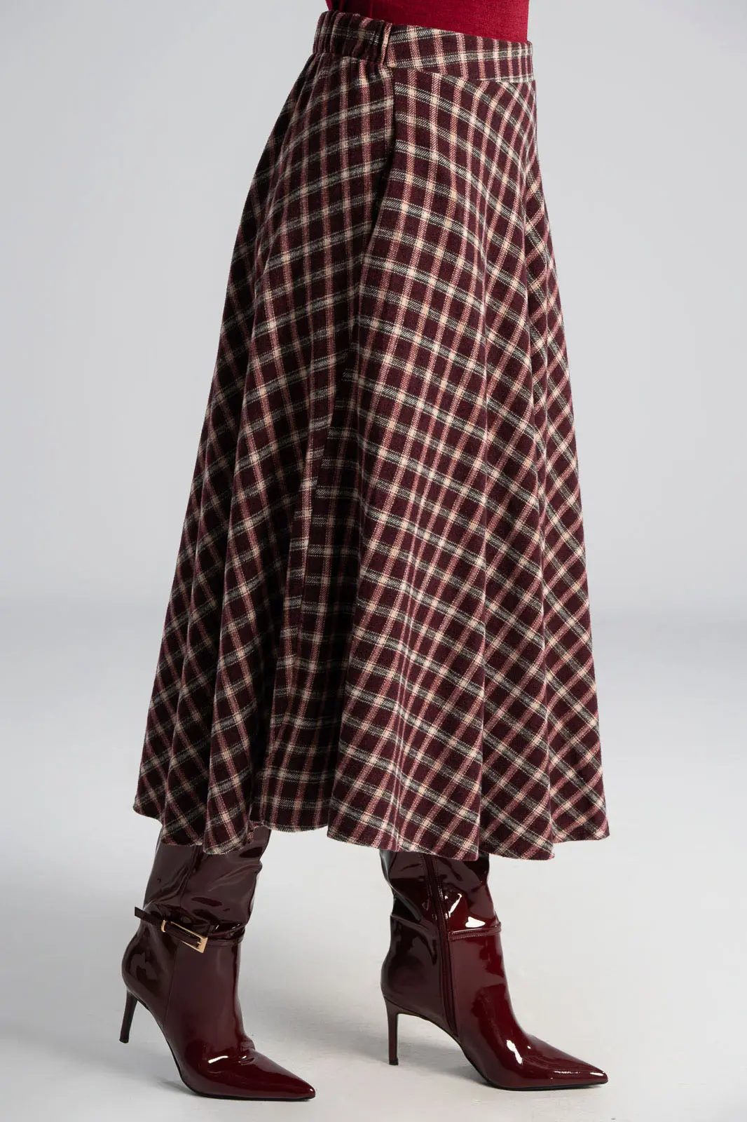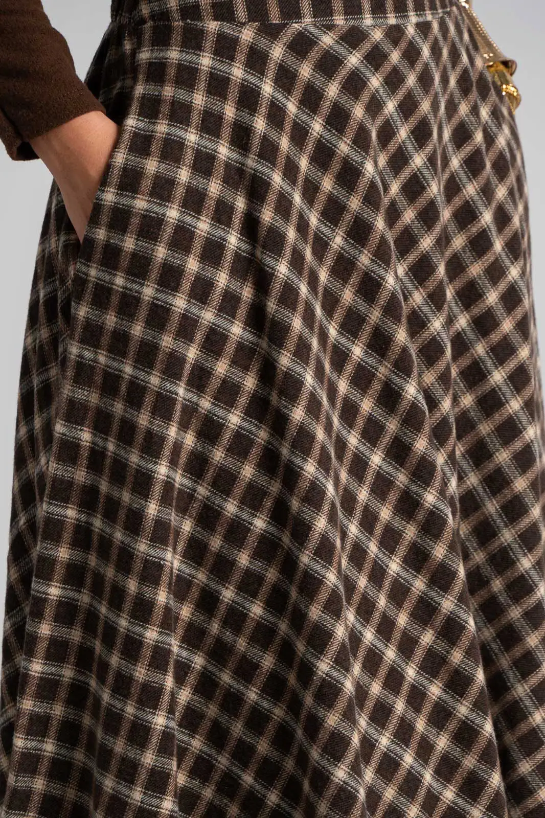 Φούστα που διαθέτει στο πίσω μέρος λάστιχο. Είναι σε Α γραμμή, σε ύφος κλος. Στα πλαινά έχει τσέπες. Σε όλη την επιφάνεια έχει καρώ σχέδιο. Οι μετρήσεις του πίνακα είναι αντιπροσωπευτικές για κάθε προϊόν. 33% viscose, 65% polyester, 2% elastan.