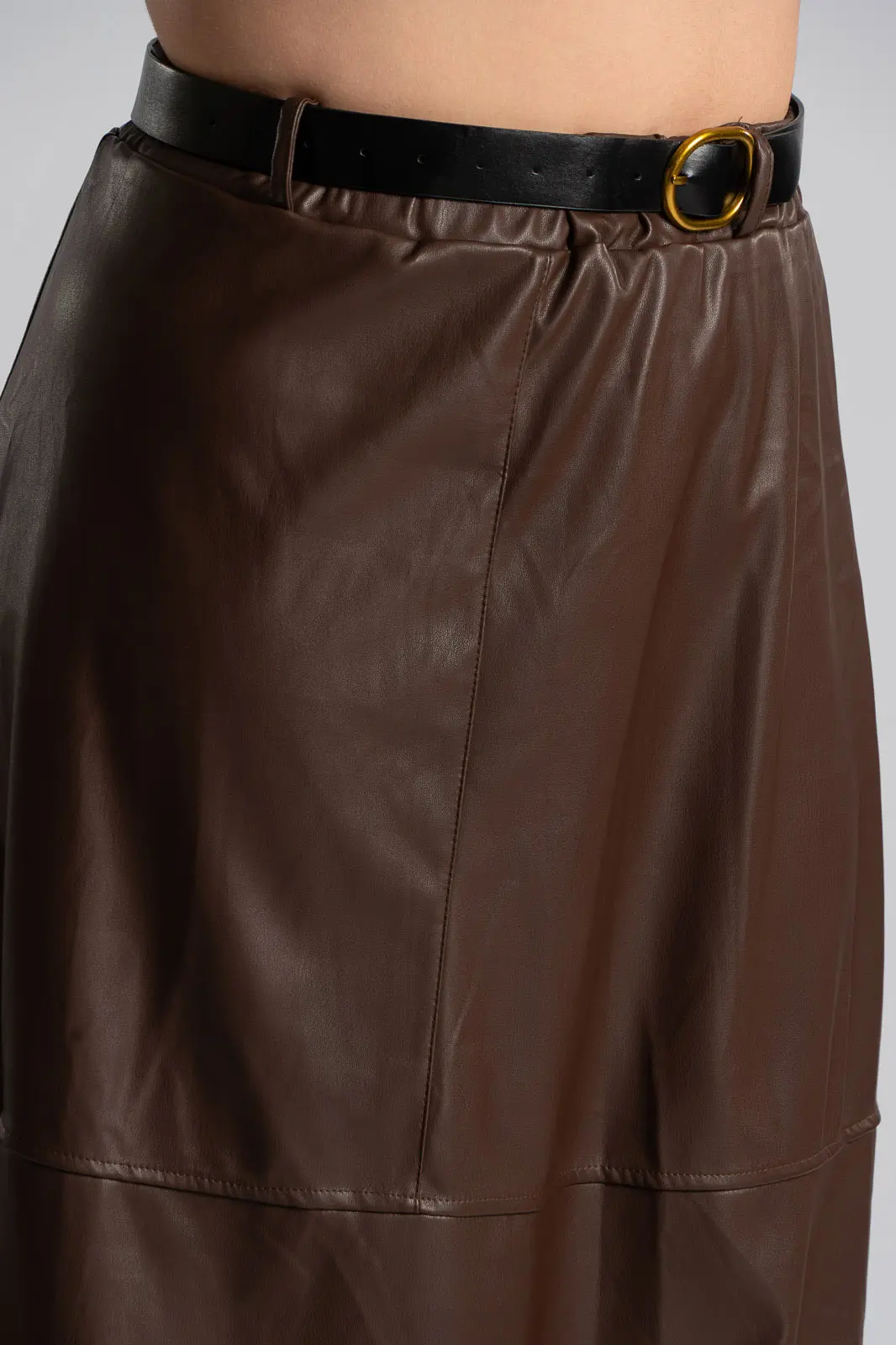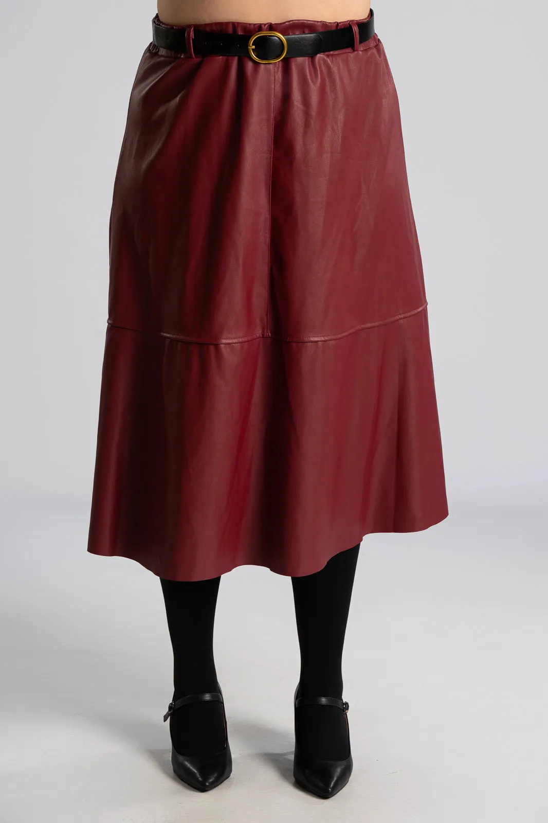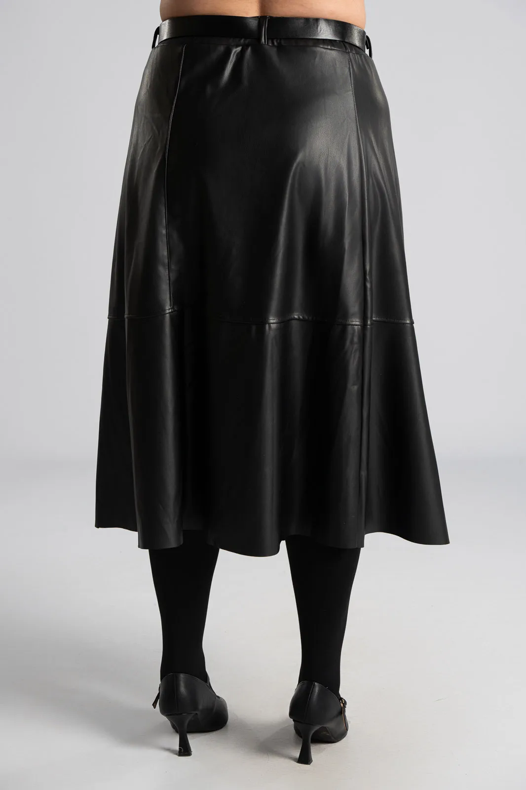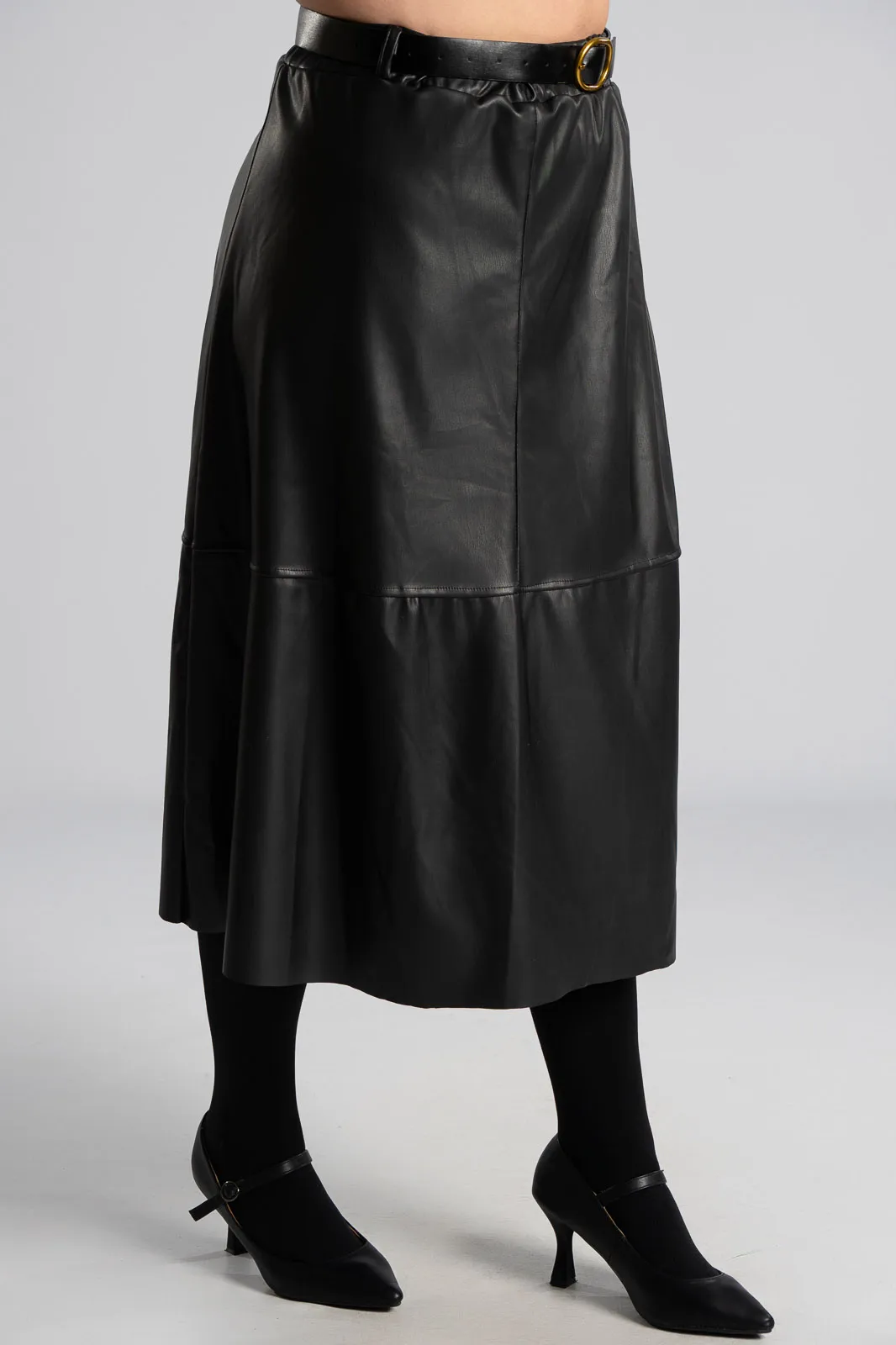 Φούστα δερματίνη σε Α γραμμή. Στη μέση διαθέτει λάστιχο περιμετρικά για καλύτερη εφαρμογή και δική της ζώνη τύπου δερματίνη. Είναι midi. Εσωτερικά έχει την υφή μαλακής τσόχας. Οι μετρήσεις του πίνακα είναι αντιπροσωπευτικές για κάθε προϊόν. 60% polyurethane, 40%polyester.