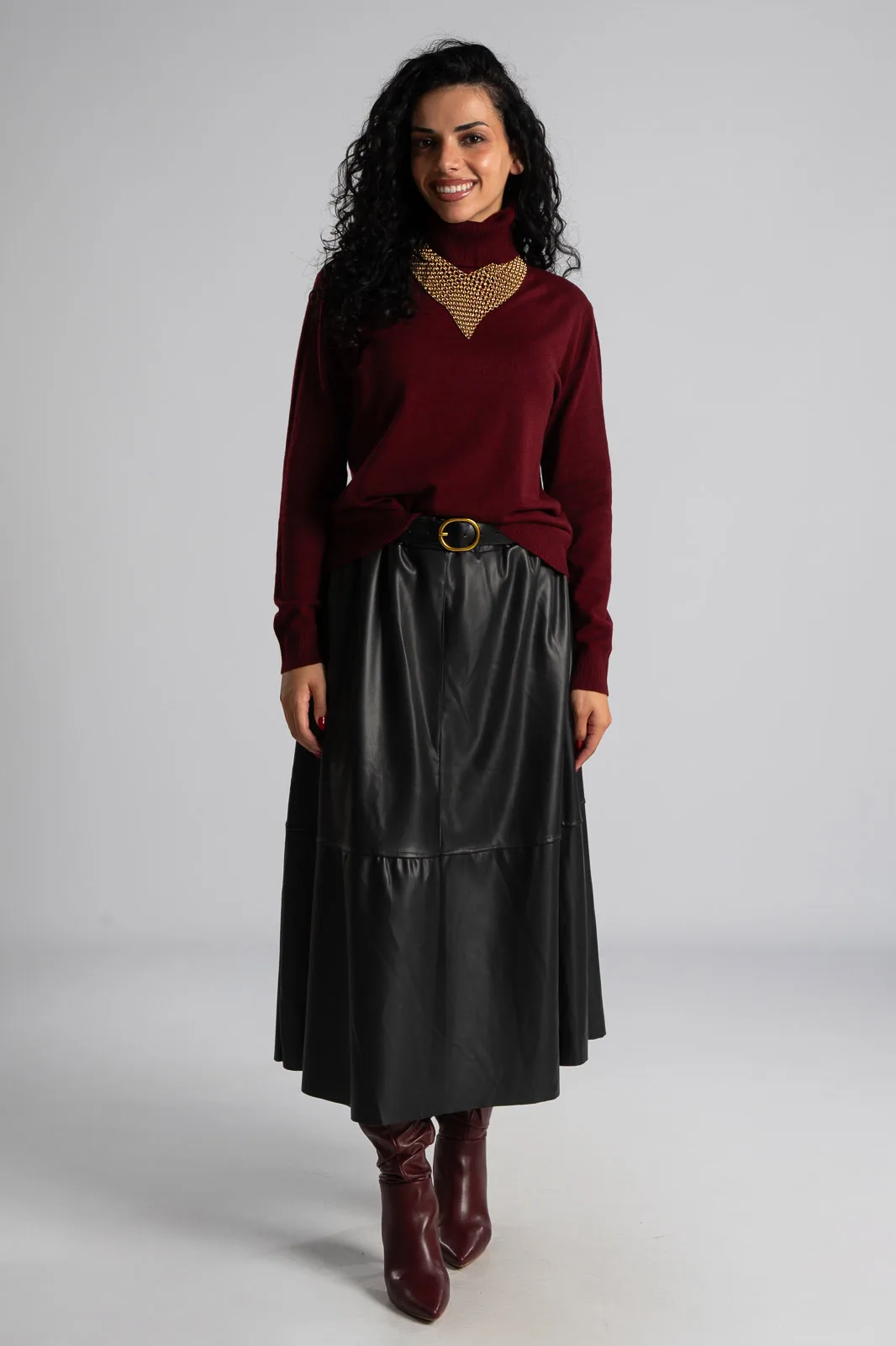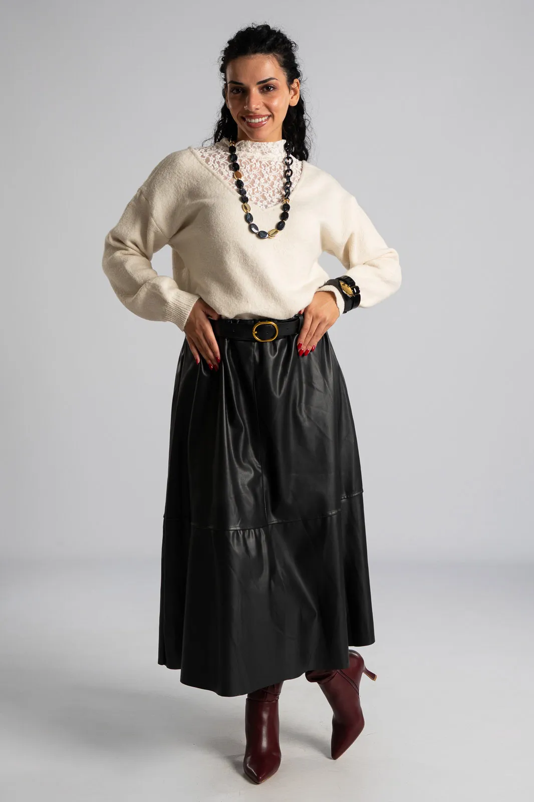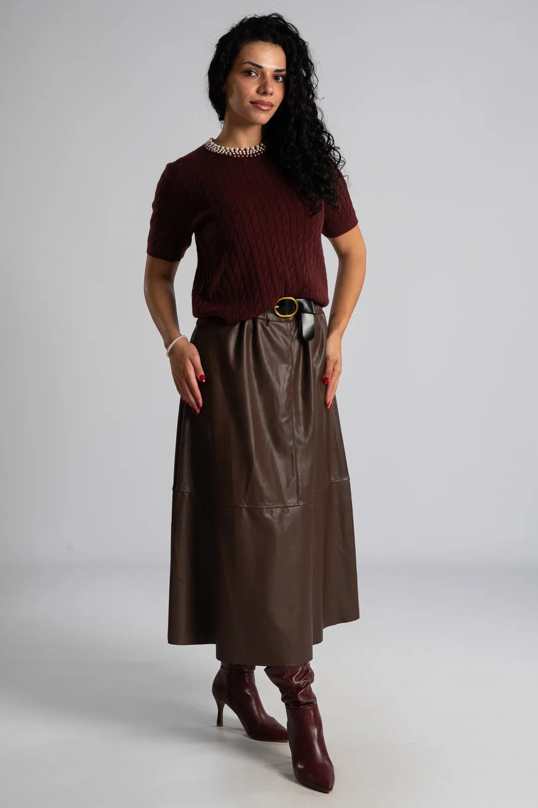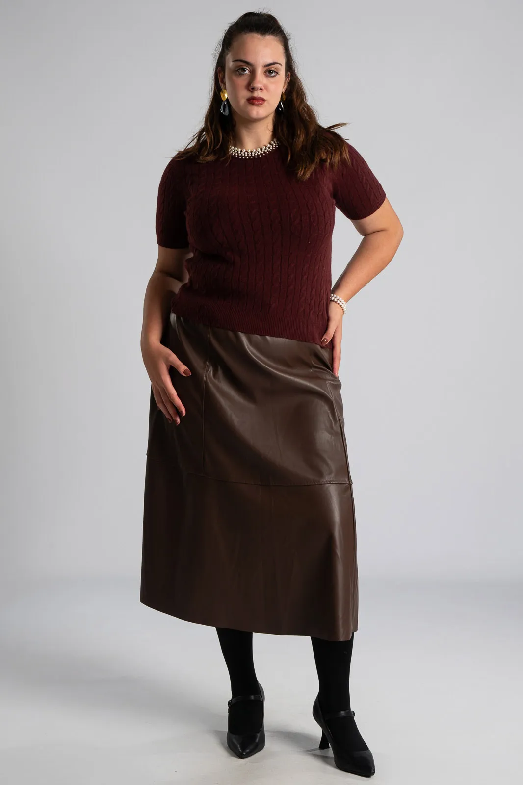 Φούστα δερματίνη σε Α γραμμή. Στη μέση διαθέτει λάστιχο περιμετρικά για καλύτερη εφαρμογή και δική της ζώνη τύπου δερματίνη. Είναι midi. Εσωτερικά έχει την υφή μαλακής τσόχας. Οι μετρήσεις του πίνακα είναι αντιπροσωπευτικές για κάθε προϊόν. 60% polyurethane, 40%polyester.