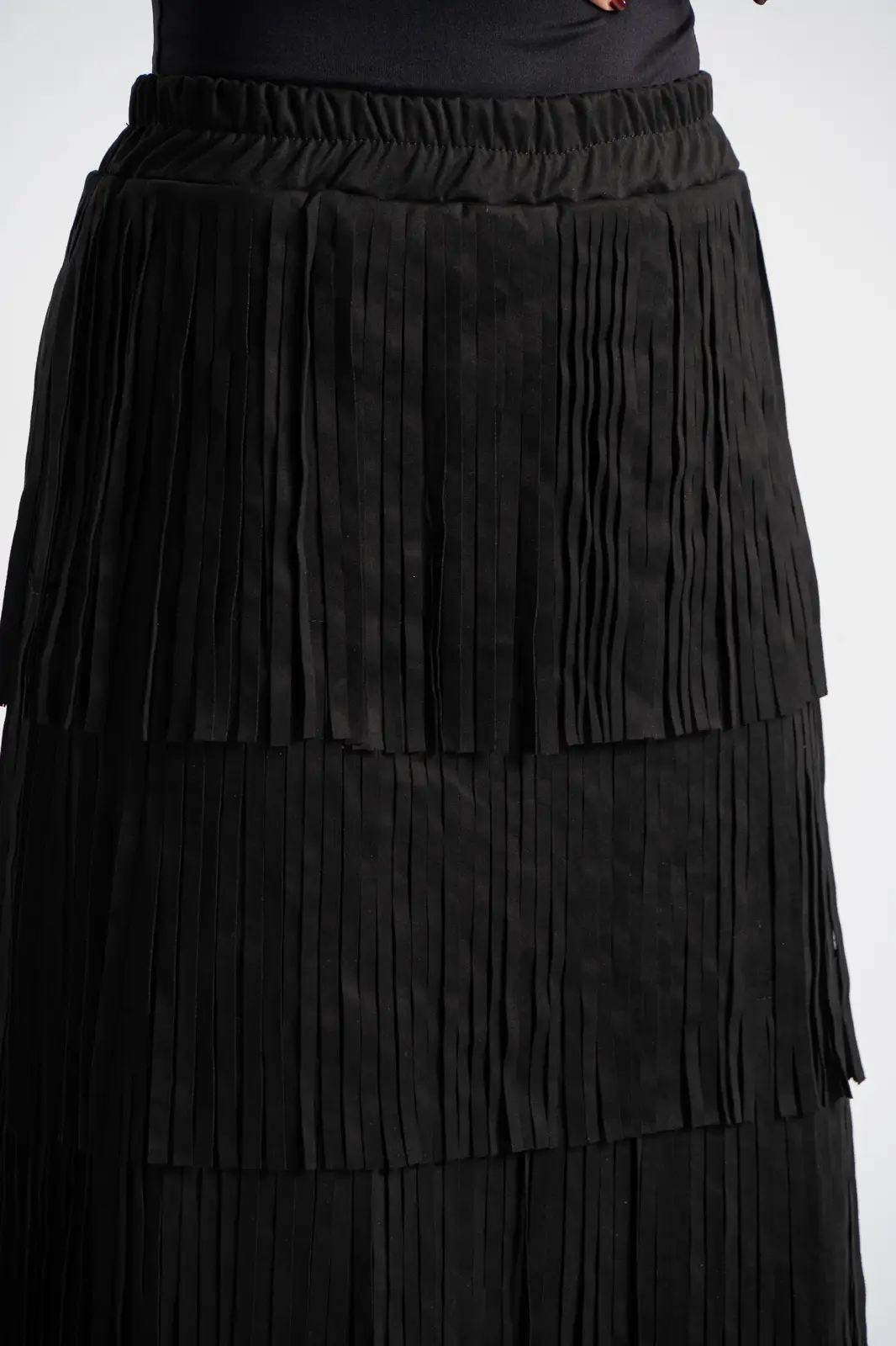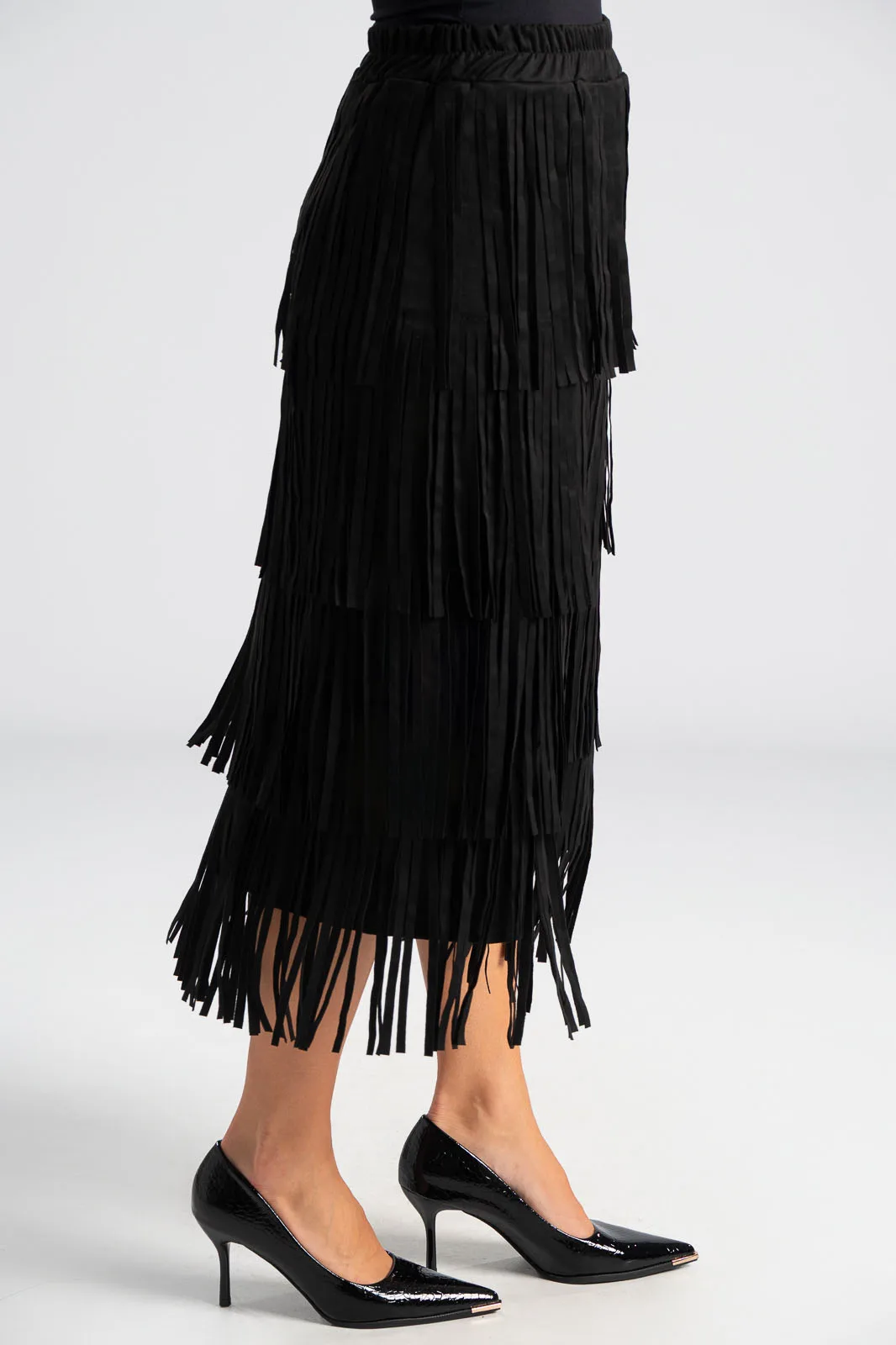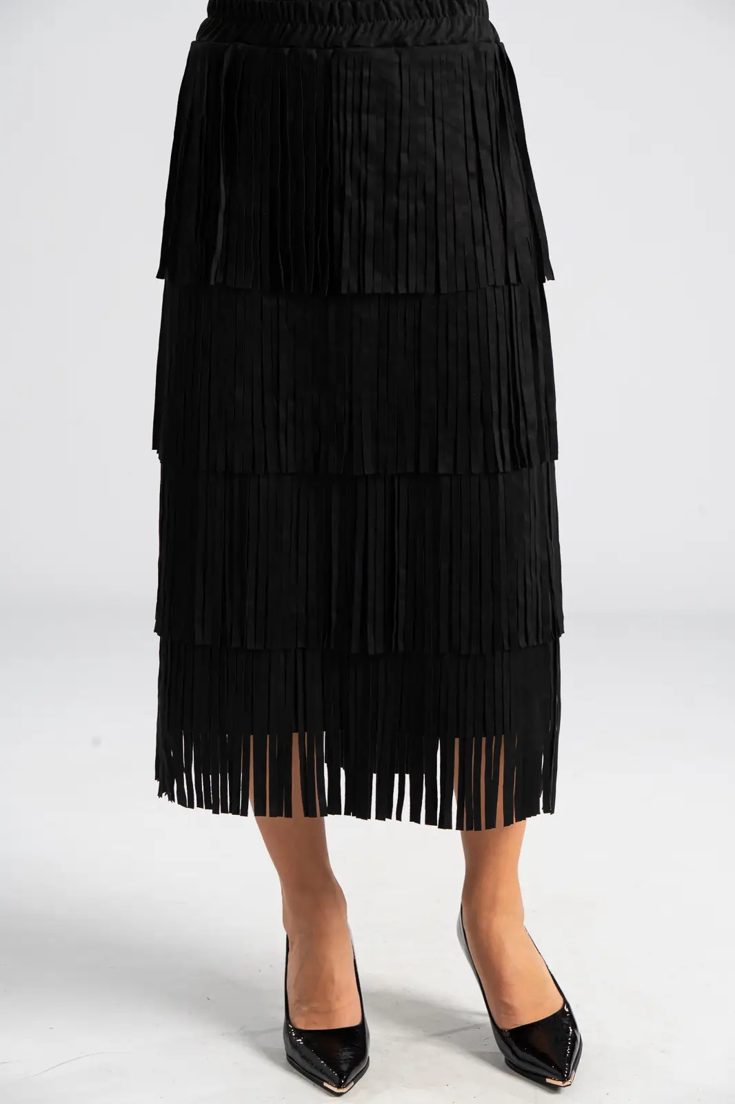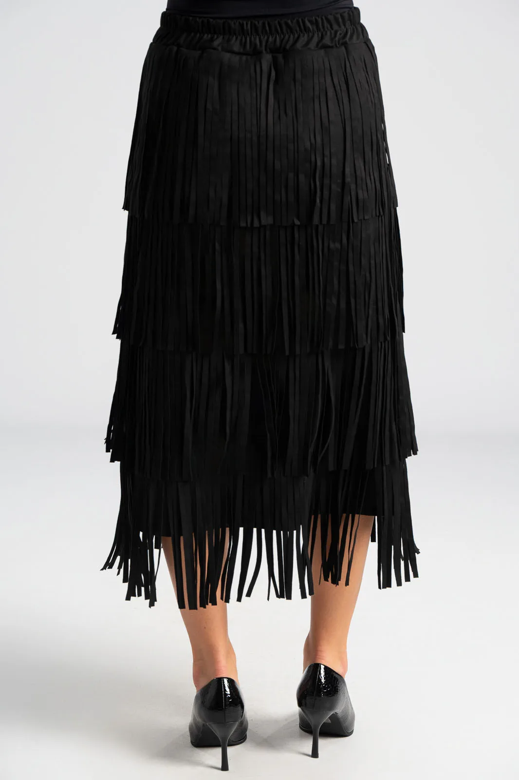 Φούστα που διαθέτει λάστιχο στη μέση για καλύτερη εφαρμογή. Έχει σουέτ υφή και σε όλη την επιφάνεια της έχει κρόσια διακοσμητικά. Οι μετρήσεις του πίνακα είναι αντιπροσωπευτικές για κάθε προϊόν. 95% polyester, 5% elastan.