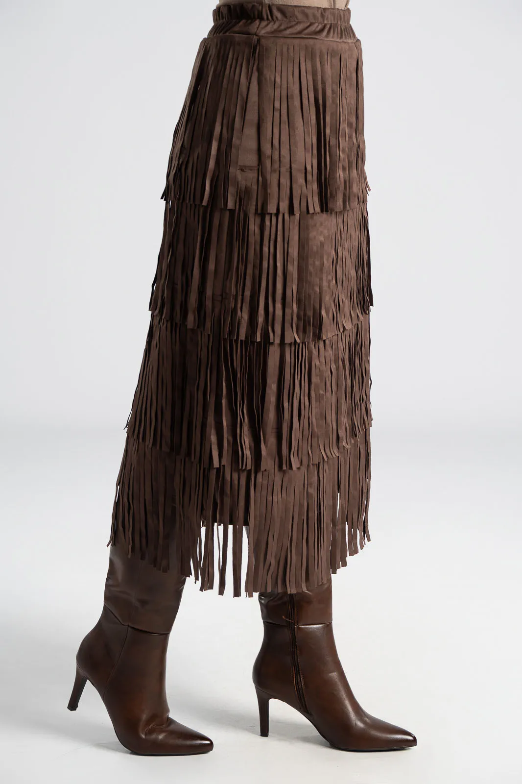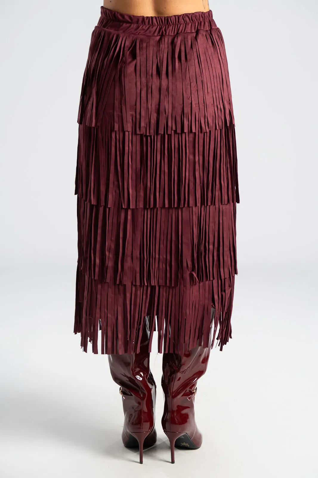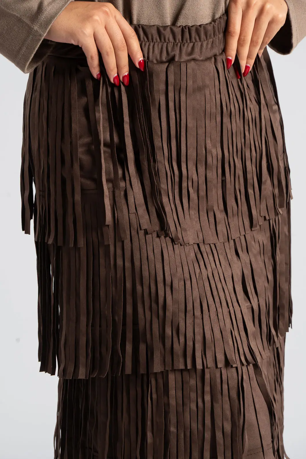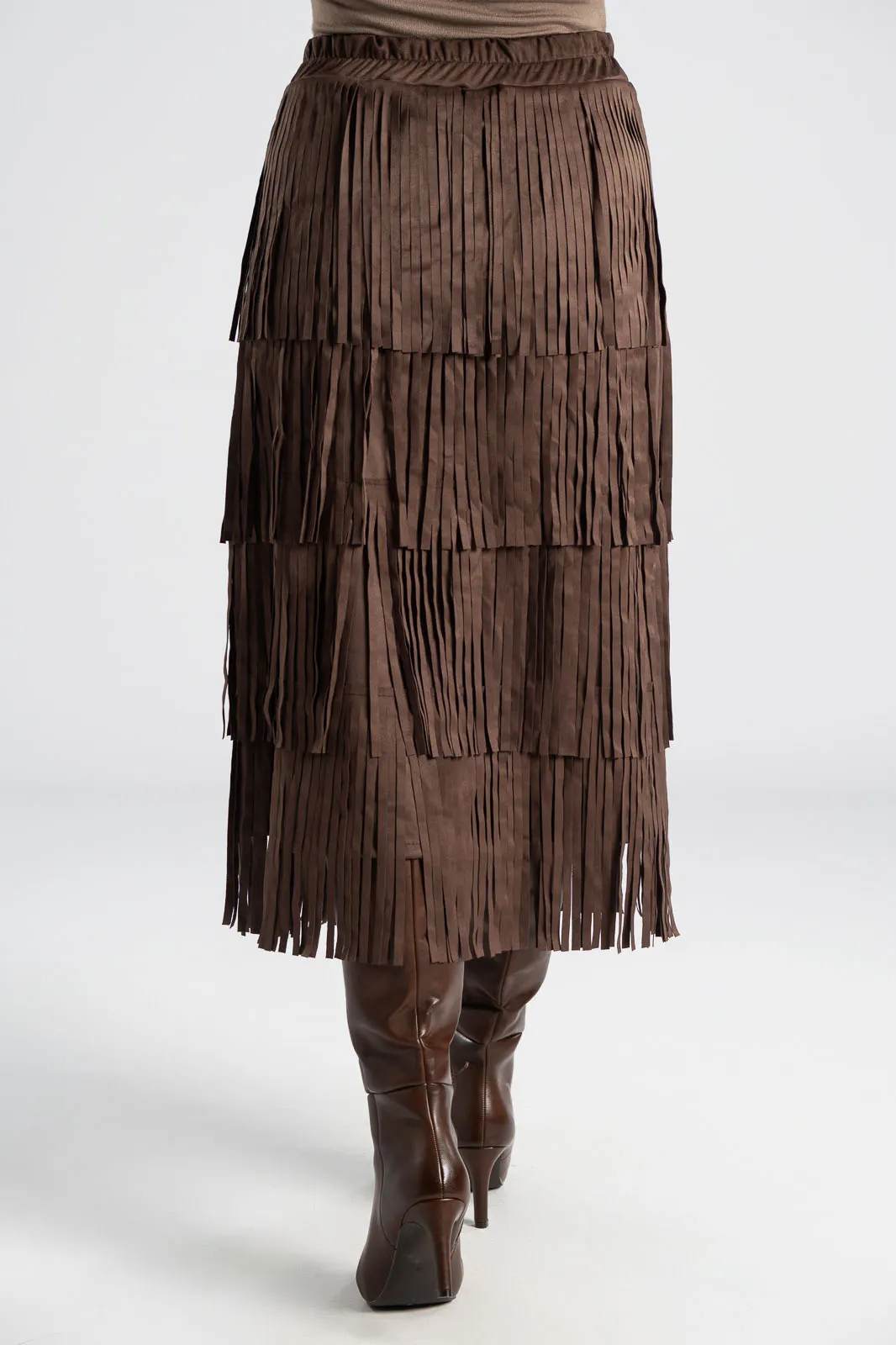Φούστα που διαθέτει λάστιχο στη μέση για καλύτερη εφαρμογή. Έχει σουέτ υφή και σε όλη την επιφάνεια της έχει κρόσια διακοσμητικά. Οι μετρήσεις του πίνακα είναι αντιπροσωπευτικές για κάθε προϊόν. 95% polyester, 5% elastan.