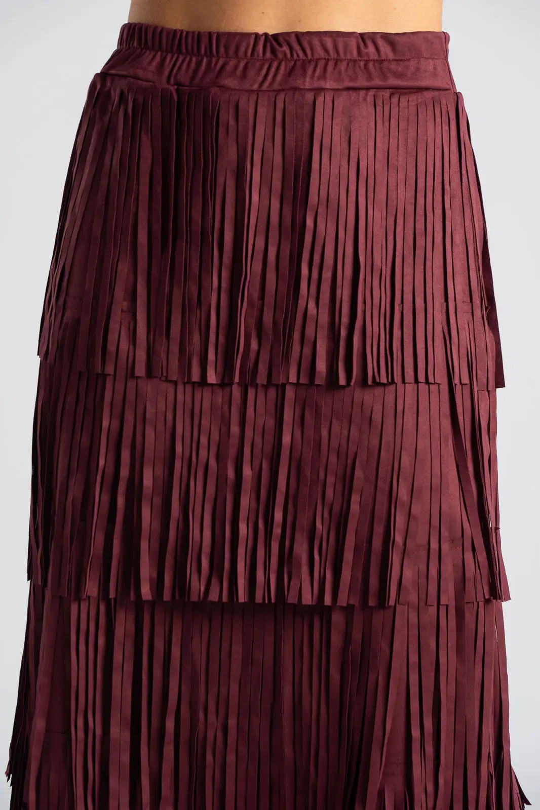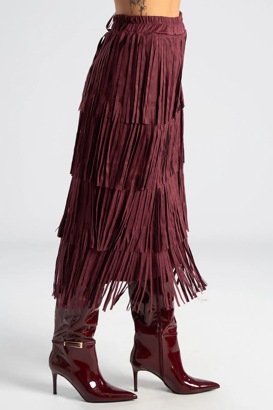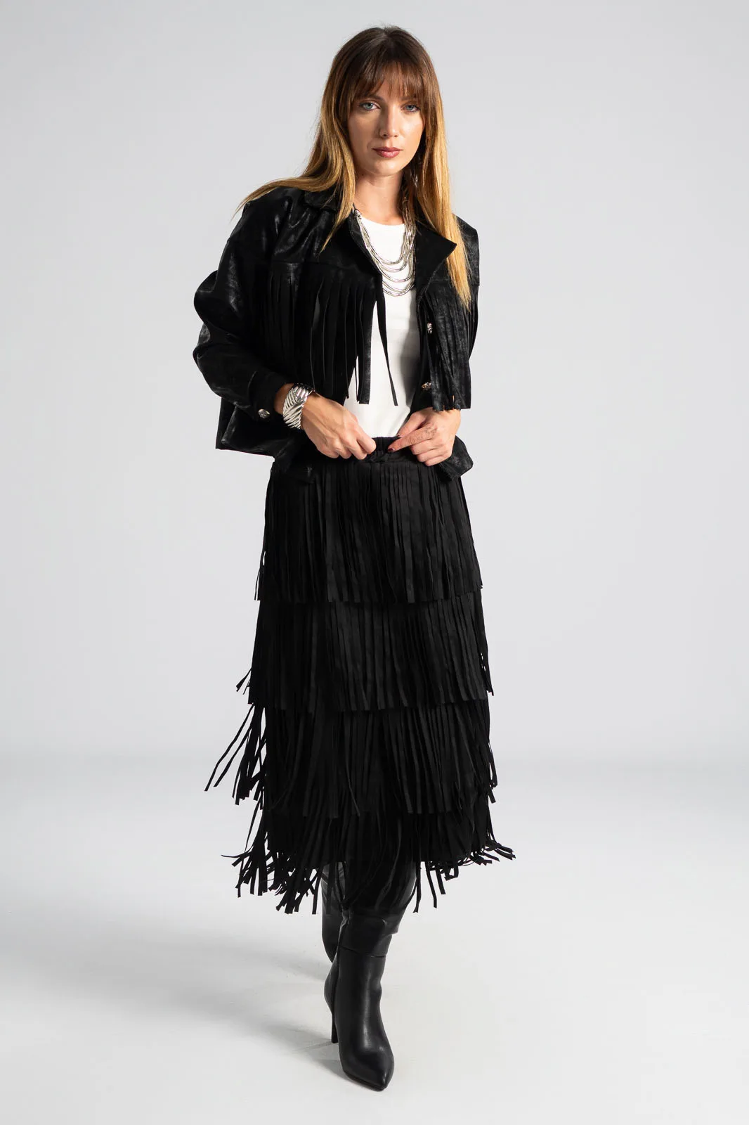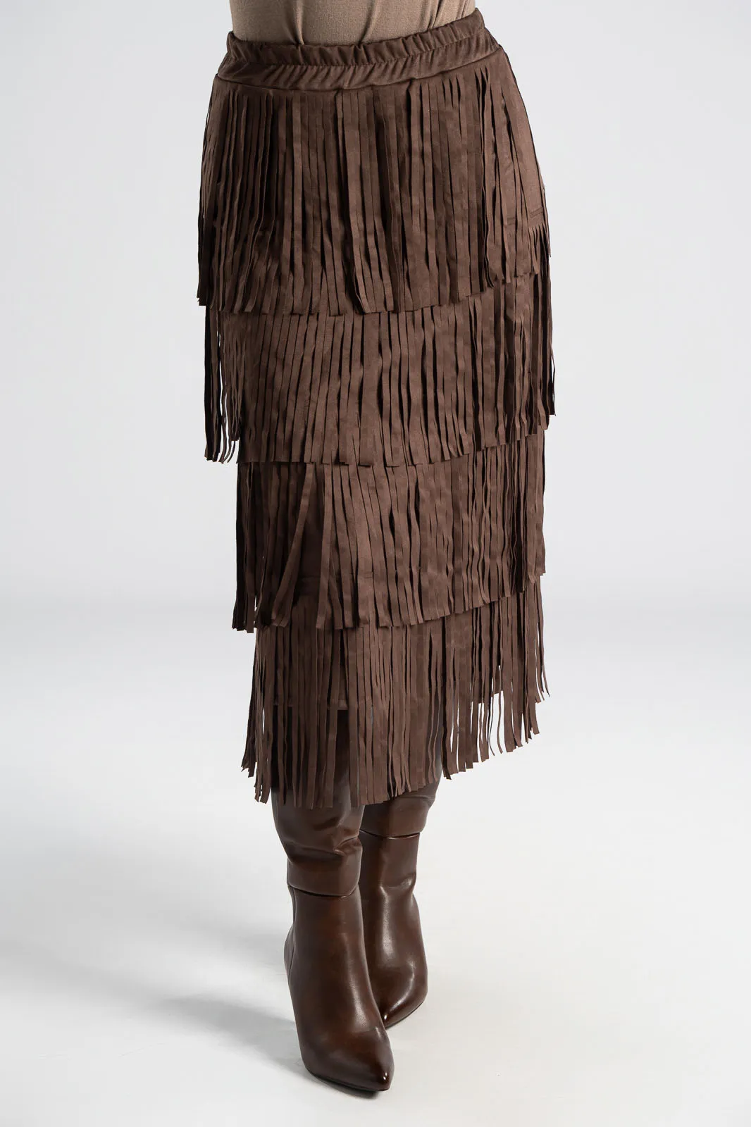 Φούστα που διαθέτει λάστιχο στη μέση για καλύτερη εφαρμογή. Έχει σουέτ υφή και σε όλη την επιφάνεια της έχει κρόσια διακοσμητικά. Οι μετρήσεις του πίνακα είναι αντιπροσωπευτικές για κάθε προϊόν. 95% polyester, 5% elastan.