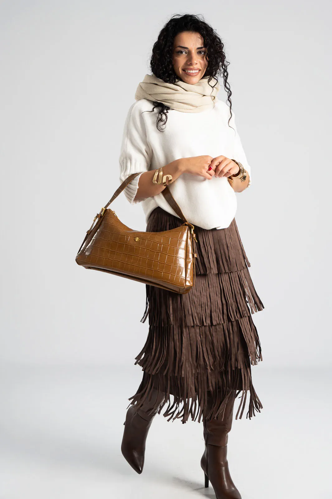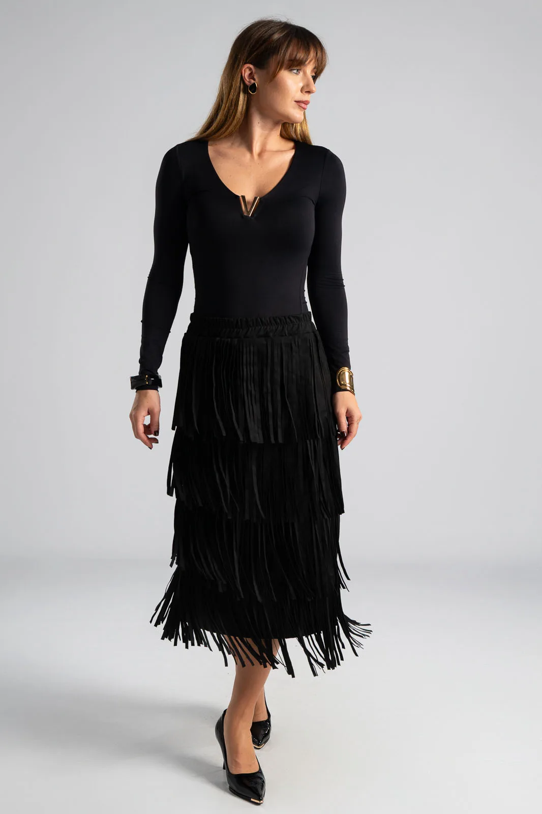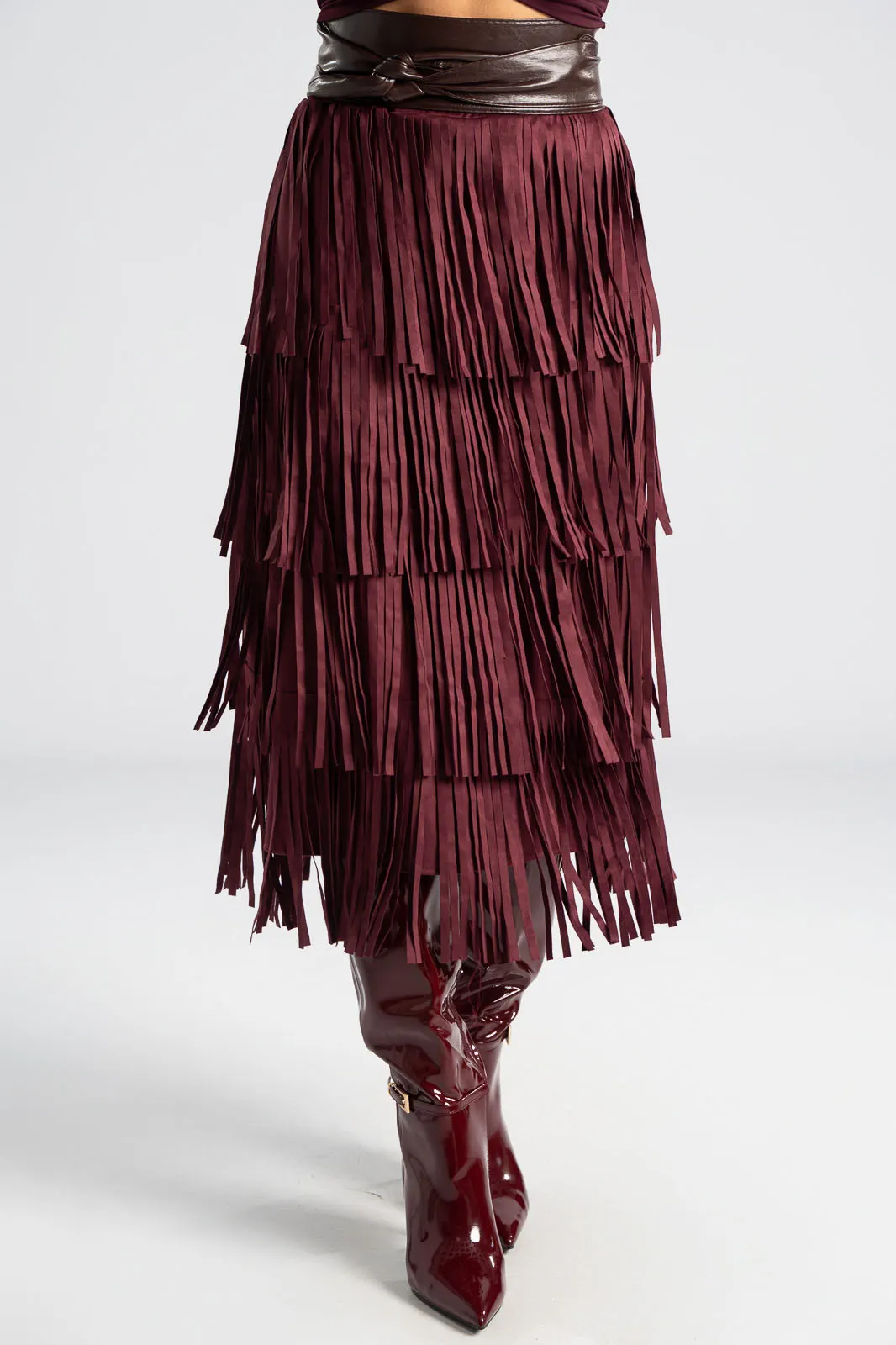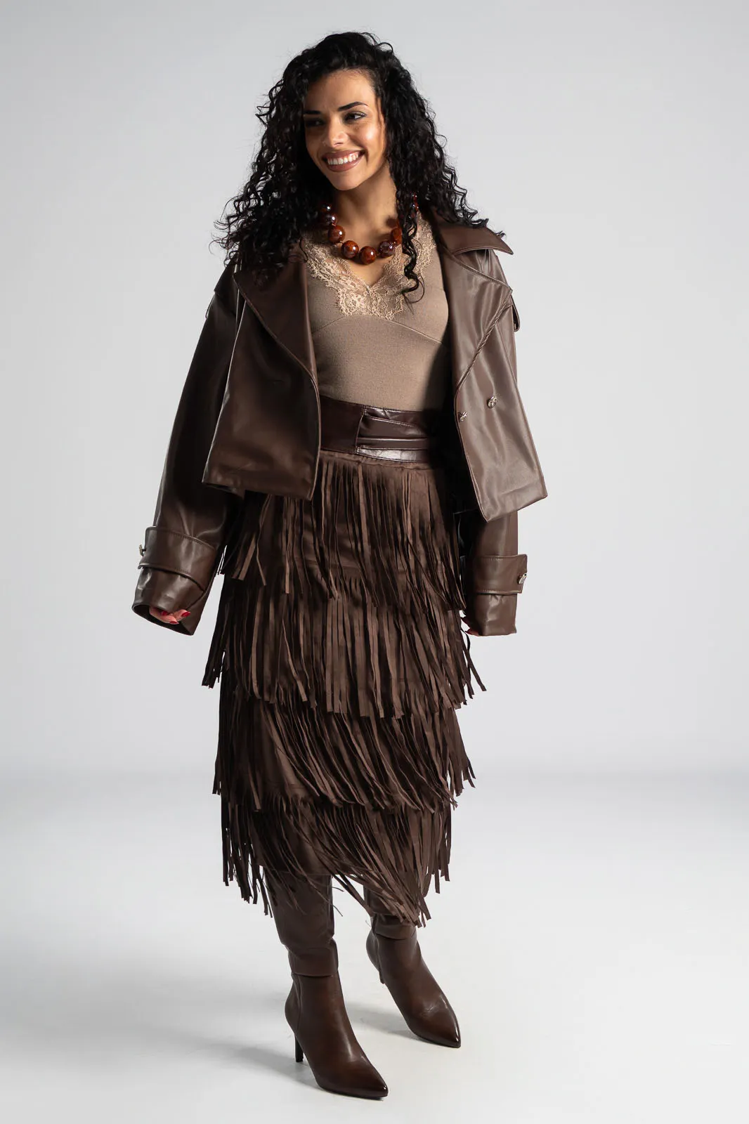 Φούστα που διαθέτει λάστιχο στη μέση για καλύτερη εφαρμογή. Έχει σουέτ υφή και σε όλη την επιφάνεια της έχει κρόσια διακοσμητικά. Οι μετρήσεις του πίνακα είναι αντιπροσωπευτικές για κάθε προϊόν. 95% polyester, 5% elastan.