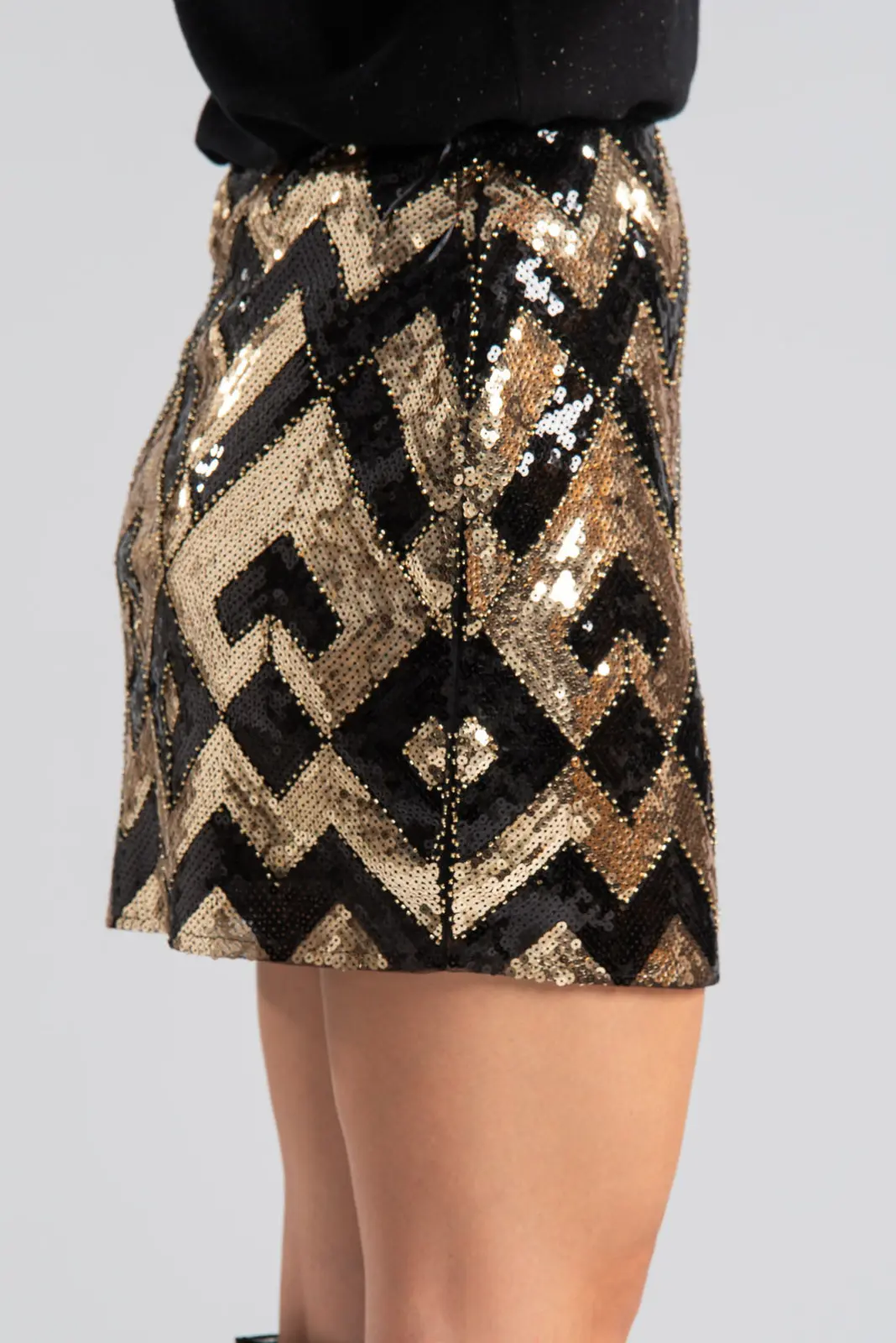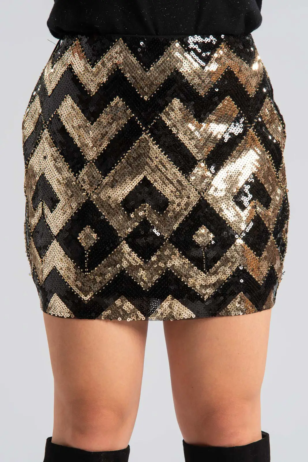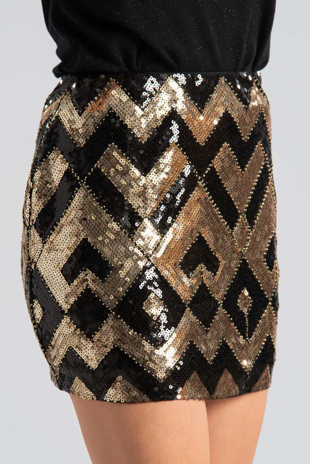 Φούστα mini. Σε όλη την επιφάνεια της διαθέτει παγιέτες σε ζικ-ζακ σχέδιο. Κλείνει στο πλάι με φερμουάρ και εσωτερικά είναι φοδραρισμένη. Είναι ιδανική για κάθε περίσταση. Οι μετρήσεις του πίνακα είναι αντιπροσωπευτικές για κάθε προϊόν. 100% polyester.