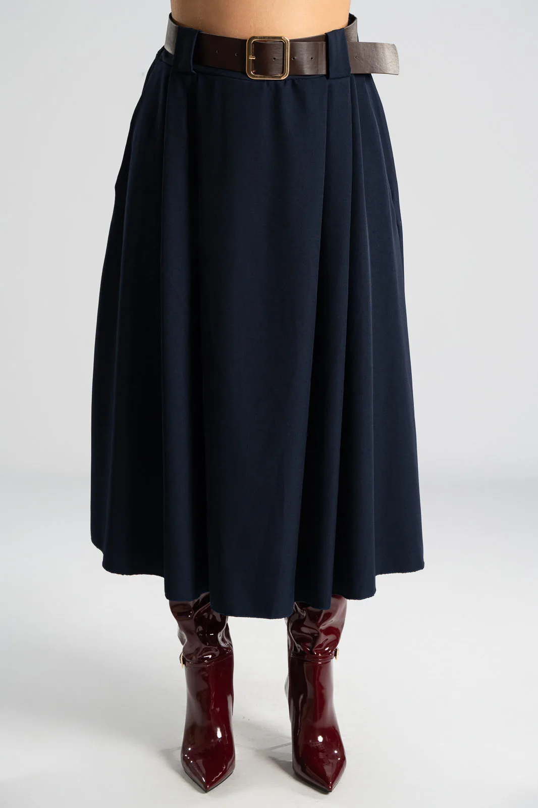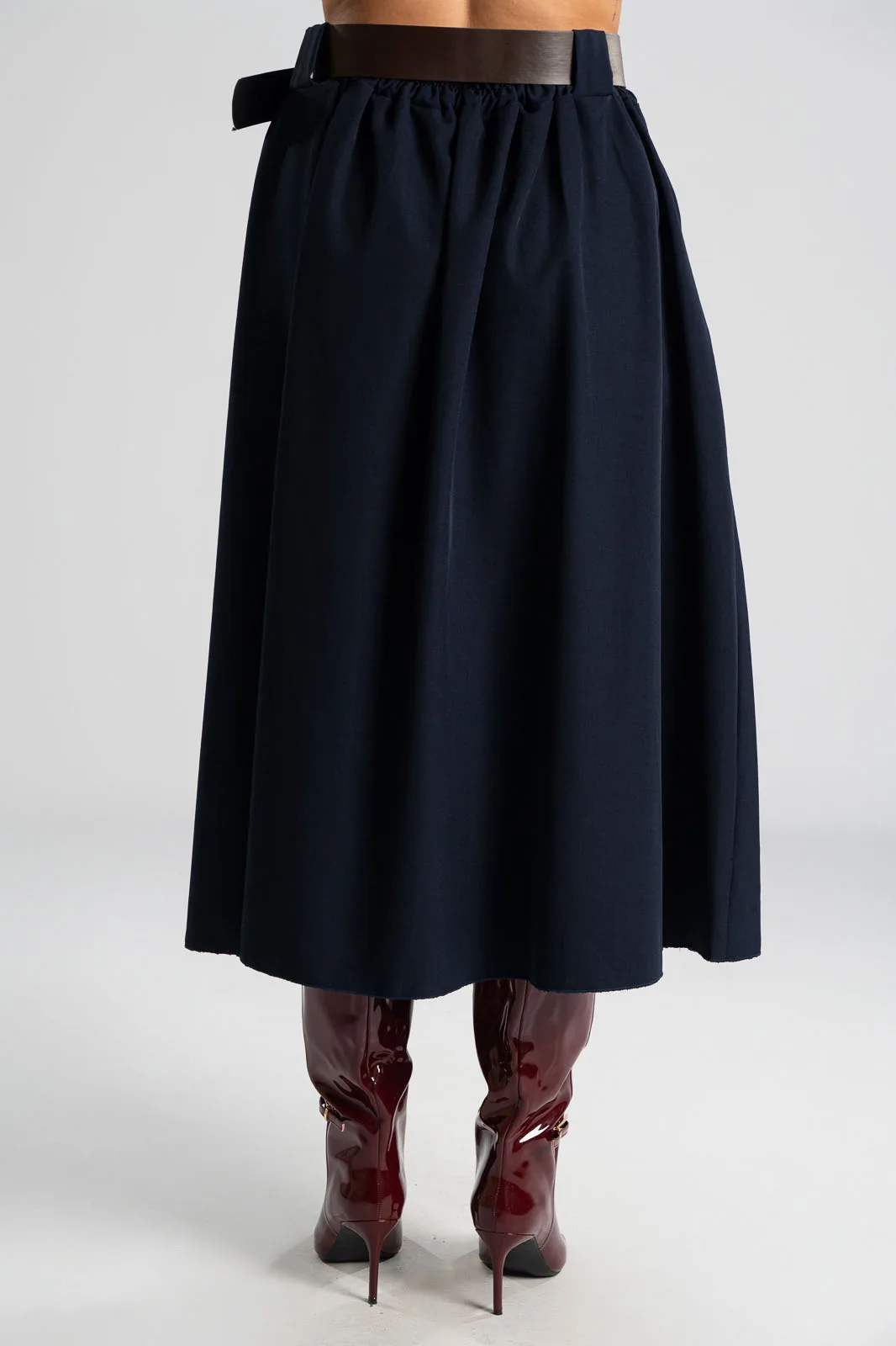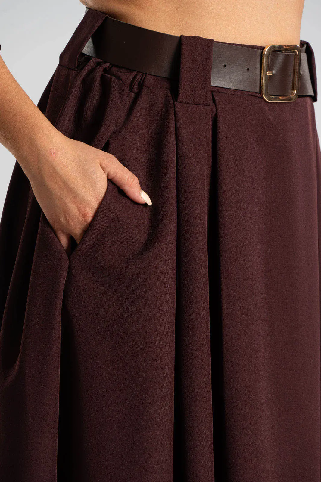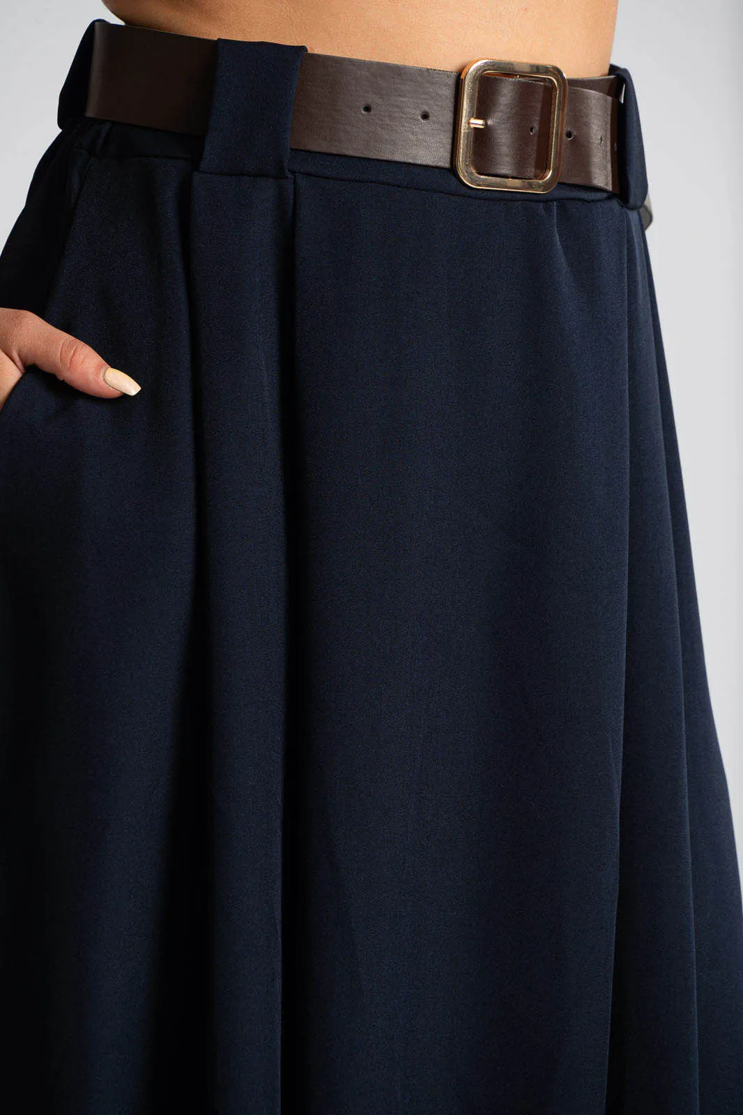 Φούστα σε Α γραμμή και στο μπροστινό μέρος διαθέτει πιέτες. Στη μέση διαθέτει λάστιχο στο πίσω μέρος για καλύτερη εφαρμογή και δική της ζώνη τύπου δερματίνη. Διαθέτει πλαϊνές τσέπες. Οι μετρήσεις του πίνακα είναι αντιπροσωπευτικές για κάθε προϊόν. 96%polyester, 4% elastan.