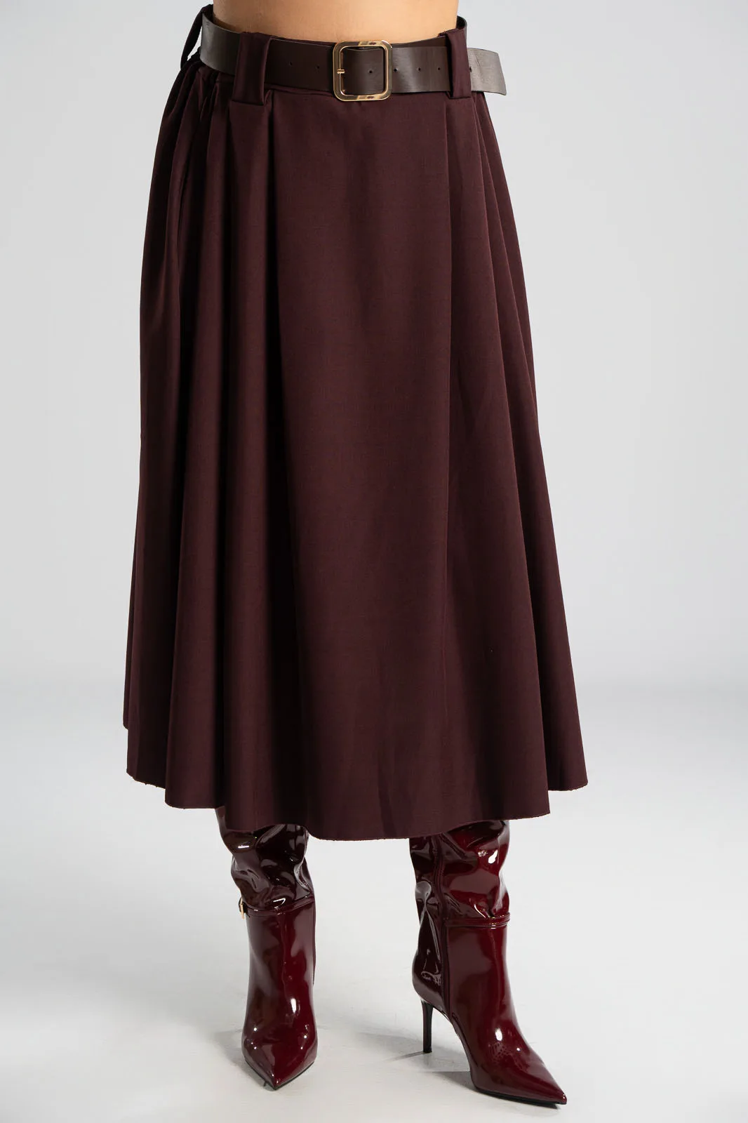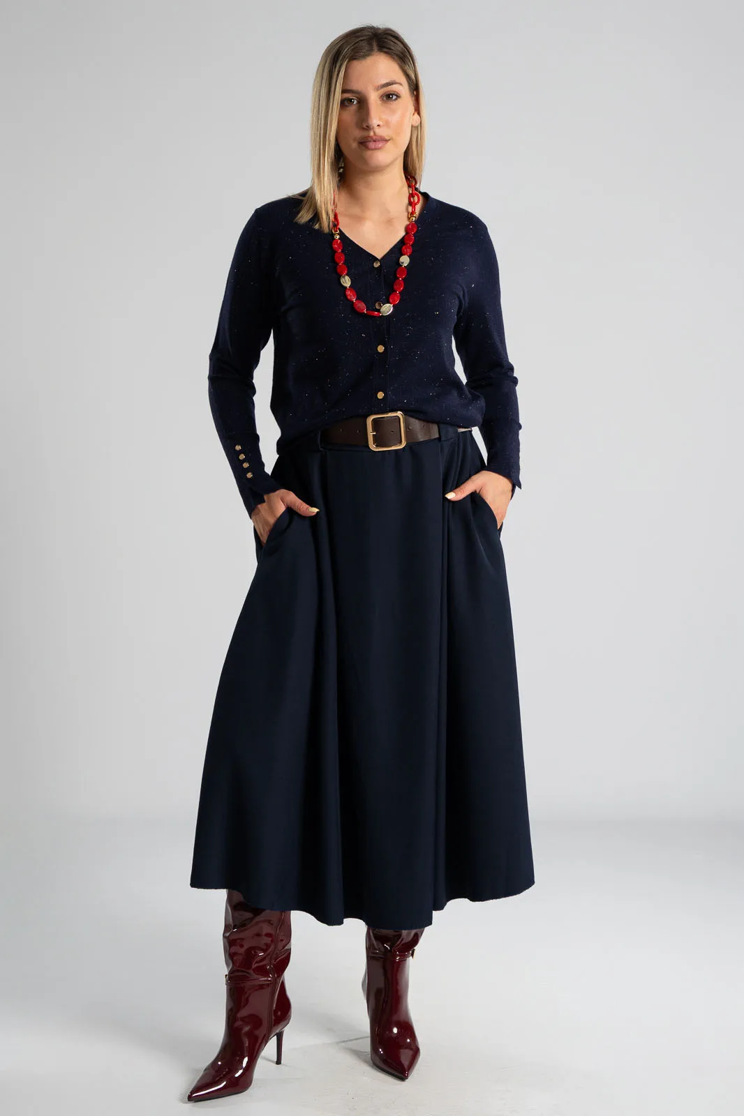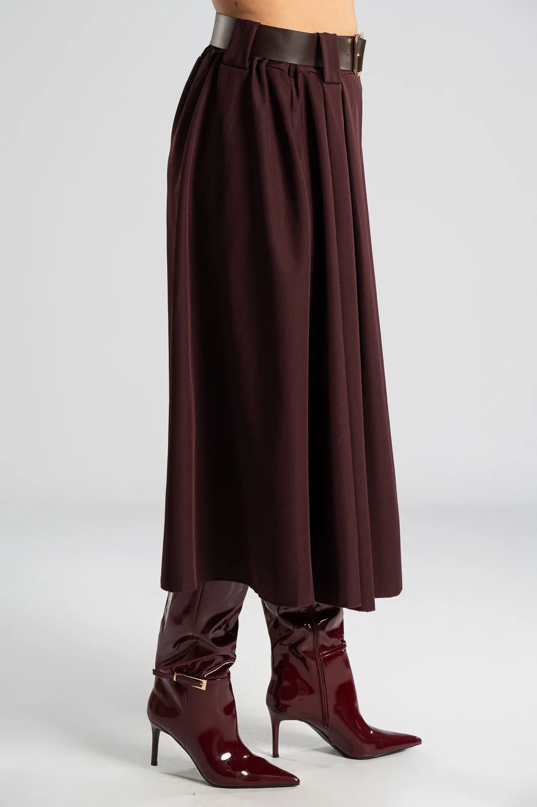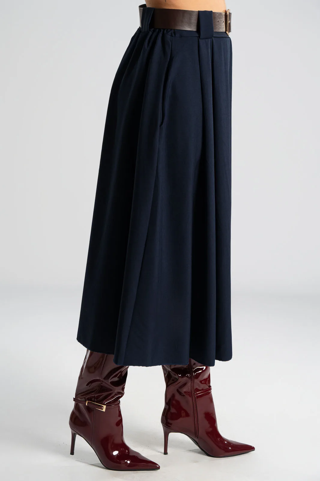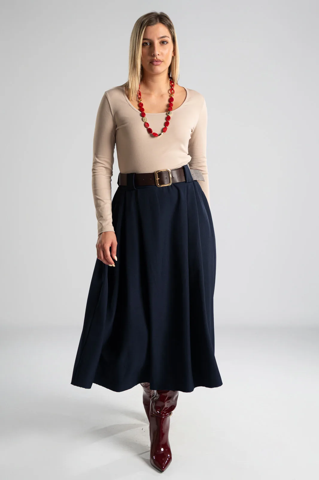 Φούστα σε Α γραμμή και στο μπροστινό μέρος διαθέτει πιέτες. Στη μέση διαθέτει λάστιχο στο πίσω μέρος για καλύτερη εφαρμογή και δική της ζώνη τύπου δερματίνη. Διαθέτει πλαϊνές τσέπες. Οι μετρήσεις του πίνακα είναι αντιπροσωπευτικές για κάθε προϊόν. 96%polyester, 4% elastan.