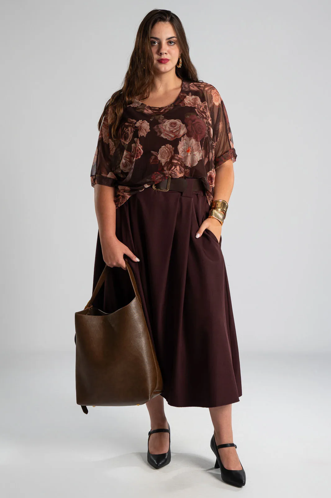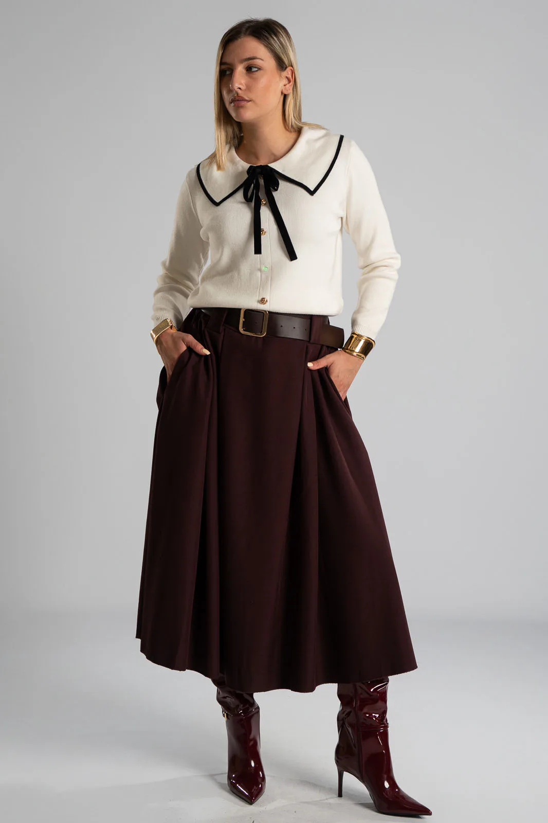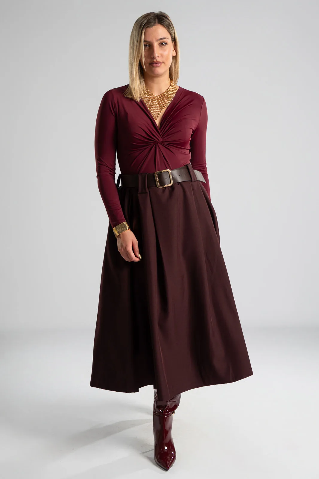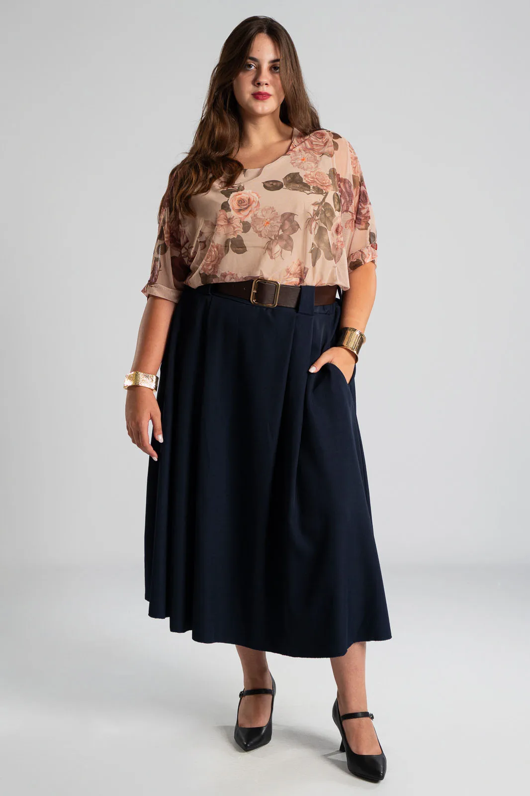 Φούστα σε Α γραμμή και στο μπροστινό μέρος διαθέτει πιέτες. Στη μέση διαθέτει λάστιχο στο πίσω μέρος για καλύτερη εφαρμογή και δική της ζώνη τύπου δερματίνη. Διαθέτει πλαϊνές τσέπες. Οι μετρήσεις του πίνακα είναι αντιπροσωπευτικές για κάθε προϊόν. 96%polyester, 4% elastan.