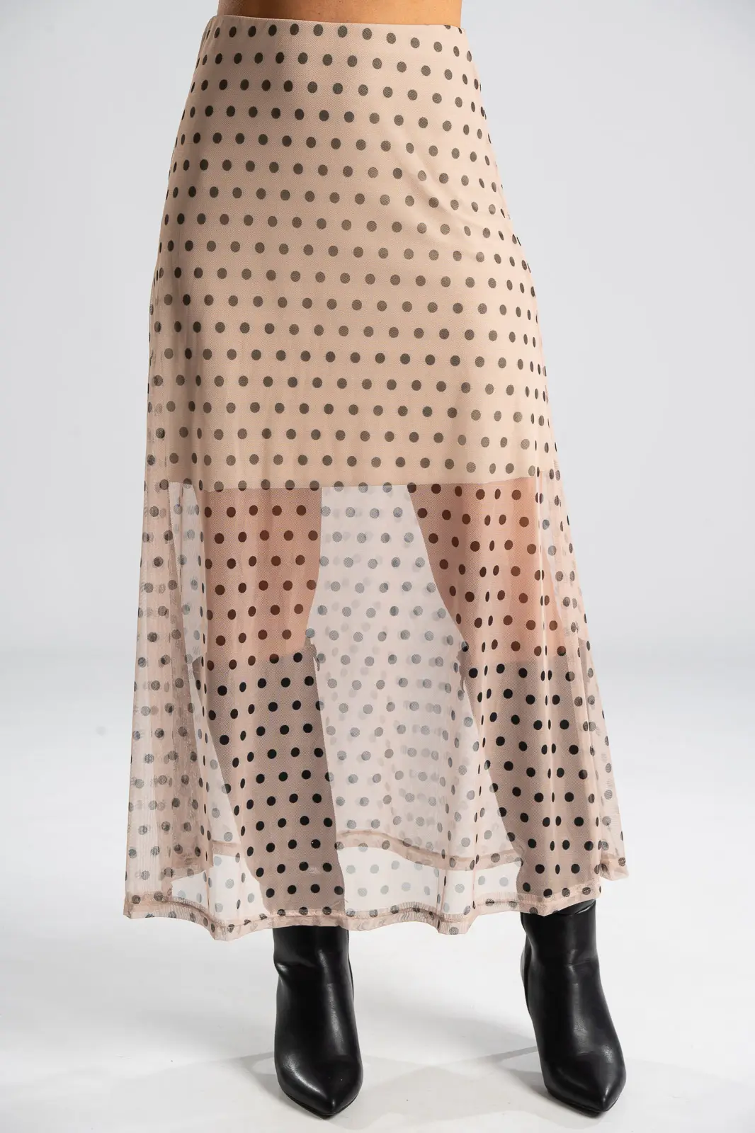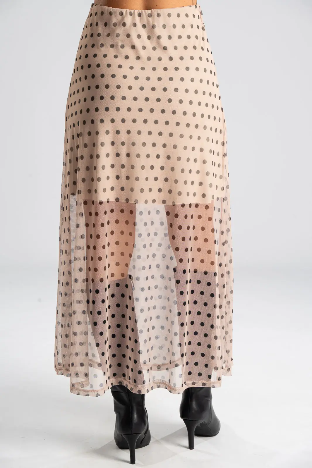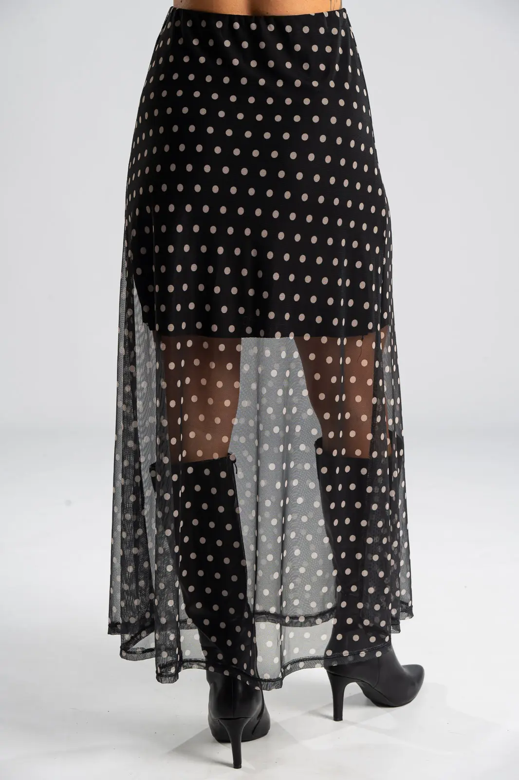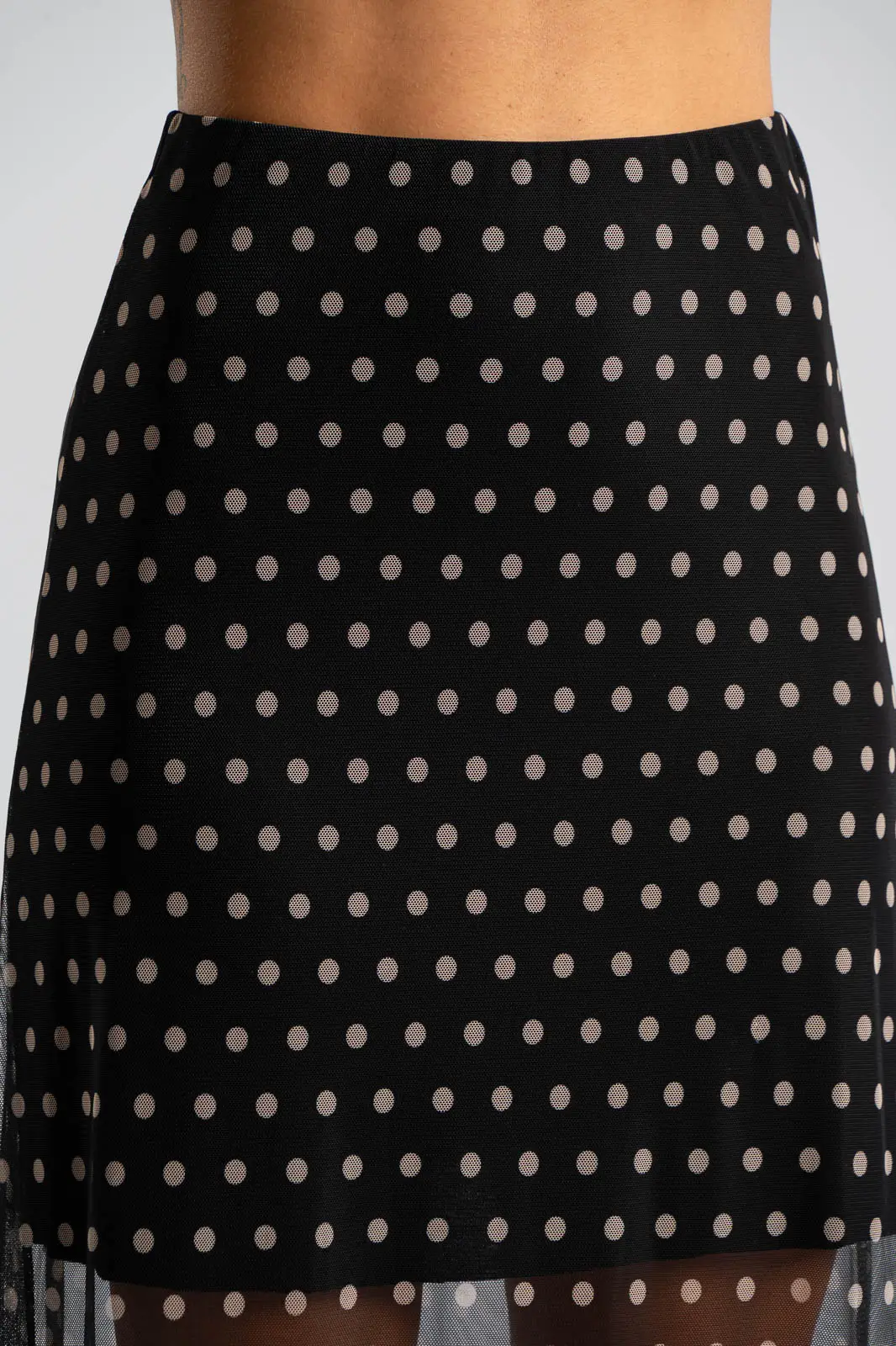 Φούστα τούλινη με λάστιχο περιμετρικά στη μέση για καλύτερη εφαρμογή. Είναι maxi και έχει Α γραμμή. Σε όλη την επιφάνεια της έχει πουά σχέδιο. Εσωτερικά είναι φοδραρισμένη μέχρι λίγο πάνω από το γόνατο. Οι μετρήσεις του πίνακα είναι αντιπροσωπευτικές για κάθε κωδικό. Φούστα: 100% polyester. Φόδρα: 95% viscose, 5% elastan.