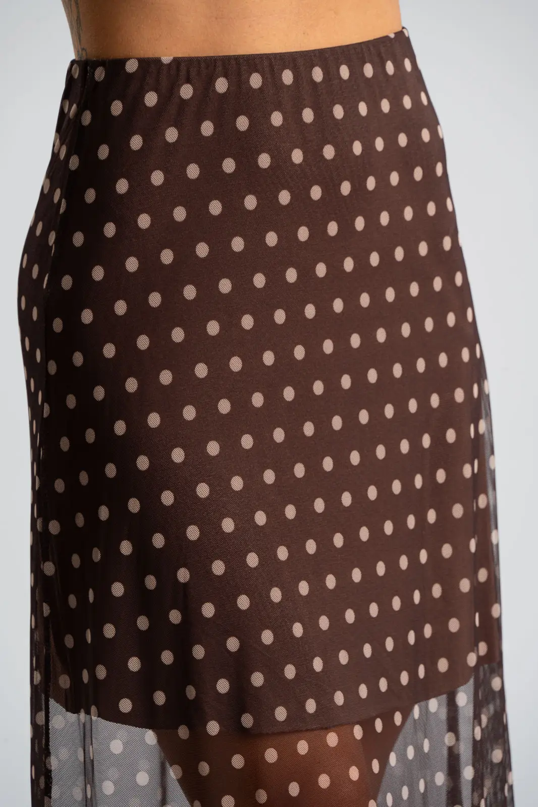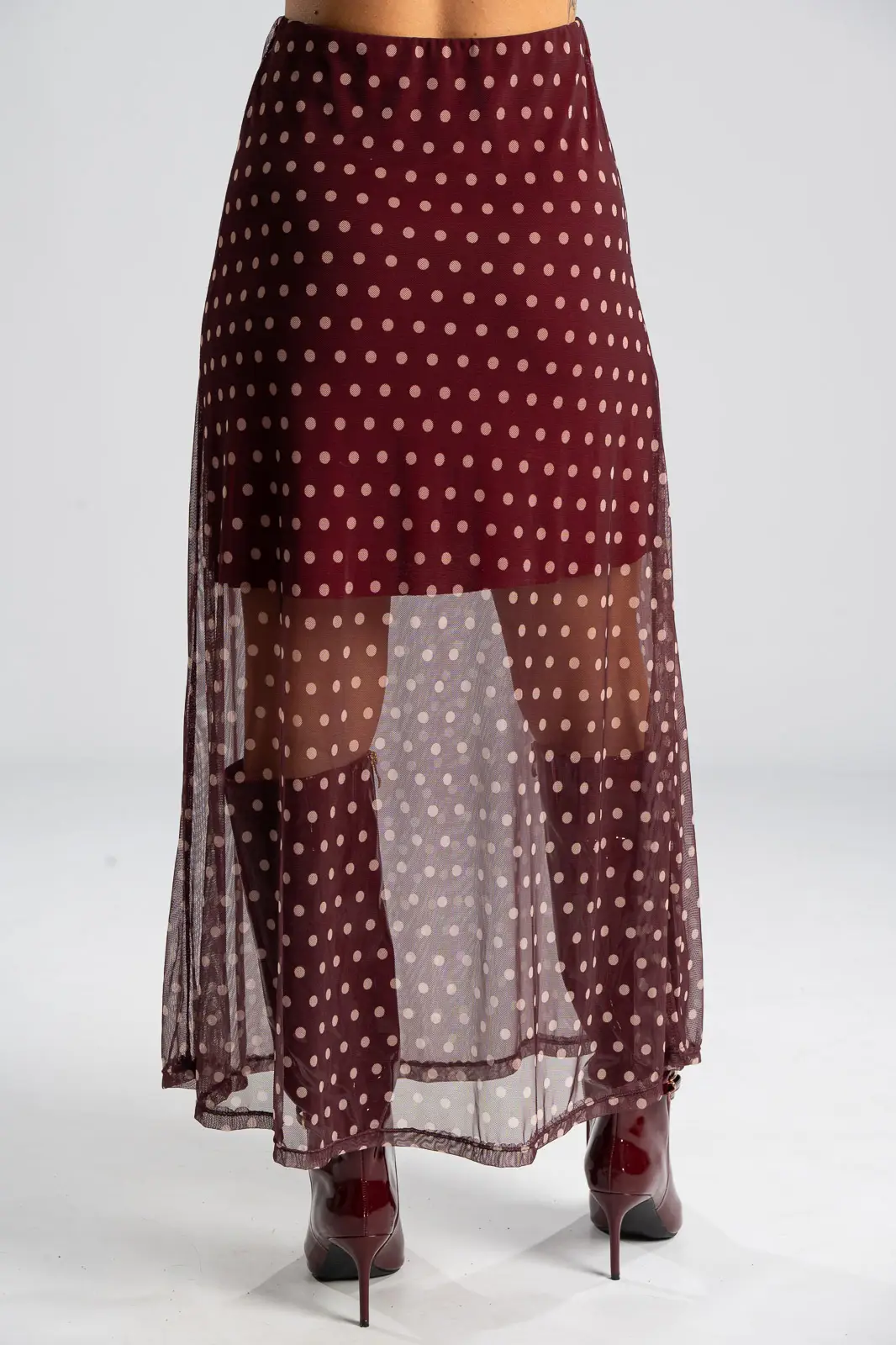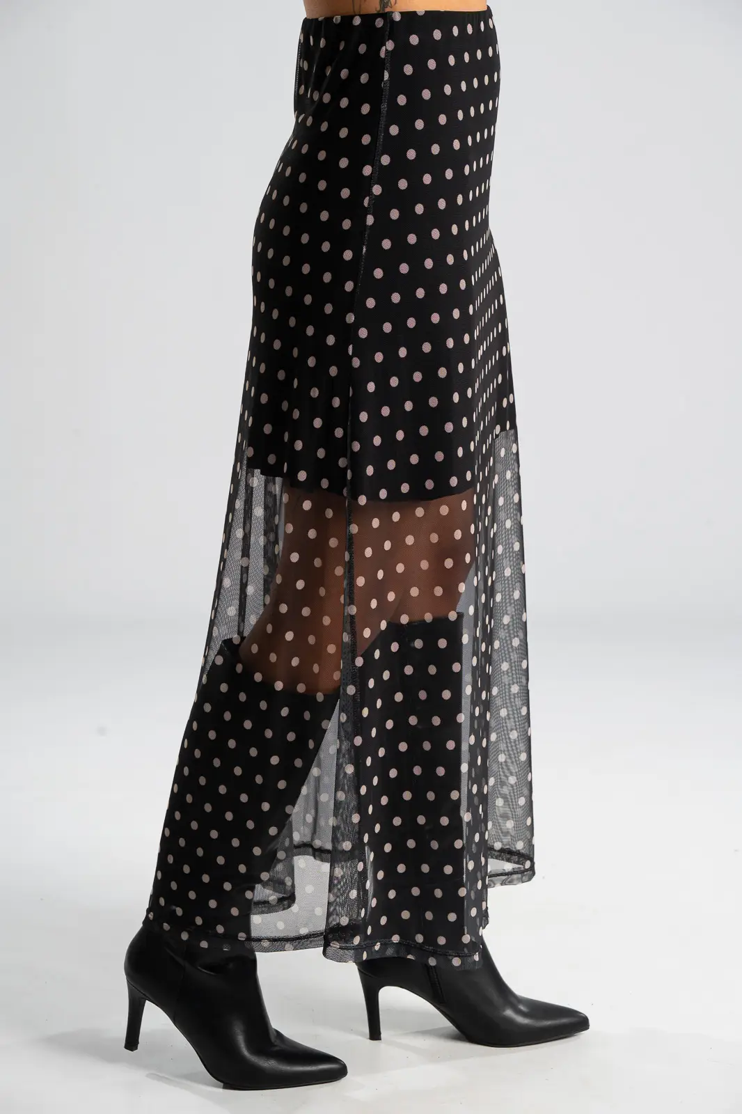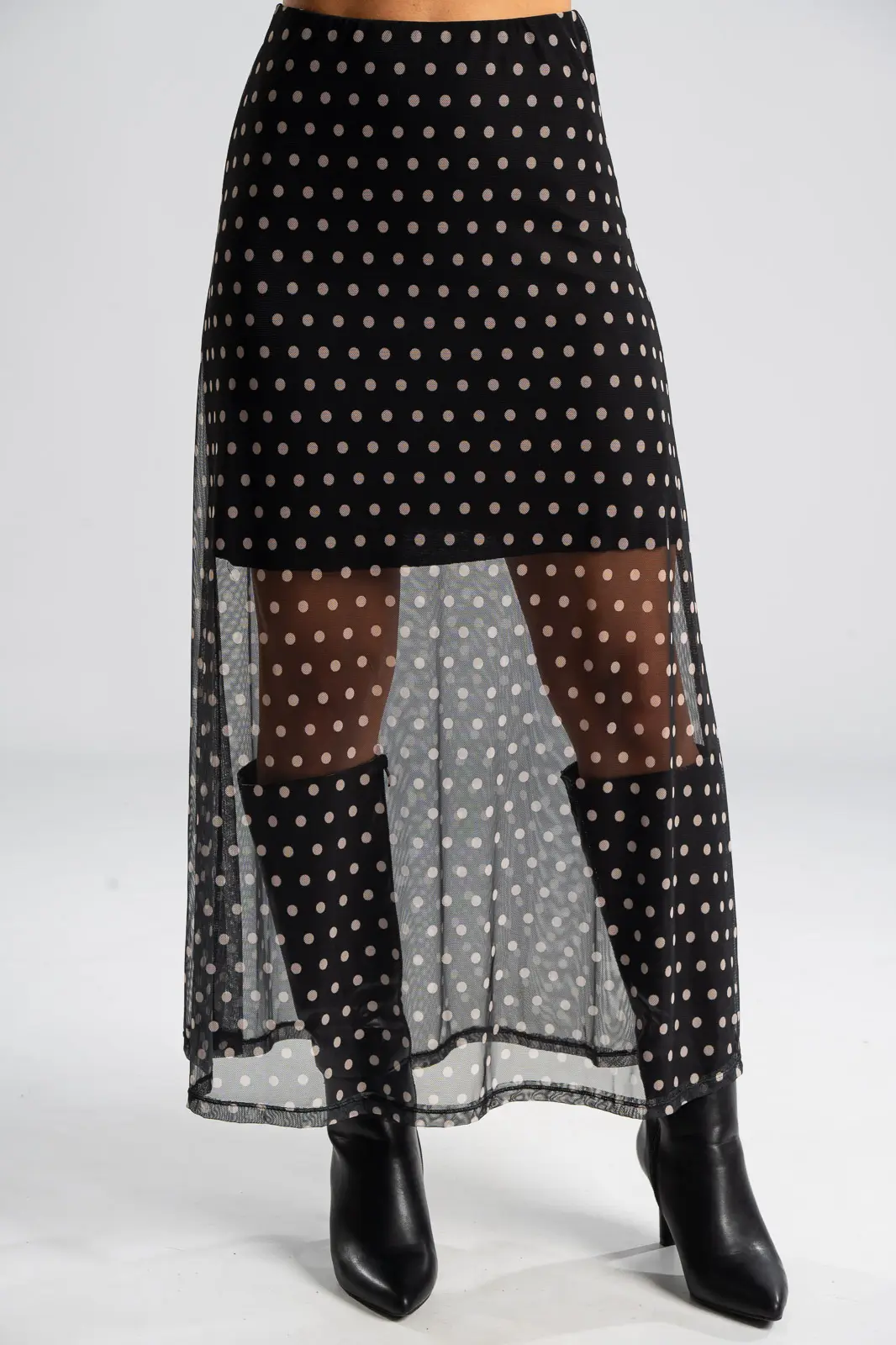 Φούστα τούλινη με λάστιχο περιμετρικά στη μέση για καλύτερη εφαρμογή. Είναι maxi και έχει Α γραμμή. Σε όλη την επιφάνεια της έχει πουά σχέδιο. Εσωτερικά είναι φοδραρισμένη μέχρι λίγο πάνω από το γόνατο. Οι μετρήσεις του πίνακα είναι αντιπροσωπευτικές για κάθε κωδικό. Φούστα: 100% polyester. Φόδρα: 95% viscose, 5% elastan.