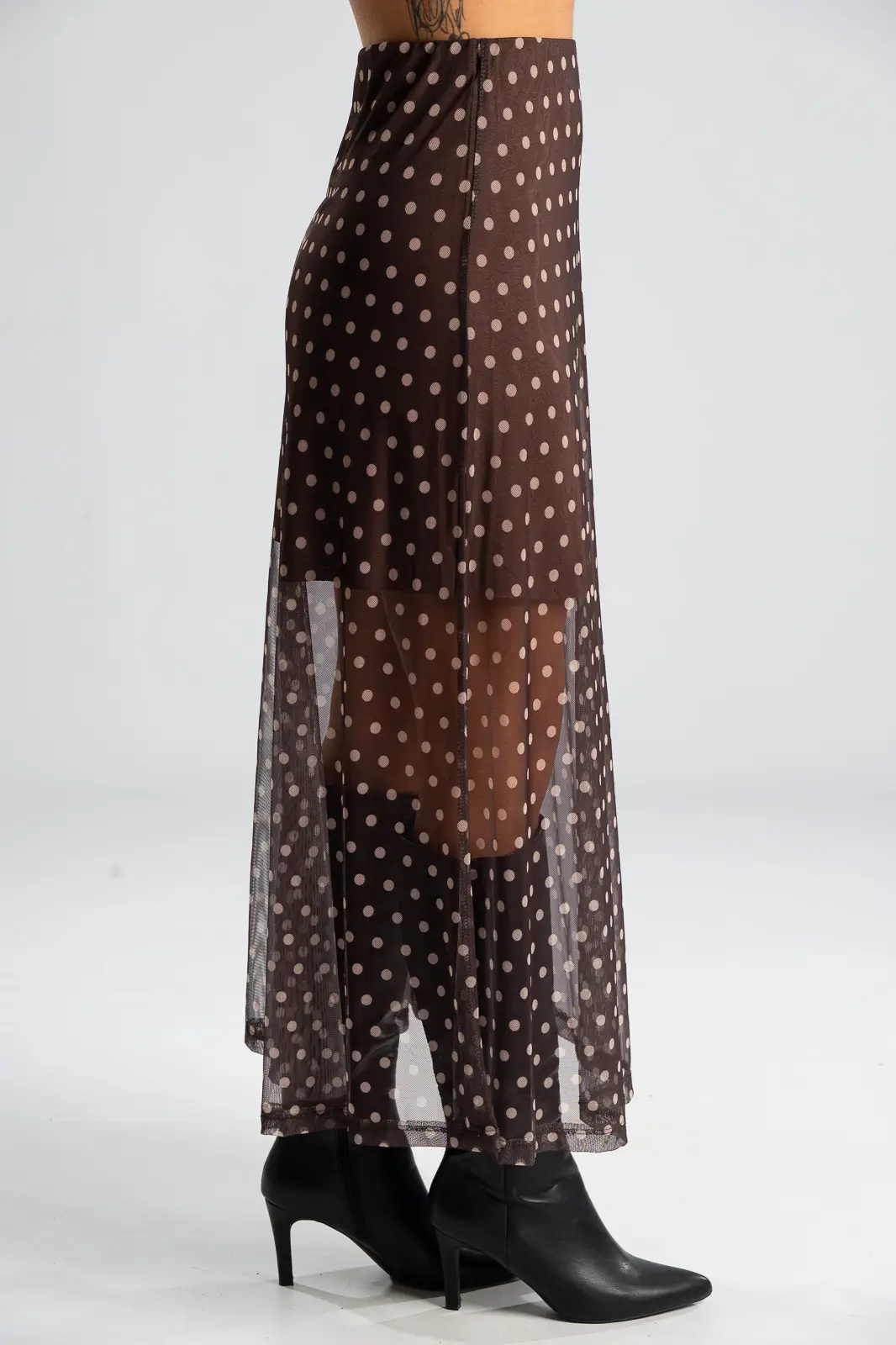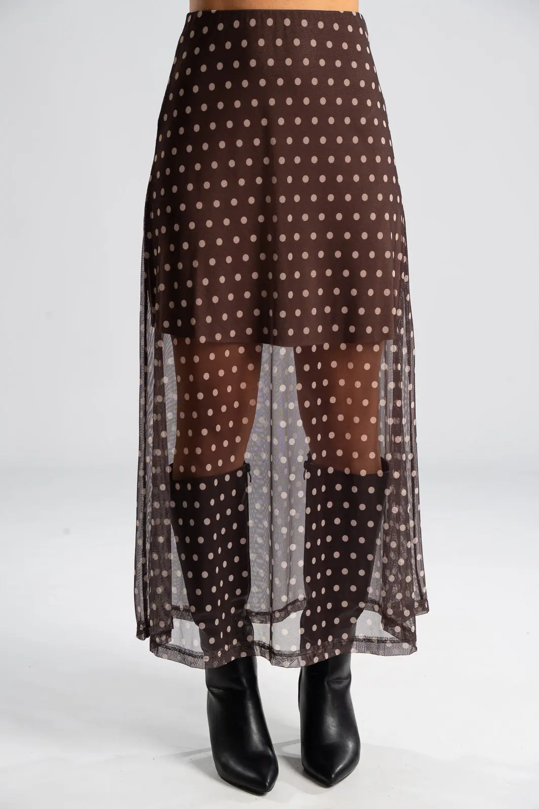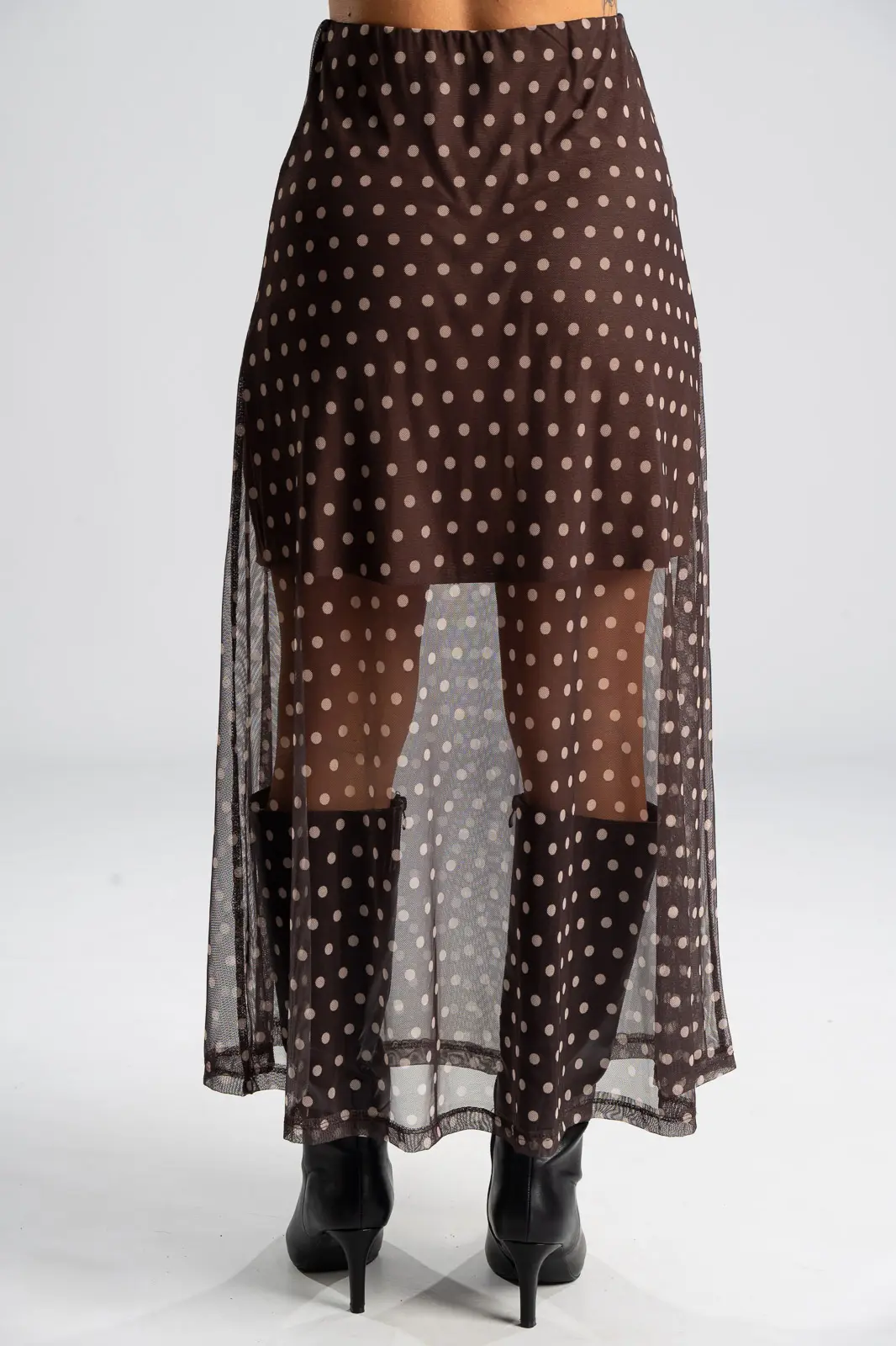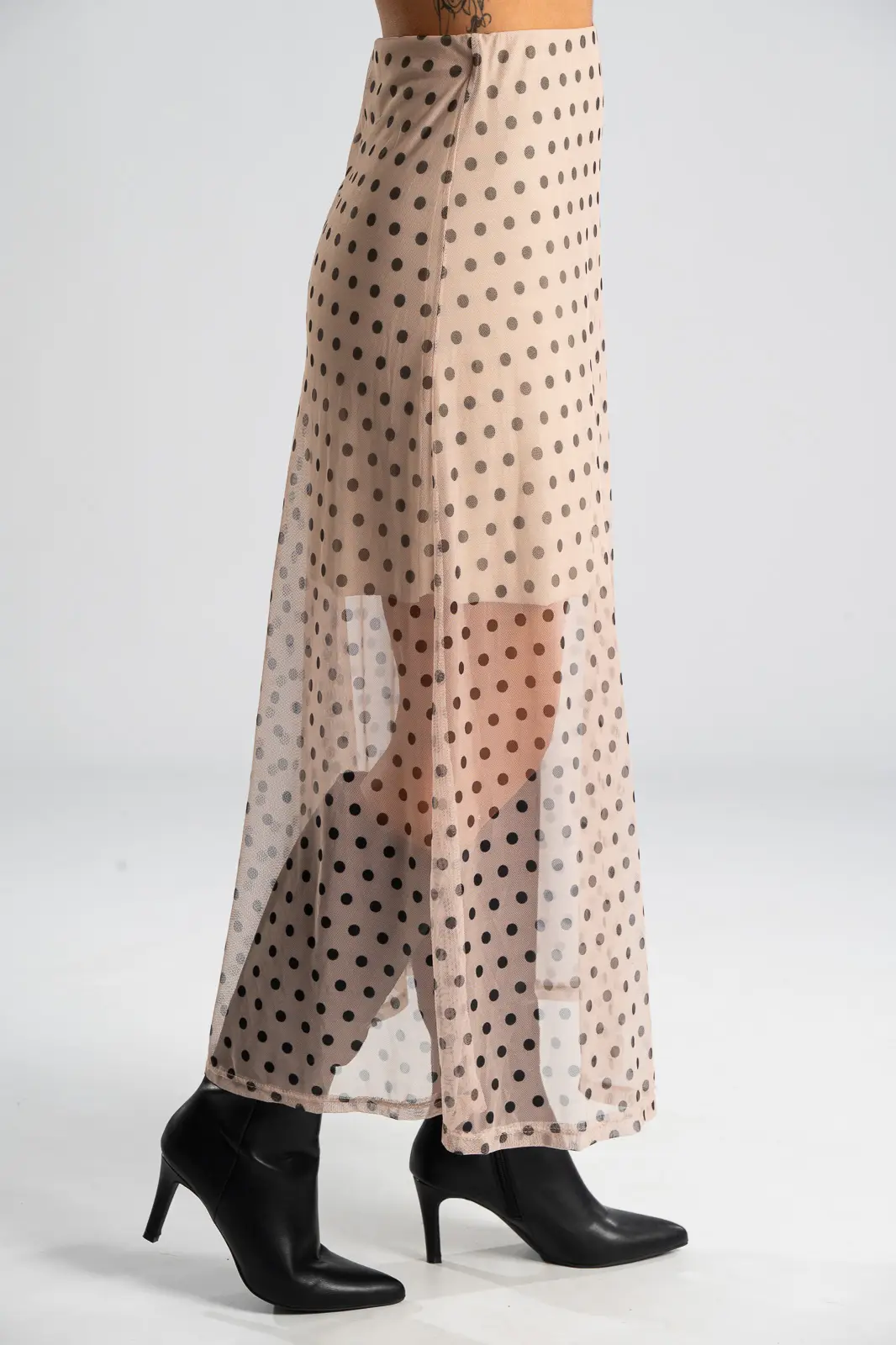 Φούστα τούλινη με λάστιχο περιμετρικά στη μέση για καλύτερη εφαρμογή. Είναι maxi και έχει Α γραμμή. Σε όλη την επιφάνεια της έχει πουά σχέδιο. Εσωτερικά είναι φοδραρισμένη μέχρι λίγο πάνω από το γόνατο. Οι μετρήσεις του πίνακα είναι αντιπροσωπευτικές για κάθε κωδικό. Φούστα: 100% polyester. Φόδρα: 95% viscose, 5% elastan.