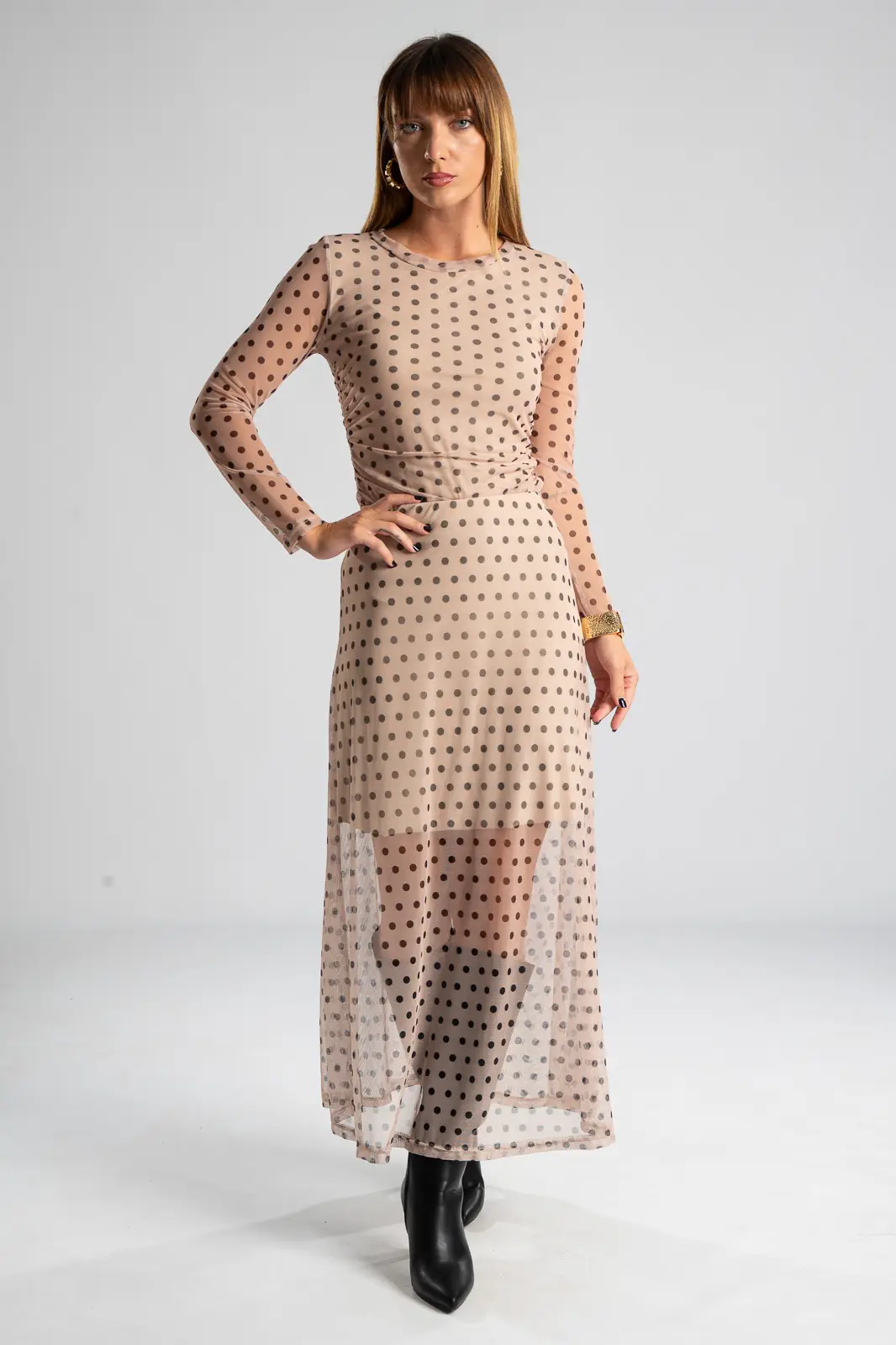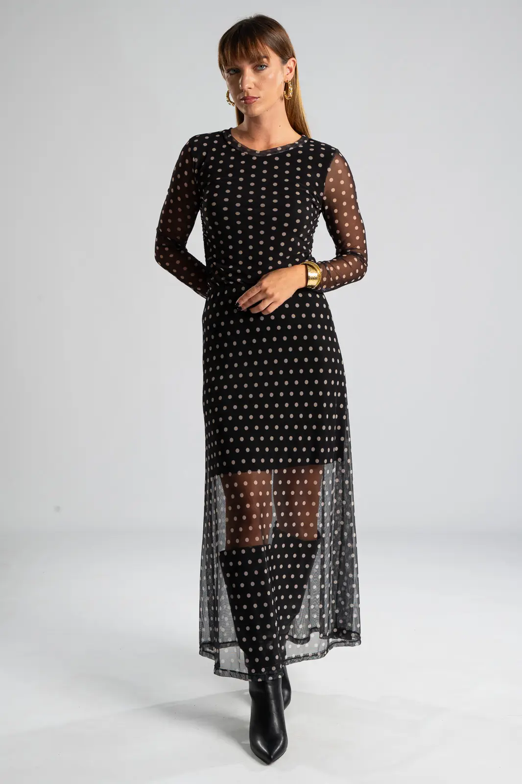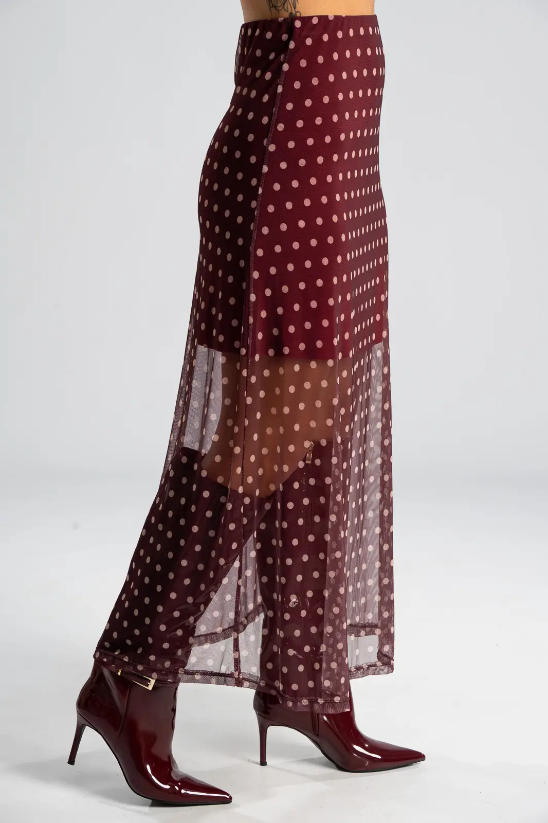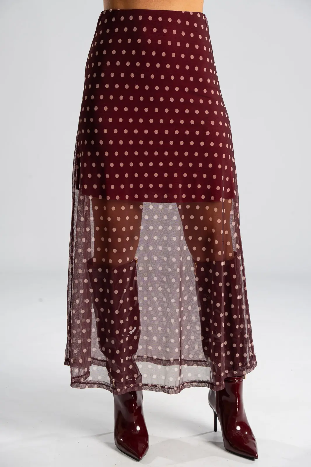 Φούστα τούλινη με λάστιχο περιμετρικά στη μέση για καλύτερη εφαρμογή. Είναι maxi και έχει Α γραμμή. Σε όλη την επιφάνεια της έχει πουά σχέδιο. Εσωτερικά είναι φοδραρισμένη μέχρι λίγο πάνω από το γόνατο. Οι μετρήσεις του πίνακα είναι αντιπροσωπευτικές για κάθε κωδικό. Φούστα: 100% polyester. Φόδρα: 95% viscose, 5% elastan.