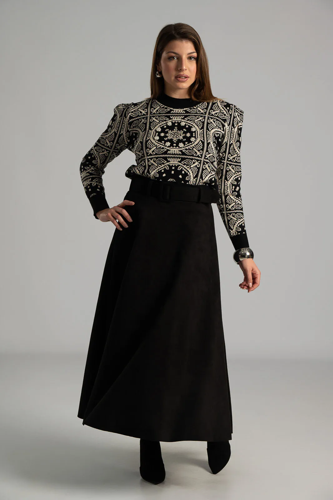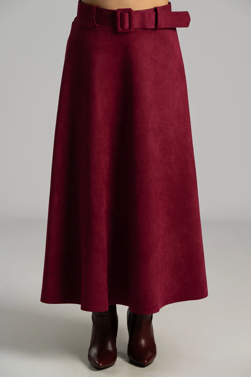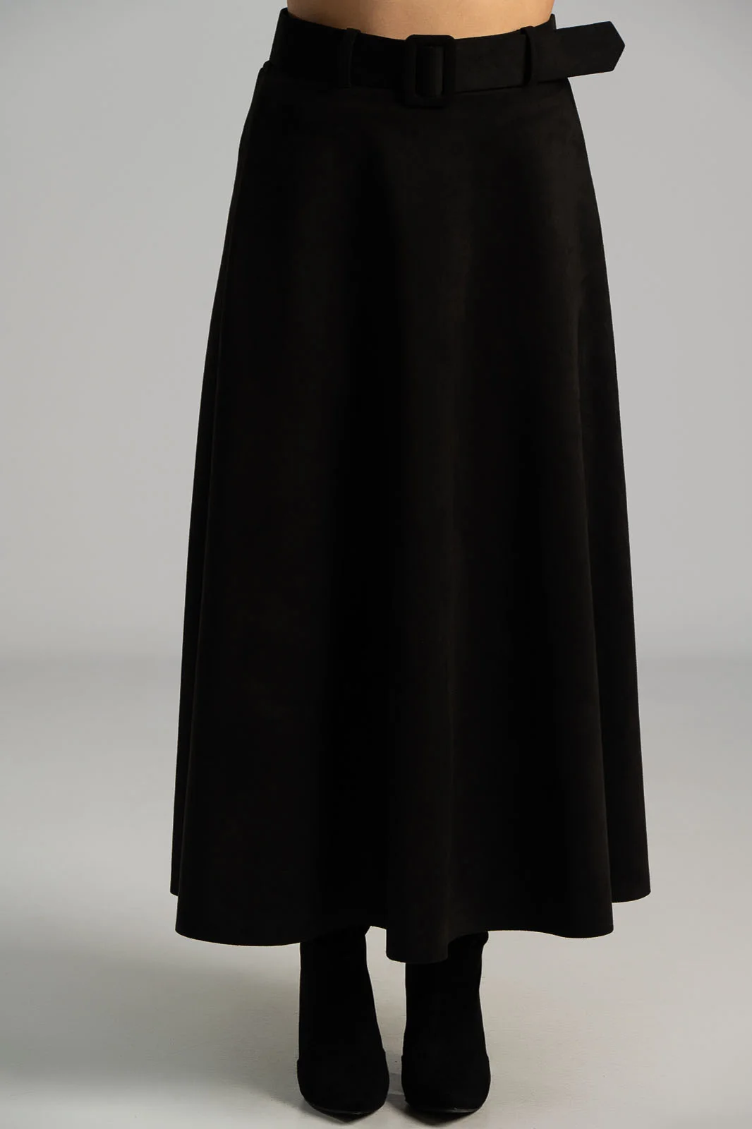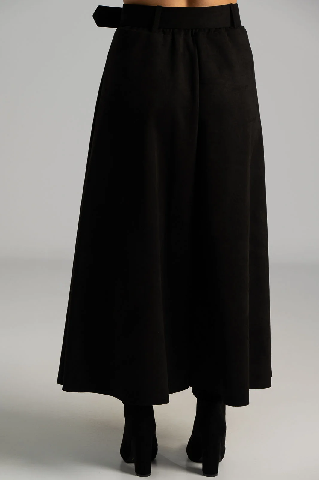 Φούστα σουέτ midi σε γραμμή Α. Διαθέτει στο πίσω μέρος της μέσης λάστιχο. Έχει δική της ζώνη στην ίδια απόχρωση και υφή. Οι μετρήσεις του πίνακα είναι αντιπροσωπευτικές για κάθε κωδικό. 95% polyester, 5% elastan.