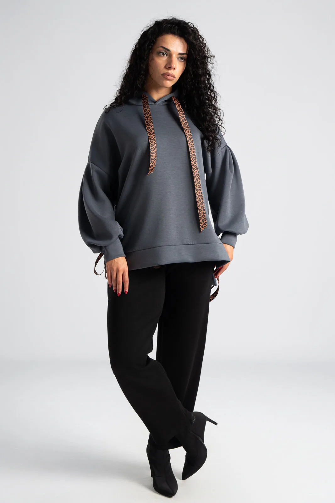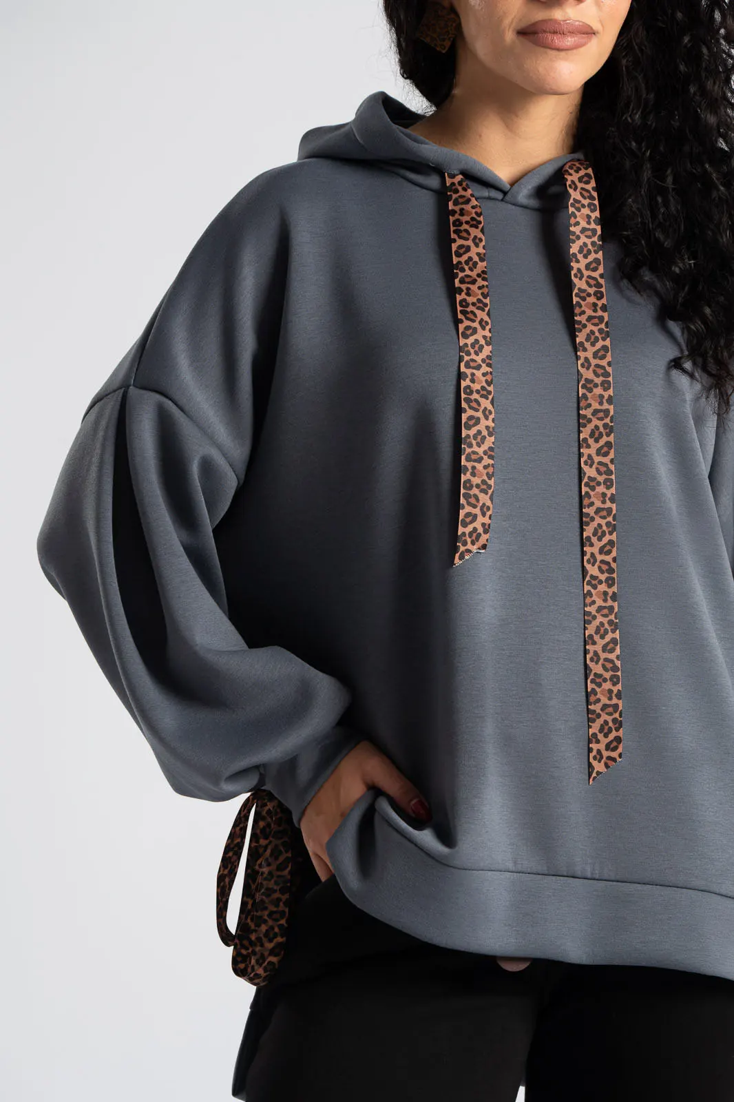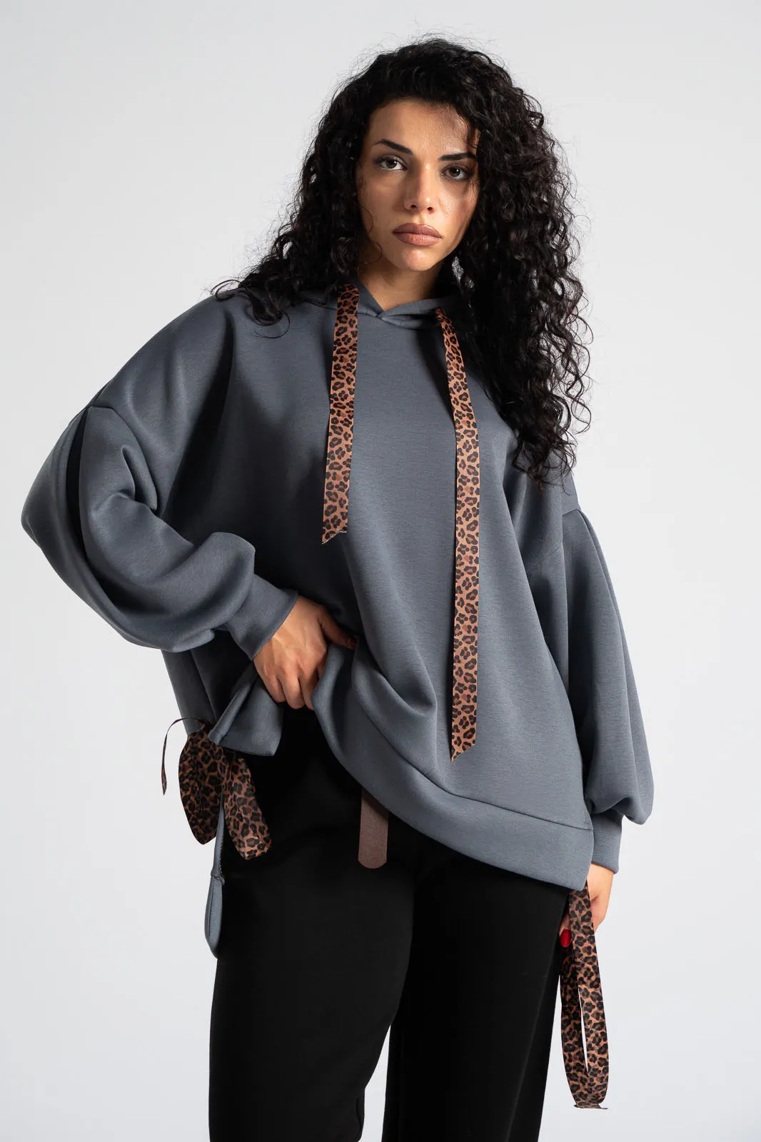Φούτερ με κουκούλα με leopard κορδέλα. Έχει μακριά μανίκια και στα πλαϊνά διαθέτει άνοιγμα στο πλάι. Το πίσω μέρος είναι ελαφρώς πιο μακρύ. Στα πλαϊνά είναι διακοσμημένο με λεπτομέρειες από κορδέλα ίδιου χρώματος. Το ύφασμα του είναι μαλακό. Οι μετρήσεις του πίνακα είναι αντιπροσωπευτικές για κάθε κωδικό. 55% polyester, 39% viscose,6% elastan.