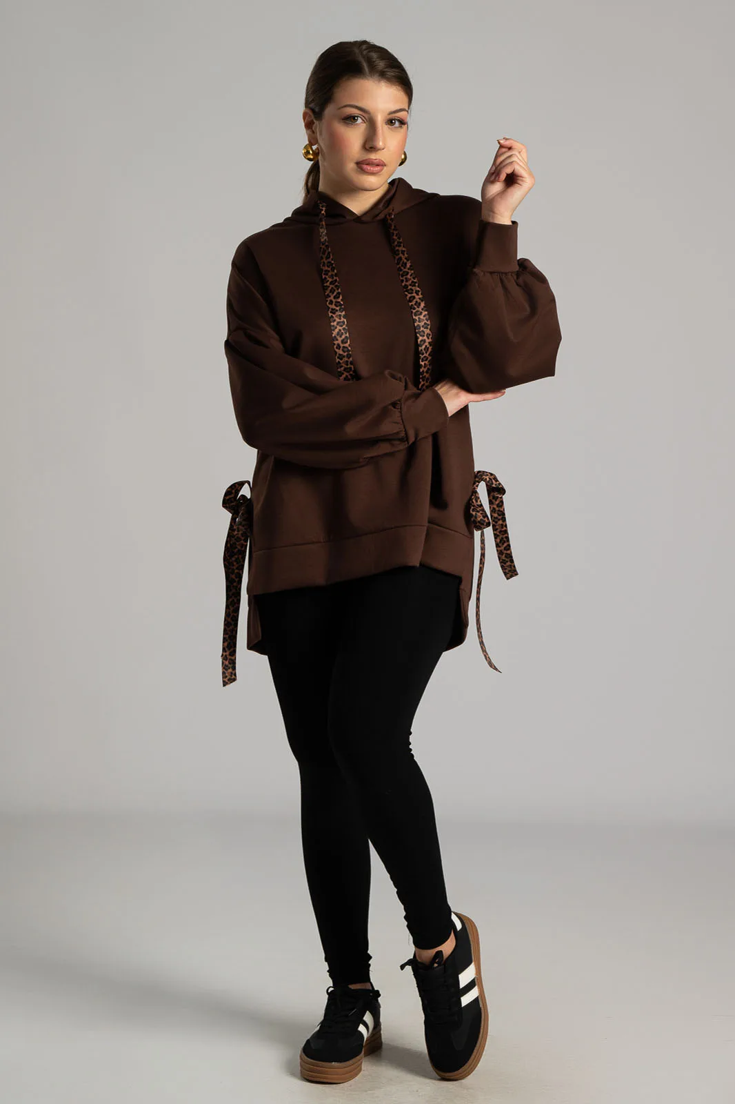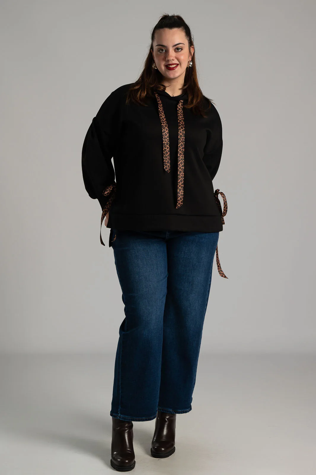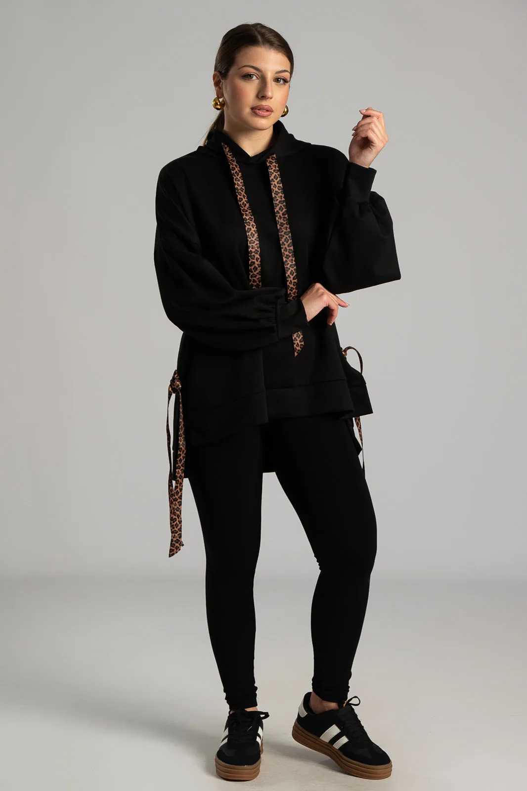 Hoodie with leopard ribbon. It has long sleeves and side slits. The back is slightly longer. The sides are decorated with ribbon details in the same color. The fabric is soft. The measurements in the table are representative for each code. 55% polyester, 39% viscose, 6% elastane.