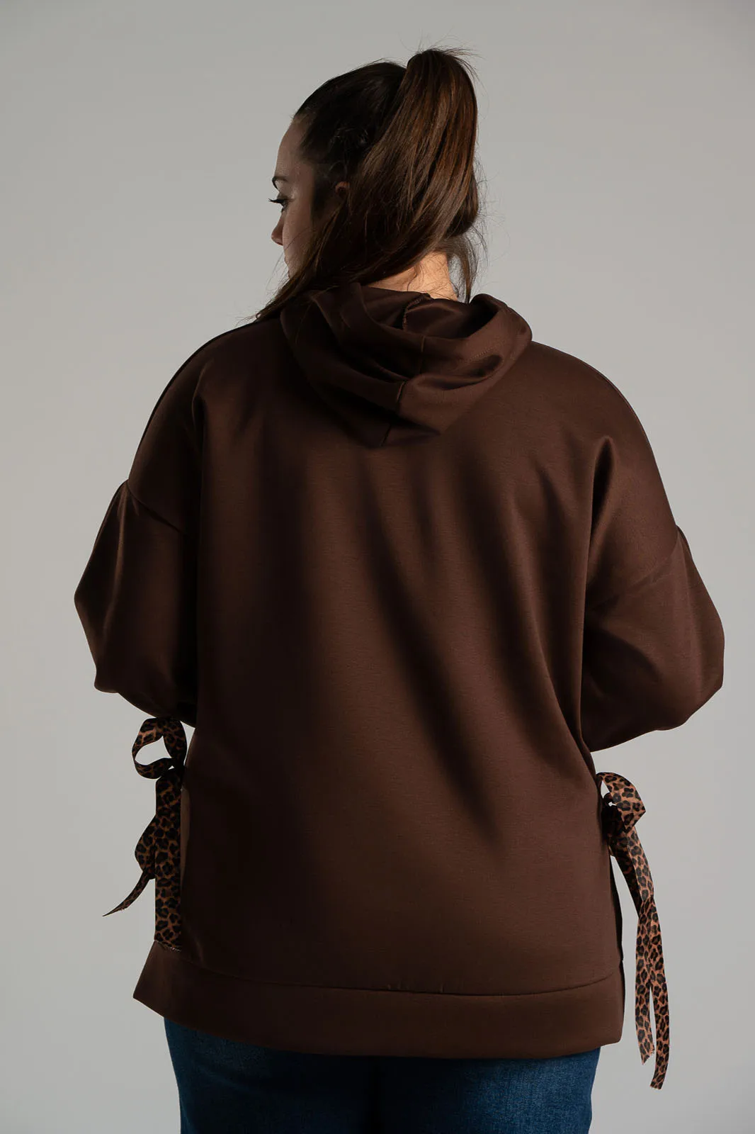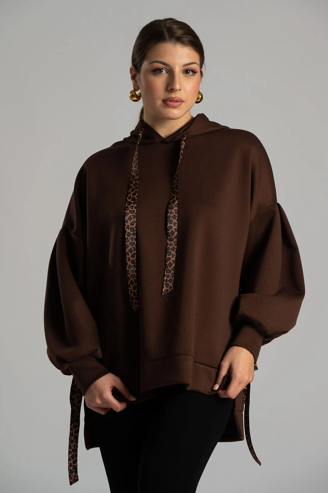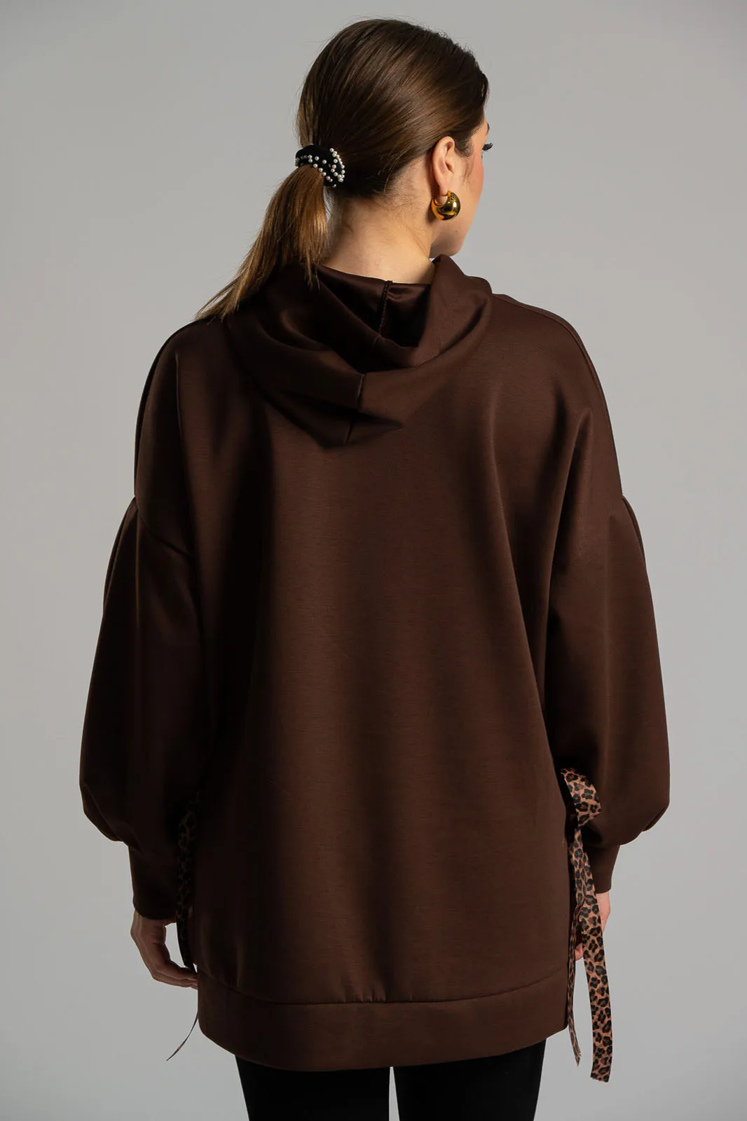 Hoodie with leopard ribbon. It has long sleeves and side slits. The back is slightly longer. The sides are decorated with ribbon details in the same color. The fabric is soft. The measurements in the table are representative for each code. 55% polyester, 39% viscose, 6% elastane.