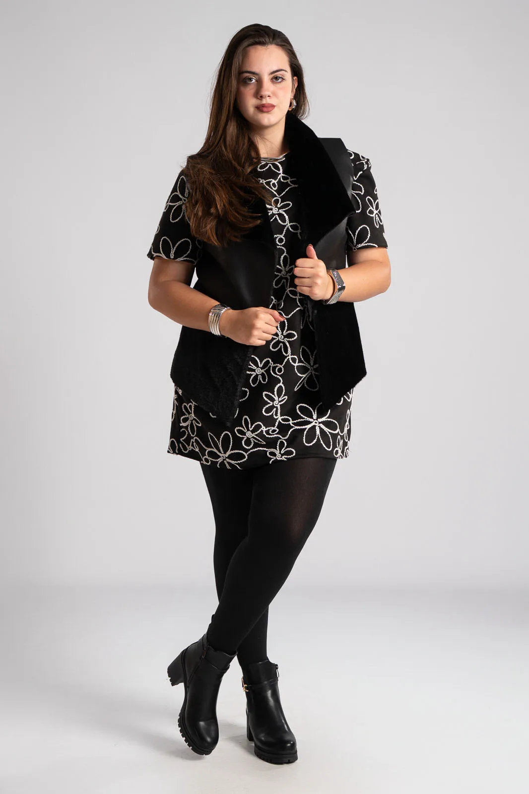 Vest made of soft synthetic fur on the collar and lapel and soft leatherette on the rest of the garment. No buttons. Measurements taken with one hand open. The measurements in the table are representative of each product. 95% polyester, 5% elastane.