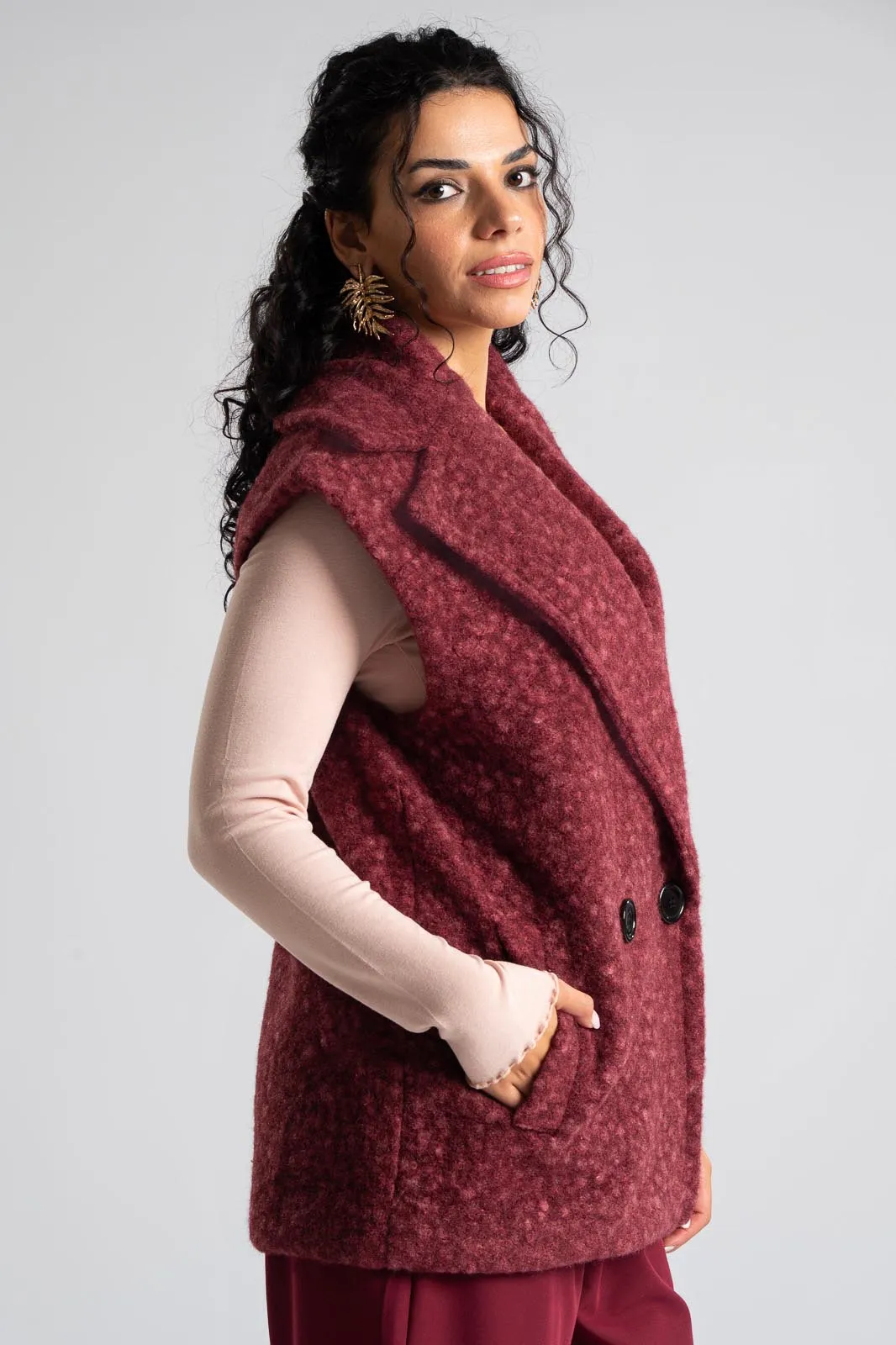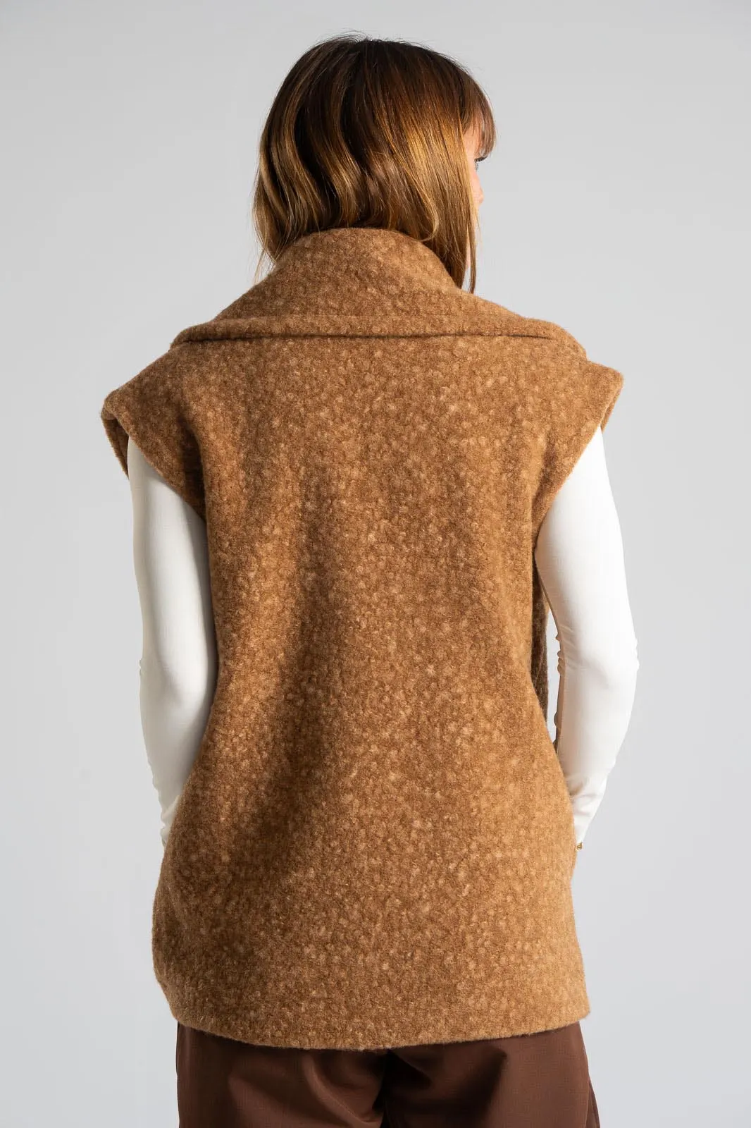 Sleeveless vest melange. It has a collar and lapels. It fastens with a button and has a decorative detail on the inside. It has side pockets. It has a fluffy texture all over. The measurements were taken with the buttons closed and it is lined on the inside. The measurements in the table are representative for each code. 100% polyester.