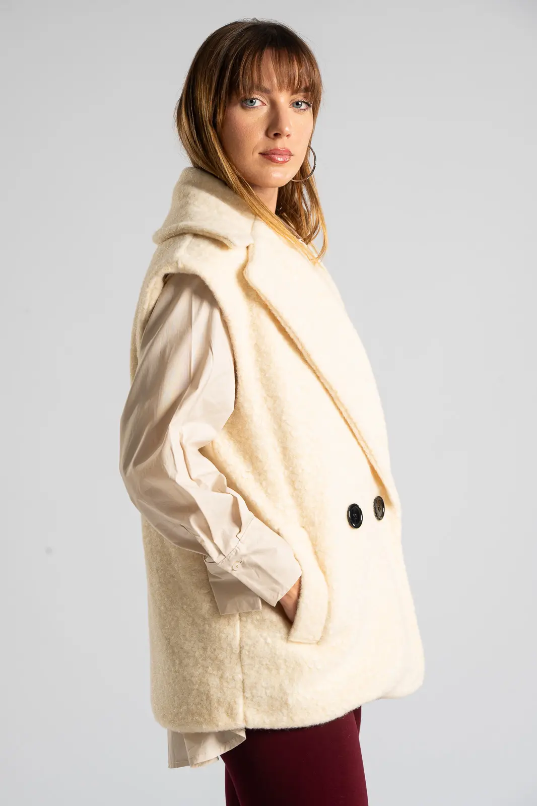 Sleeveless vest melange. It has a collar and lapels. It fastens with a button and has a decorative detail on the inside. It has side pockets. It has a fluffy texture all over. The measurements were taken with the buttons closed and it is lined on the inside. The measurements in the table are representative for each code. 100% polyester.